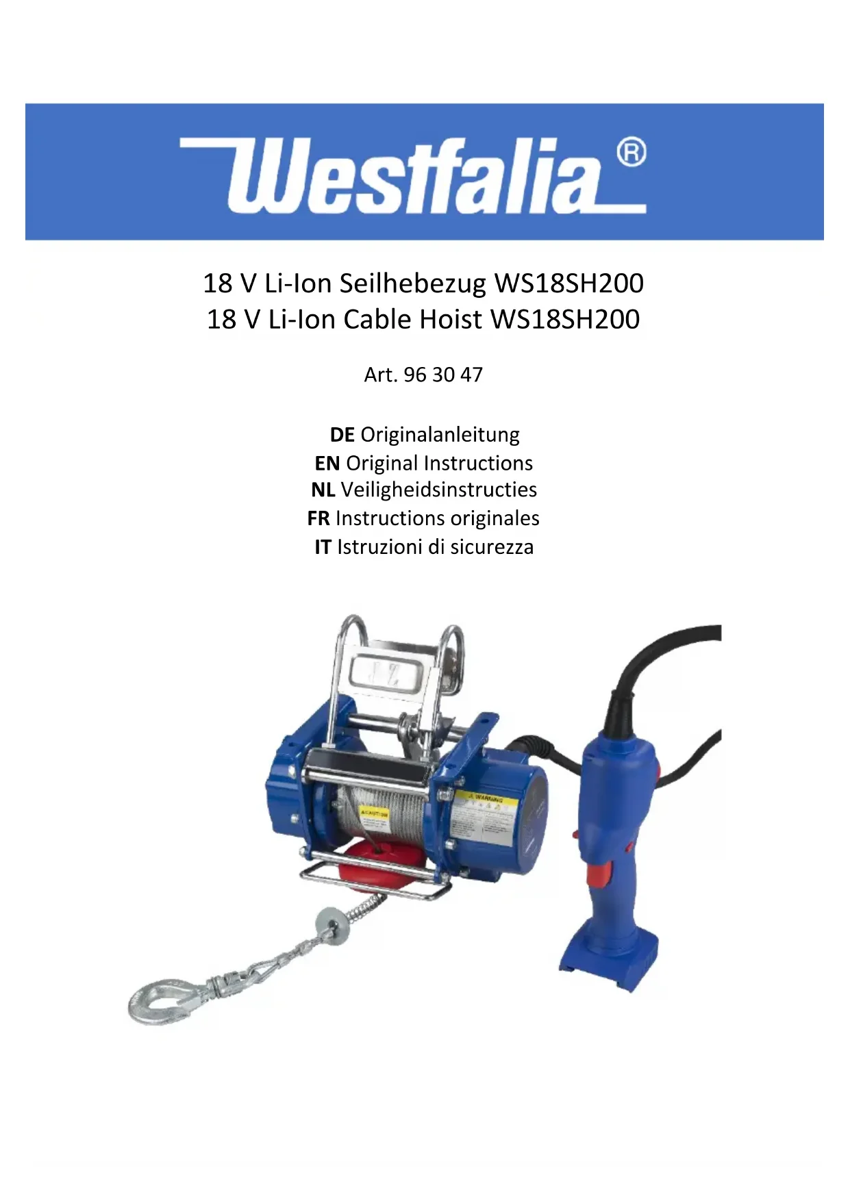 Batteries n'appartiennent pas à la poubelle. Vous pouvez le charger de nouveau à nous Envoyer ou livrer dans les magasins locaux ou des points de collecte des piles.22 Contrôle de la fonction de freinage Déballez le palan à câble et vérifiez que toutes les pièces ne présentent pas de dommages dus au transport. N'utilisez pas le palan à câble s'il est endommagé. Vérifiez la fonction de freinage en soulevant une charge sur une courte distance (env.