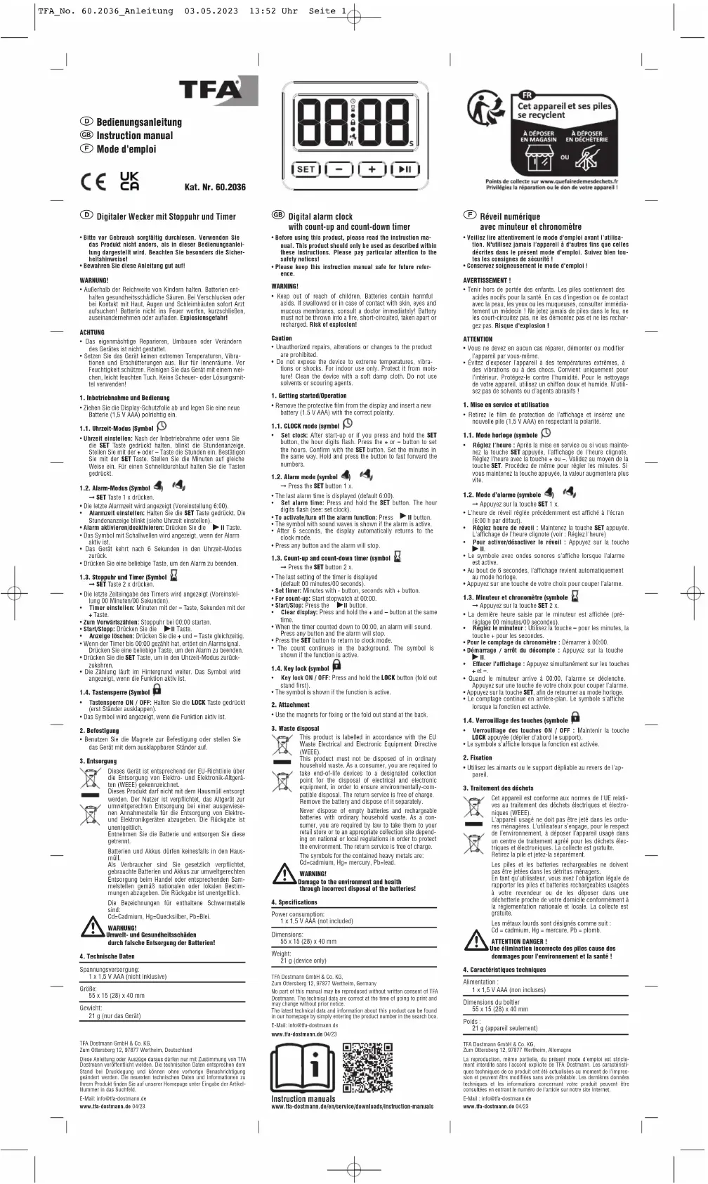 Retrouvez gratuitement la notice de l'appareil 60.2036.01 TFA au format PDF.