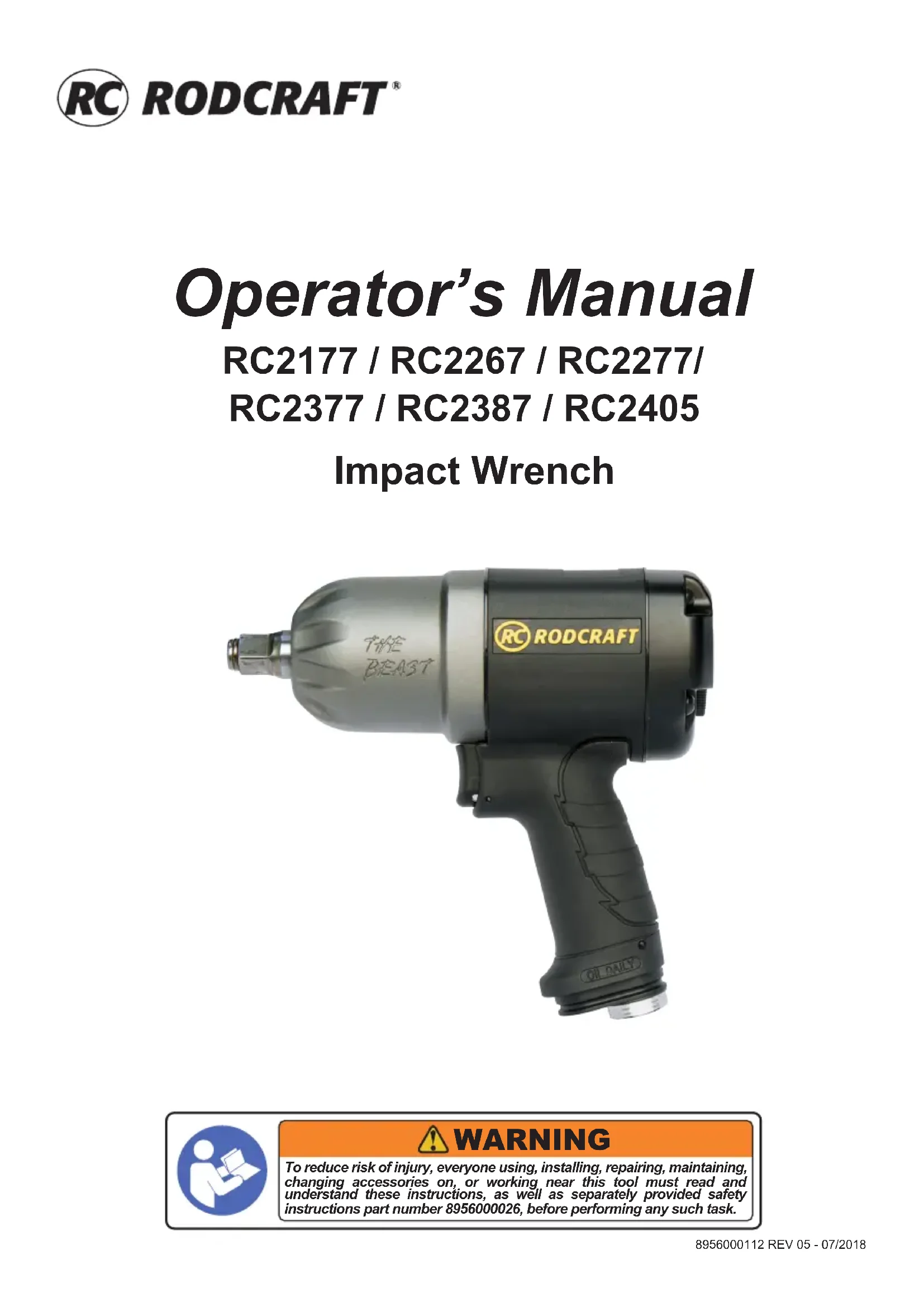 Nous : Rodcraft Customer Center Langemarckstr.35 bis 45141 Essen- GermanyType(s) de machine : Clé à chocs Déclarons que les produits : RC2177/RC2267/RC2277/RC2377/RC2387/RC2405 Numéro de série : 001 -999 Origine du produit : Taiwan est conforme aux exigences de la directive "Machines" du conseil concernant la législation des États membres 2006/42/EC (17/05/2006) Norme(s) harmonisée(s) applicable(s) : EN ISO 11148-6:2012Nom et fonction de l'émetteur : Pascal Roussy (R&D Manager)Lieu et date : Saint-Herblain, 05/07/2018 Dossier technique disponible auprès du siège social européen. Pascal Roussy R&D manager CP Technocenter 38, rue Bobby Sands - BP10273 44800 Saint Herblain - France Copyright 2018, Rodcraft Tous droits réservés. Toute utilisation ou reproduction non autorisée du contenu ou d’une partie du contenu est interdite. Cette restriction s’applique en particulier aux marques de commerce, dénominations de modèle, numéros de pièces et plans. N’utiliser que des piéces homologuées. Aucun dégât ou défaut de fonctionnement résultant de l’utilisation de pièces non homologuées n’est couvert par la garantie ou la responsabilité de produits.Instructions originales