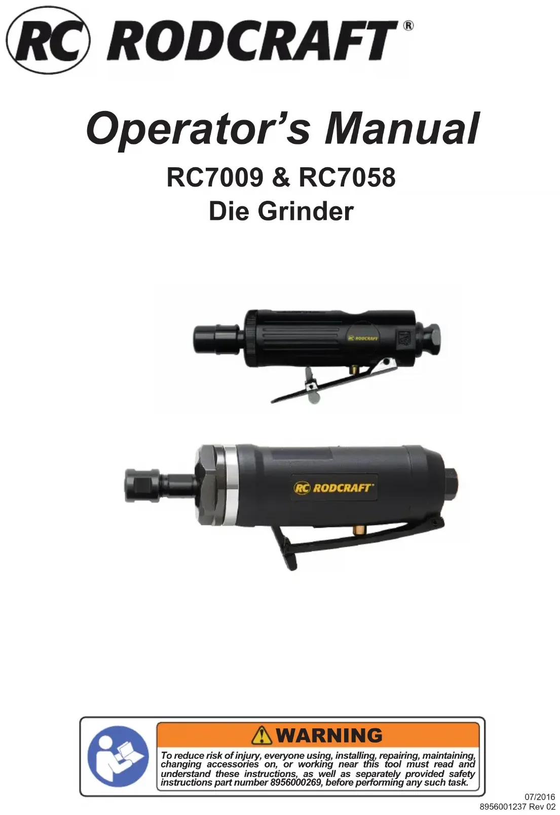 Nous : Rodcraft Customer Center - Langemarckstr.35 bis 45141 Essen- Germany Type(s) de machine: Meuleuses pneumatiques Déclarons que les produits: RC7009 & RC7058 Numéro de série: 001 - 999 Origine du produit : TAIWAN est conforme aux exigences de la directive "Machines" du conseil concernant la législation des États membres 2006/42/EC (17/05/2006) Norme(s) harmonisée(s) applicable(s) : EN ISO 11148-9:2012 Nom et fonction de l'émetteur : Pascal Roussy (R&D Manager)Lieu et date : Saint-Herblain, 17/05/2016 Dossier technique disponible auprès du siège social européen. Pascal Roussy R&D manager, CP Technocenter 38, rue Bobby Sands - BP10273 44800 Saint Herblain - France Copyright 2015, Rodcraft Tous droits réservés. Toute utilisation ou reproduction non autorisée du contenu ou d’une partie du contenu est interdite. Cette restriction s’applique en particulier aux marques de commerce, dénominations de modèle, numéros de pièces et plans. N’utiliser que des piéces homologuées. Aucun dégât ou défaut de fonctionnement résultant de l’utilisation de pièces non homologuées n’est couvert par la garantie ou la responsabilité de produits. Instructions originales