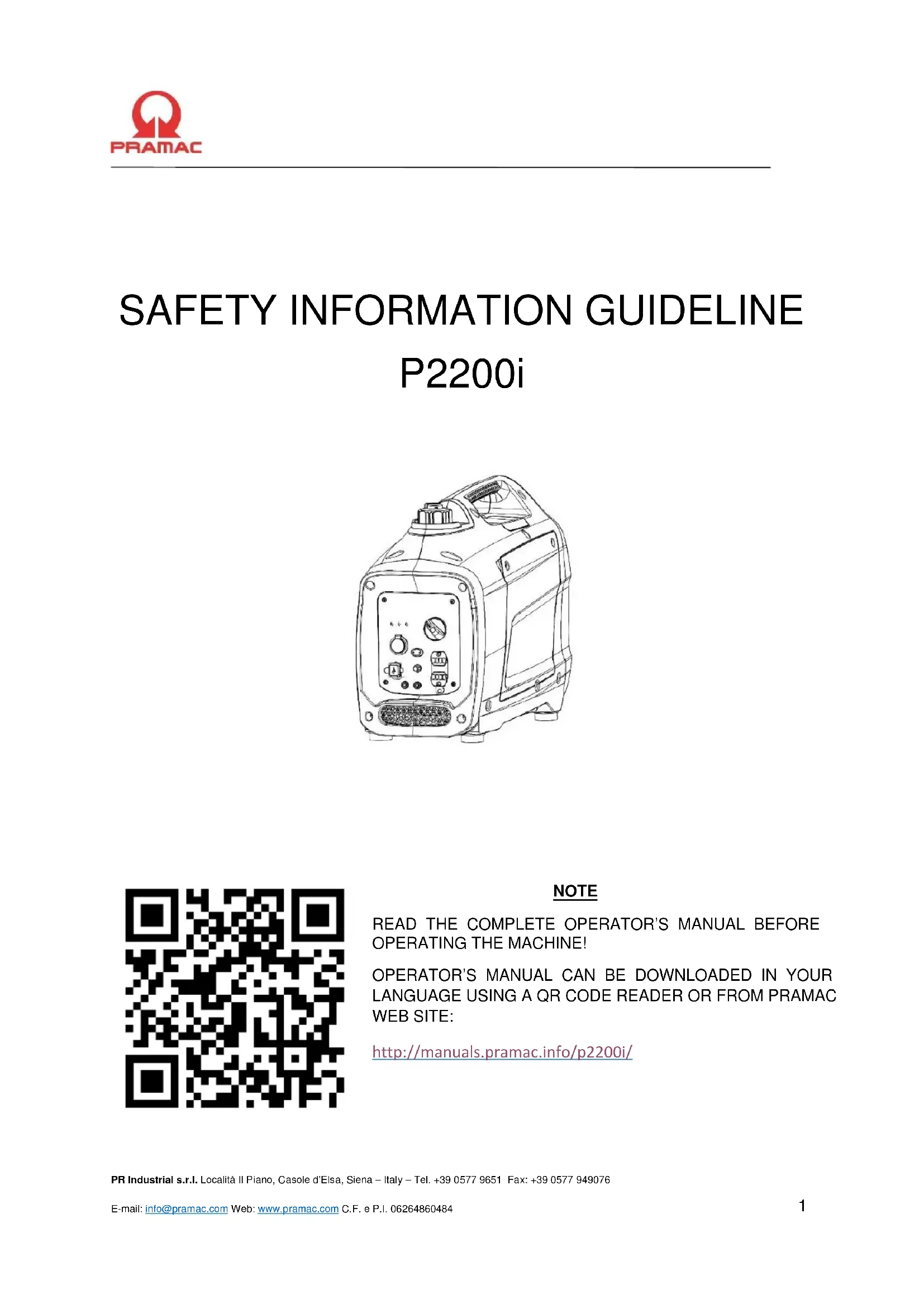 N'opérez pas la machine près d'étincelles ou flammes ouvertes. -Ne touchez pas le moteur ou le silencieux lorsque le moteur tourne ou peu après son arrêt. - N'opérez pas la machine avec un capuchon de carburant desserré ou manquant. -Ne démarrez pas le moteur si du carburant a été renversé ou si une odeur de gaz est présente. Éloignez la machine du carburant renversé et nettoyez le carburant avant le démarrage. Lors du ravitaillement de la machine ou lors de la maintenance: -Essuyez immédiatement tout carburant renversé. -Faites le plein dans une zone bien ventilée. - Refixez le capuchon du réservoir de carburant après le plein. -Ne fumez pas. -Ne faites pas le plein d'un moteur chaud ou en opération. -Ne faites pas le plein près d'étincelles ou flammes ouvertes.PR Industrial s.r.l. Località Il Piano, Casole d’Elsa, Siena – Italy – Tel. +39 0577 9651 Fax: +39 0577 949076 E-mail: info@pramac.com Web: www.pramac.com C.F. e P.I. 06264860484