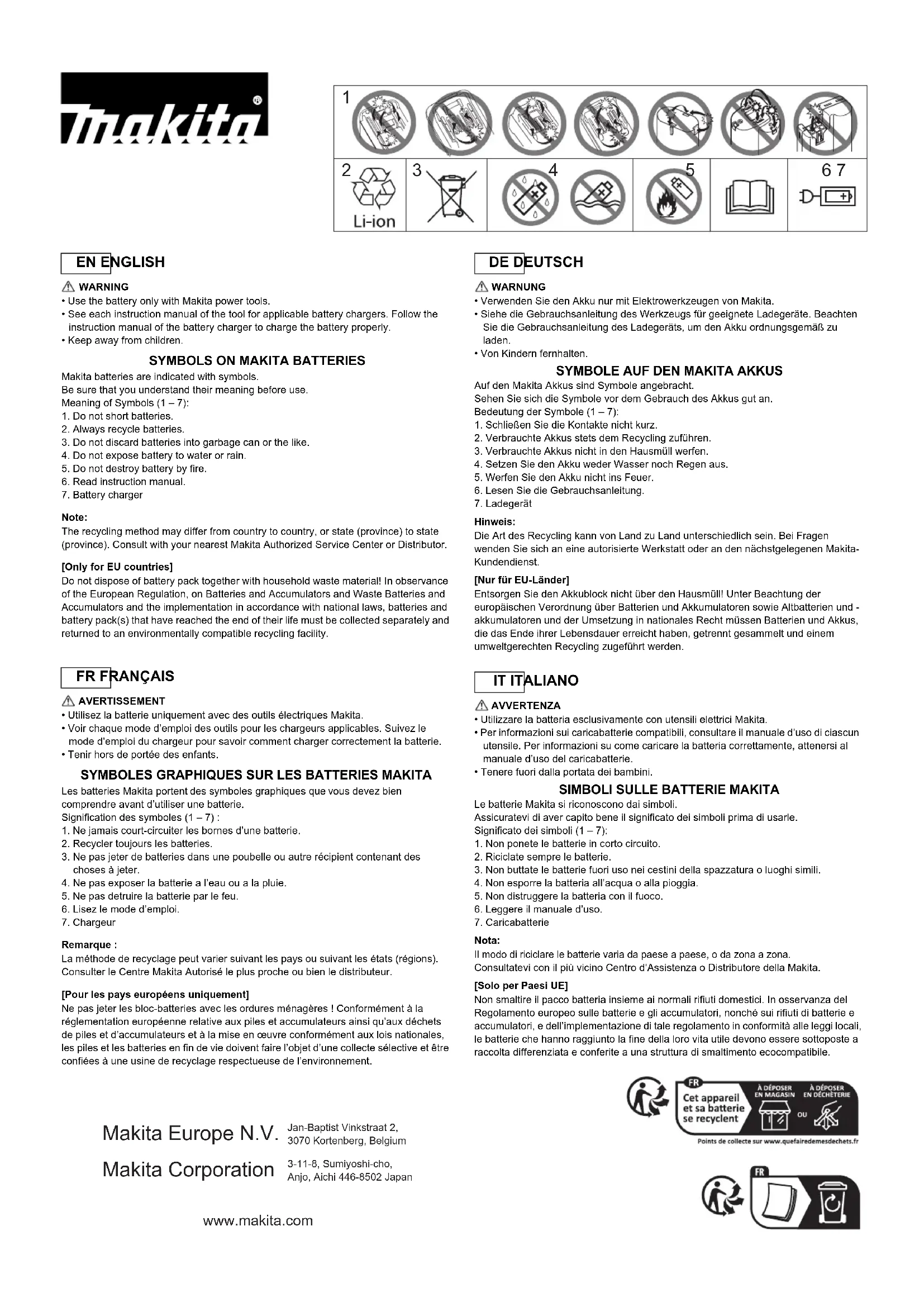 Les batteries Makita portent des symboles graphiques que vous devez bien comprendre avant d’utiliser une batterie.Signification des symboles (1 – 7) :1. Ne jamais court-circuiter les bornes d’une batterie.2. Recycler toujours les batteries.3. Ne pas jeter de batteries dans une poubelle ou autre récipient contenant des choses à jeter.4. Ne pas exposer la batterie a l’eau ou a la pluie.5. Ne pas detruire la batterie par le feu.6. Lisez le mode d’emploi.7. ChargeurRemarque :La méthode de recyclage peut varier suivant les pays ou suivant les états (régions). Consulter le Centre Makita Autorisé le plus proche ou bien le distributeur.[Pour les pays européens uniquement]Ne pas jeter les bloc-batteries avec les ordures ménagères ! Conformément à la réglementation européenne relative aux piles et accumulateurs ainsi qu’aux déchets de piles et d’accumulateurs et à la mise en œuvre conformément aux lois nationales, les piles et les batteries en fin de vie doivent faire l’objet d’une collecte sélective et être confiées à une usine de recyclage respectueuse de l’environnement. WARNUNG• Verwenden Sie den Akku nur mit Elektrowerkzeugen von Makita.• Siehe die Gebrauchsanleitung des Werkzeugs für geeignete Ladegeräte. Beachten Sie die Gebrauchsanleitung des Ladegeräts, um den Akku ordnungsgemäß zu laden.• Von Kindern fernhalten.