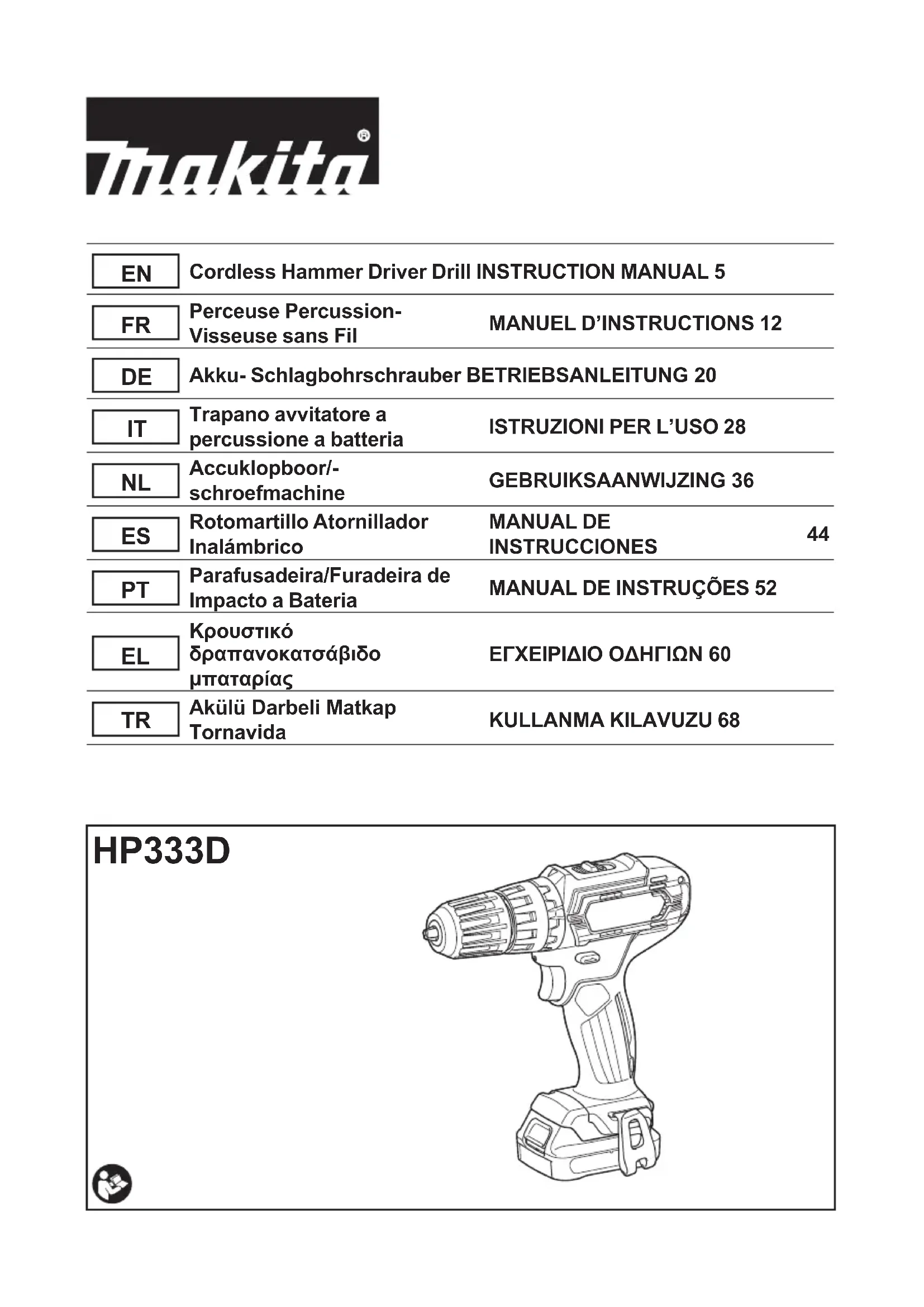 ce de suspension à des ns non prévues, par exemple, pour attacher l’outil sur un emplace- ment élevé.Lacontrainteexercéesurunorice lourdementchargépeutendommagerl’orice,cequi peutvousblesservousoudespersonnesautourou en dessous de vous. ►Fig.11: 1.Oricedesuspension Utilisezl’oricedesuspensionsituédanslapartie inférieurearrièredel’outilpouraccrocherl’outilau mur à l’aide d’un cordon de suspension ou de cordes similaires. UTILISATION ATTENTION : Insérez toujours la batterie à fond jusqu’à ce qu’elle se verrouille en place. Si le voyantrougesurledessusduboutonestvisible,cela signiequ’ellen’estpasbienverrouillée.Insérez-la complètementjusqu’àcequelevoyantrougenesoit plusvisible.Sinon,ellepourraittomberaccidentelle- mentdel’outil,aurisquedevousblesseroudebles- serquelqu’unsetrouvantprèsdevous. ATTENTION : Lorsque la vitesse diminue considérablement, réduisez la charge ou arrêtez l’outil pour éviter de l’abîmer. Tenez l’outil fermement en le saisissant d’une main par lapoignéeetdel’autreparledessousdelabatterie, anderésisteràlaforcedetorsion. ►Fig.12 Vissage ATTENTION : Mettez la bague de réglage sur un niveau de couple de serrage adapté au travail à eectuer. ATTENTION : Assurez-vous que l’embout de vissage est inséré bien droit dans la tête de vis, sinon vous risquerez d’abîmer la vis et/ou l’em- bout de vissage. Tournezd’abordlabaguedechangementdemode,de sortequelaèchesurl’outilpointesurlesymbole . Placezlapointedel’emboutdevissagedanslatêtede vis et appliquez une pression sur l’outil. Faites démarrer l’outil lentement, puis augmentez la vitesse graduel- lement.Relâchezlagâchettedèsquel’engrenage s’active. NOTE :Lorsquevousinsérezunevisàbois,percez d’abordunavant-troud’undiamètredu2/3decelui de la vis. Cela facilitera le vissage et évitera que la piècenesefende. Perçage avec percussion ATTENTION : Une très grande force de tor- sion s’exerce soudainement sur l’outil/foret lors- qu’il émerge sur la face opposée, lorsque le trou est bouché par des copeaux ou particules ou lors du contact avec des armatures dans le béton. Tournezd’abordlabaguedechangementdemode,de sortequelaèchesurl’outilpointesurlesymbole . Labaguederéglagepeutêtrealignéesurn’importe quel niveau de couple de serrage pour cette opération. Vousdevezutiliserunforetàpointedecarburede tungstène. Placezleforetàl’emplacementdésirépourpercerle trou, puis enclenchez la gâchette. Ne forcez pas l’outil.18 FRANÇAIS Vousobtiendrezdemeilleursrésultatsavecunelégère pression. Gardez l’outil en position et empêchez-le de glisser hors du trou. N’appliquez pas plus de pression lorsque le trou est bouchépardescopeauxouparticules.Laissezplutôt l’outil tourner au ralenti et retirez partiellement le foret dutrou.Enrépétantcetteopérationplusieursfois,le trousedéboucheraetvouspourrezreprendreleper- çage normalement. Poire souante Accessoire en option ►Fig.13: 1.Poiresouante Unefoisletroupercé,utilisezlapoiresouantepour enretirerlespoussières. Perçage Tournezd’abordlabaguederéglagedesortequela èchepointeversl’indication .Procédezensuite comme suit. Perçage dans le bois Lorsquevouspercezdanslebois,vousobtiendrezun résultatoptimalavecunforetàboiséquipéd’unevisde guidage. La vis de guidage facilite le perçage en entraî- nantleforetdanslapièce. Perçage dans le métal Pourqueleforetneglissepasquandvouscommencez à percer le trou, faites une entaille à l’aide d’un pointeau et d’un marteau à l’emplacement prévu pour le trou. Placezlapointeduforetdansl’entailleetcommencez à percer. Utilisezunlubriantdecoupepourpercerlesmétaux. Seuls le fer et le laiton doivent être percés à sec. ATTENTION : Une pression excessive sur l’outil n’accélèrera pas le perçage.Enfait,lapres- sionexcessiveabîmeralapointeduforet,provoquera unebaissederendementdel’outiletréduirasadurée de service. ATTENTION : Tenez l’outil fermement et redoublez d’attention lorsque le foret commence à sortir par la face opposée de la pièce.Unetrès grandeforces’exercesurl’outil/foretlorsquecelui-ci émerge sur la face opposée. ATTENTION : Un foret coincé peut être retiré en réglant simplement l’inverseur sur la rotation inverse pour faire marche arrière. L’outil peut tou- tefois faire brusquement marche arrière si vous ne le tenez pas fermement. ATTENTION : Immobilisez toujours les pièces à travailler dans un étau ou un dispositif de rete- nue similaire. ATTENTION : Si l’outil est utilisé de manière continue jusqu’à ce que la batterie se décharge, laissez-le reposer 15 minutes avant de poursuivre le travail avec une batterie fraîchement chargée. Utilisation de l’outil comme un tournevis à main ►Fig.14 Mettez l’outil hors tension. Déplacez le levier de l’inverseur sur la position neutre. Tournezlabaguedechangementdemode,desorte quelaèchepointesurlesymbole