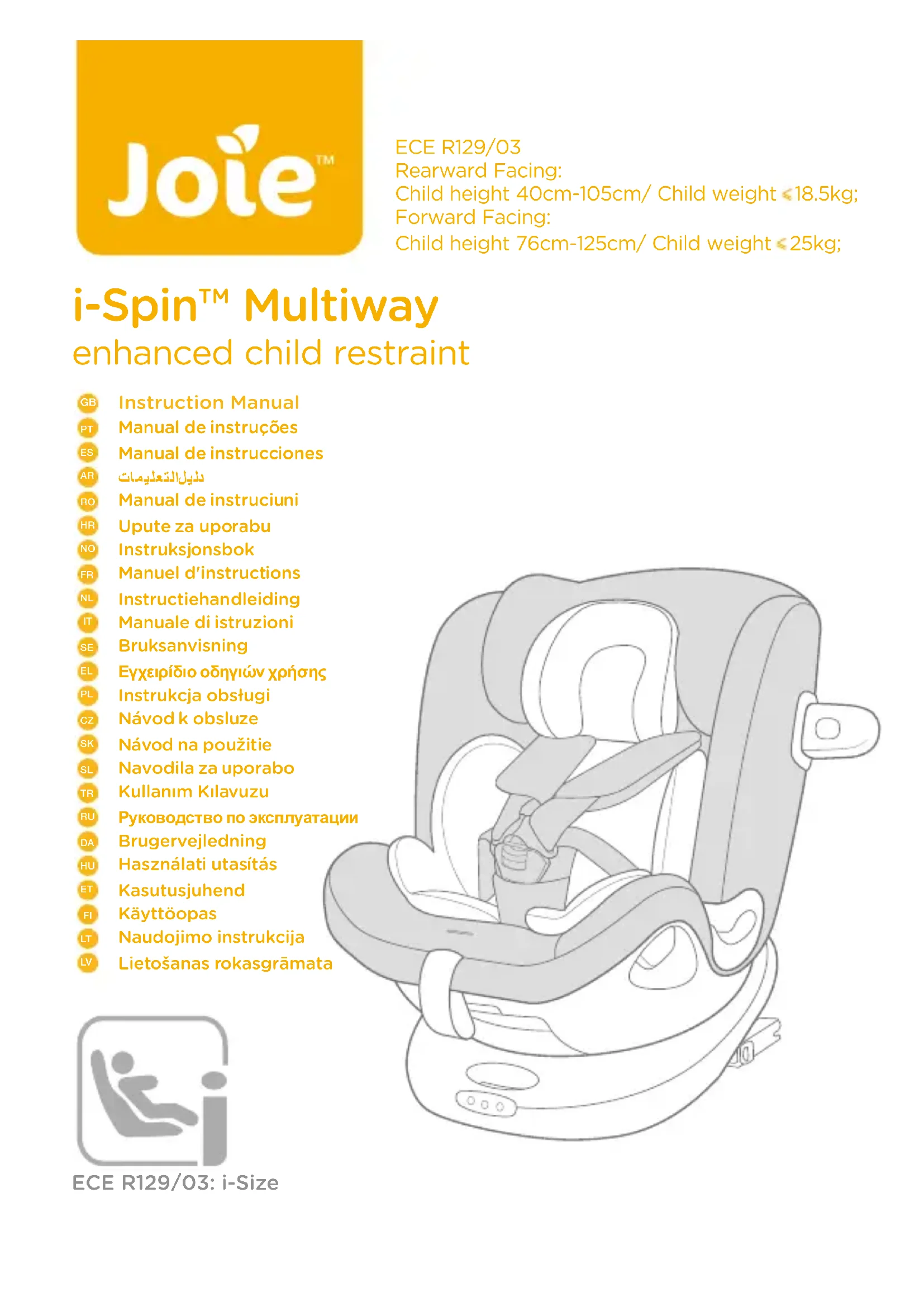 vous souhaite la bienvenue Nous vous félicitons d’avoir rejoint la famille Joie ! Nous sommes très heureux de pouvoir faire partie de votre voyage avec votre petit. En voyageant avec le dispositif de retenue pour enfants amélioré i-Spin Multiway, vous utilisez un dispositif de retenue pour enfants amélioré de haute qualité i-Size, à sécurité entièrement certifiée. Veuillez lire ce manuel et suivre chaque étape pour assurer le confort et la meilleure protection possible pour votre enfant.Pour utiliser ce dispositif de retenue pour enfants amélioré Joie avec les connexions i-Size ISOFIX conformément à la réglementation ECE R129, votre enfant doit correspondre aux conditions suivantes.Face à l'arrière : Taille de l'enfant entre 40 cm et 105 cm/Max. 18,5kg ;Face à l’avant : Taille de l’enfant 76cm-125cm / Max. 25kg ; Base Veuillez lire toutes les instructions de ce manuel avant d'installer et d'utiliser le produit.! IMPORTANT : À CONSERVER POUR TOUTE CONSULTATION ULTÉRIEURE.À LIRE ATTENTIVEMENT.Veuillez conserver le manuel d'instructions dans le compartiment de rangement à l'arrière du siège, comme sur l'illustration à droite.Pour des informations sur la garantie, veuillez visiter notre site Web sur joiebaby.com Liste des pièces 1 Support de tête 2 Housse du siège 3 Boucle 4 Bouton de réglage du harnais 5 Sangle de réglage 6 Bouton de réglage de l'inclinaison 7 Bouton de réglage ISOFIX 8 Affichage électronique LED 9 Bouton de rotation10 Guidage pour ceinture abdominale11 Sangles pour épaules12 Insert pour bébé13 Levier de réglage du support de tête14 Sangle d’attache supérieure15 Sac de rangement d’attache supérieure16 Connecteur d’attache ISOFIX17 Guides d’attache ISOFIX 18 Boîtier de la batterie19 Protection contre les chocs latérauxVeuillez vous assurer qu’il n’y a pas de pièces manquantes. Contactez le revendeur en cas de pièces manquantes.