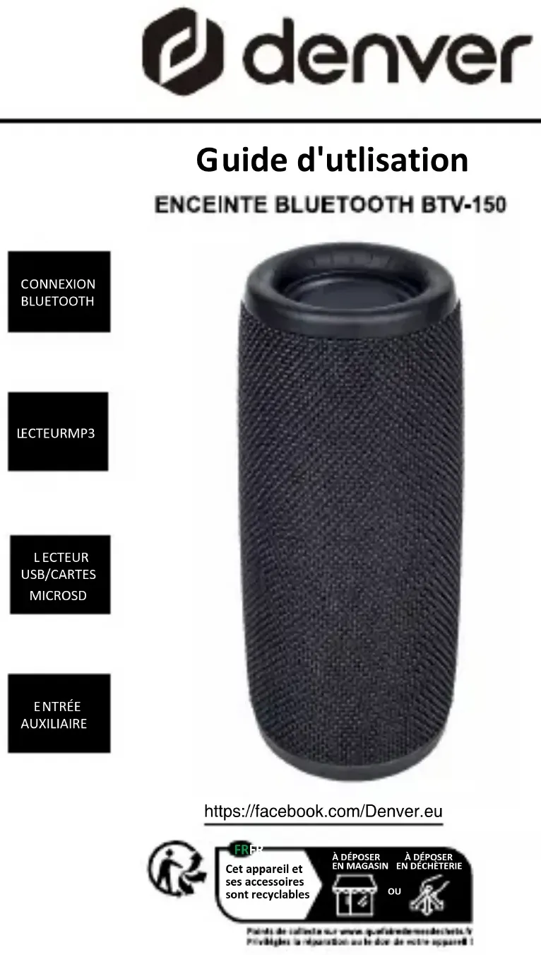 Puissance en sortie:............................... Plage de fréquence Bluetooth:............... Plage de fréquence de fonctionnement:. Puissance de sortie maximale:............... Dimensions:............................................ Poids:...................................................... Lithium intégré : 3,7V, 1 200 mAh 5 V 1 A 2402~2480 MHz 20 Hz - 20 KHz 70 x 70 x 172 mm 405 g 2x50W, (2x5W RMS) 5Remarque - Tous les produits sont susceptibles d’être modifiés sans préavis. Ce document est établi sous toute réserve d’erreur et d’omission. TOUS DROITS RÉSERVÉS, COPYRIGHT DENVERA/S Les équipements électriques et électroniques et les piles ou batteries qu’ils renferment contiennent des matériaux, composants et substances qui peuvent nuire à votre santé et à l’environnement si ces déchets (appareils électriques et électroniques ainsi que piles et batteries) ne sont pas traités de façon appropriée. Les équipements électriques et électroniques, ainsi que les piles et batteries, sont marqués du symbole d’une poubelle barrée, comme illustré ci-dessus. Ce symbole indique que les appareils électriques et électroniques et les piles et batteries doivent être triés et jetés séparément des ordures ménagères. En tant qu’utilisateur final, il est important que vous jetiez les piles et batteries usagées dans des centres de collecte appropriés. En mettant au 6rebut les piles et batteries afin qu’elles soient recyclées conformément à la réglementation, vous contribuez à préserver l’environnement. Toutes les municipalités disposent de points de collecte dans lesquels les appareils électriques et électroniques ainsi que les piles et batteries peuvent être déposés sans frais en vue de leur recyclage, ou offrent des services de ramassage des déchets. Vous pouvez obtenir des informations supplémentaires auprès des services de votre municipalité. Par la présente, Denver A/S déclare que l'équipement radioélectrique du type BTV-150 est conforme à la directive 2014/53/EU. Le texte intégral de la déclaration de conformité UE est disponible à l’adresse Internet suivante : denver.eu, et cliquez sur l’icône de recherche située en haut de la page. Numéro de modèle : BTV-150. Entrez dans la page produit, la directive RED se trouve dans Téléchargements/Autres téléchargements. Plage de fréquence de fonctionnement:20Hz-20KHz Puissance de sortie maximale: