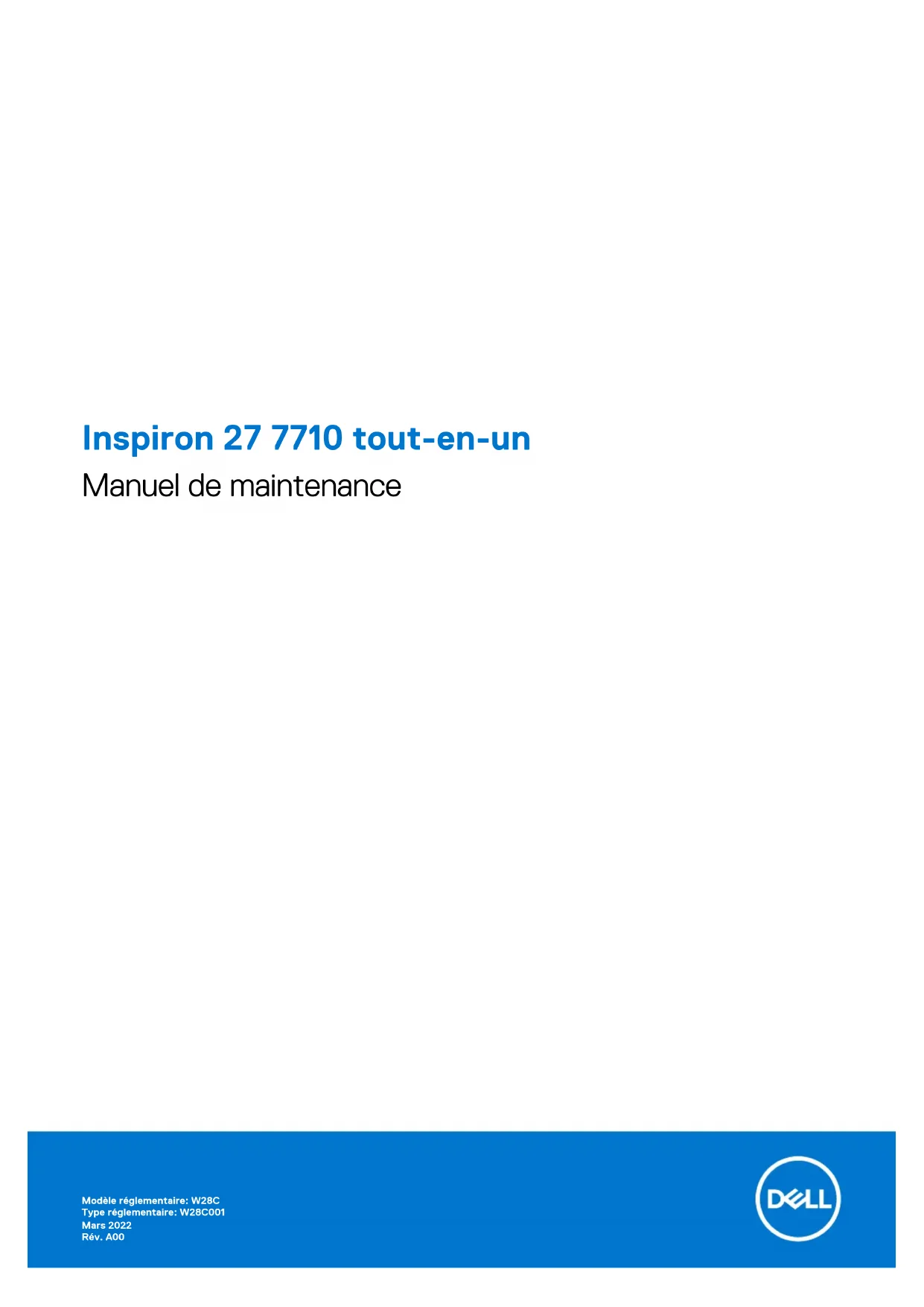 Inspiron 27 7710 tout-en-un Manuel de maintenance Modèle réglementaire: W28C Type réglementaire: W28C001 Mars 2022 Rév. A00Remarques, précautions et avertissements REMARQUE : Une REMARQUE indique des informations importantes qui peuvent vous aider à mieux utiliser votre produit. PRÉCAUTION : ATTENTION vous avertit d’un risque de dommage matériel ou de perte de données et vous indique comment éviter le problème.