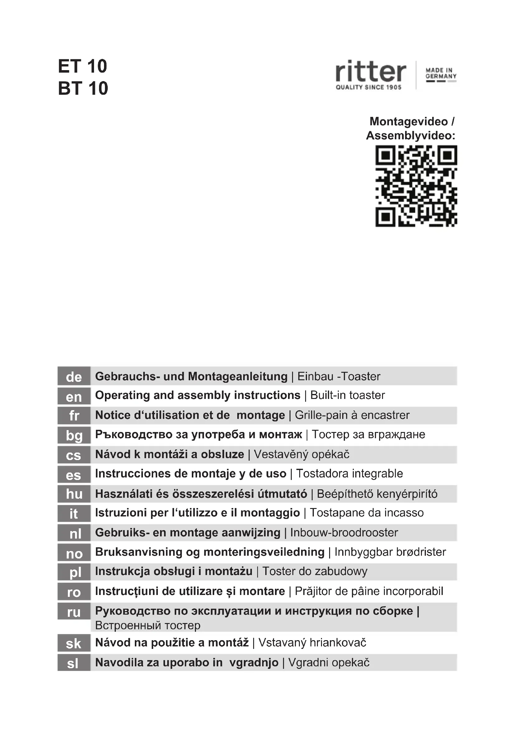 Pour éviter de se blesser ou d’endommager le grille-pain, respecter impérativement les instructions de sécurité énon- cées ci-après : – Utiliser le grille-pain unique- ment à des ns domestiques, et non industrielles. – Dans tous les cas, le mon- tage encastré (voir page 24 ou le code QR sur la page de titre) doit être eectué par du personnel qualié. ritterwerk n’est pas responsable des conséquences découlant d’un montage défectueux ou non conforme aux prescriptions. – N’utiliser l’appareil que lorsqu’il a été monté correctement. – Rabattre l’appareil après chaque utilisation et fermer le tiroir. – Utiliser exclusivement les accessoires fournis. – Le câble d’alimentation doit être acheminé de manière à ce que l’appareil puisse être com- plètement rabattu sans coincer le câble. Le câble d’alimenta- tion doit être acheminé directe- ment et librement du système d’encastrement vers la prise de courant qui doit être montée dans le meuble bas. – Ne pas plier le câble secteur. Ne pas enrouler le câble autour de l’appareil. – L’appareil peut être utilisé par des enfants dès 8 ans et par des personnes ayant des capacités physiques, sensorielles ou mentales réduites ou ne disposant pas de l’expérience et/ou des connaissances requises, à condition qu’elles soient sur- veillées ou qu’elles aient reçu des instructions sur l’utilisation et soient conscientes des dangers qui en résultent. – Les enfants ne doivent pas jouer avec l’appareil. – Les enfants de moins de 8 ans doivent être tenus à l’écart de l’appareil et du cordon d’alimentation. – Le nettoyage et la mainte- nance de l’appareil ne doivent pas être eectués par des enfants, à moins qu’ils aient plus de 8 ans et qu’ils soient sous surveillance. – L’appareil doit toujours être mis hors tension s’il n’est pas sous surveillance et avant d’être nettoyé. – Le grille-pain ne doit pas fonctionner par le biais d’une minuterie ou d’un système de télécommande. Français18 – Brancher le grille-pain uni- quement sur une source de tension alternative adéquate, conforme aux indications gu- rant sur la plaque signalétique. – Ne jamais laisser le grille-pain hors surveillance lorsqu’il est en service. Risque de décharge électrique – Débrancher toujours la che secteur de la prise de cou- rant en cas de panne, avant de nettoyer le grille-pain ou lorsqu’il n’est pas utilisé. Tirer sur la che et non sur le câble. – Ne pas plonger le grille-pain dans l’eau. Ne pas exposer le grille-pain à la pluie ou à d’autres sources d’humidité. Si le grille-pain devait toutefois tomber dans l’eau, débrancher tout d’abord la che secteur de la prise de courant, puis sortir l’appareil de l’eau. Faire ensuite vérier le grille-pain dans un centre de service après-vente agréé avant de le remettre en marche. – Ne jamais utiliser le grille-pain avec des mains humides. Ne pas l’employer lorsqu’il est humide ou mouillé, ou si vous vous trouvez sur un sol humide. Ne pas utiliser le grille-pain en plein air. – Cesser aussitôt d’utiliser l’appareil si certains de ses éléments sont endommagés et contacter le service après- vente ritter. – Si le câble secteur est endom- magé, il doit être remplacé par le fabricant, son service après-vente ou une personne disposant de la qualication requise, an d’exclure tout risque. – Lorsque l’appareil fonctionne, les ls de chauage sont alimentés avec la tension secteur. Ne jamais introduire en conséquence des objets métalliques dans le grille-pain. Français19 Risque de brûlure – Pendant le fonctionnement, la température des surfaces pouvant être touchées peut être très élevée. Laisser refroi- dir un peu en conséquence le grille-pain avant de le saisir p. ex. pour le nettoyer. – Le support viennoiserie peut devenir très chaud. Aussi, ne saisir le support viennoise- rie qu’au niveau du taquet à déplier pour le mettre en place ou l’abaisser. – Le pain grillé ou réchaué peut être très chaud. Retirer en conséquence les tranches ou les viennoiseries uniquement lorsqu’elles sont refroidies. Risque d’incendie Le pain peut prendre feu. Il est impossible d’exclure que le pain ou les viennoiseries ne s’enam- ment pas. Respecter en consé- quence les consignes suivantes : – Ne jamais faire fonctionner le grille-pain à proximité ou en dessous de matériaux inam- mables, comme des rideaux. – Ne jamais recouvrir la fente pendant que le grille-pain fonctionne. – Ne jamais griller des tranches de pain sèches comme des biscottes. – Ne pas griller de tranches de pain tartinées. – Ne jamais poser les viennoise- ries directement sur la fente. Toujours utiliser pour cela le support viennoiserie déplié. – Laisser refroidir le grille- pain après chaque utilisation pendant 30 secondes au minimum. – Vider après chaque utilisation du grille-pain le tiroir ramasse miettes. Français20 Déplier les graphiques qui se trouvent dans la partie avant et arrière au dos du manuel. Lire attentivement le mode d’emploi avant la mise en service de l’appareil. Conserver le mode d’emploi et le laisser avec l’appareil lorsque celui-ci est vendu. La dernière version du mode d’emploi est également dispo- nible sous www.ritterwerk.de. USAGE CONFORME Le grille-pain sert exclusive- ment à griller du pain de mie, du pain en tranche et des viennoiseries ; il est conçu pour un usage domestique dans des conditions normales. Le grille-pain est conçu pour le contact avec les denrées alimentaires. Une utilisation non conforme ou inadaptée peut être à l’origine de graves blessures ou endom- mager l’appareil. Les clauses de garantie et la responsabilité du fabricant n’ont plus cours de validité dans ce cas. DESCRIPTION FONCTIONNELLE Le grille-pain à encastrer ET 10/BT 10 peut être installé dans tout tiroir nor