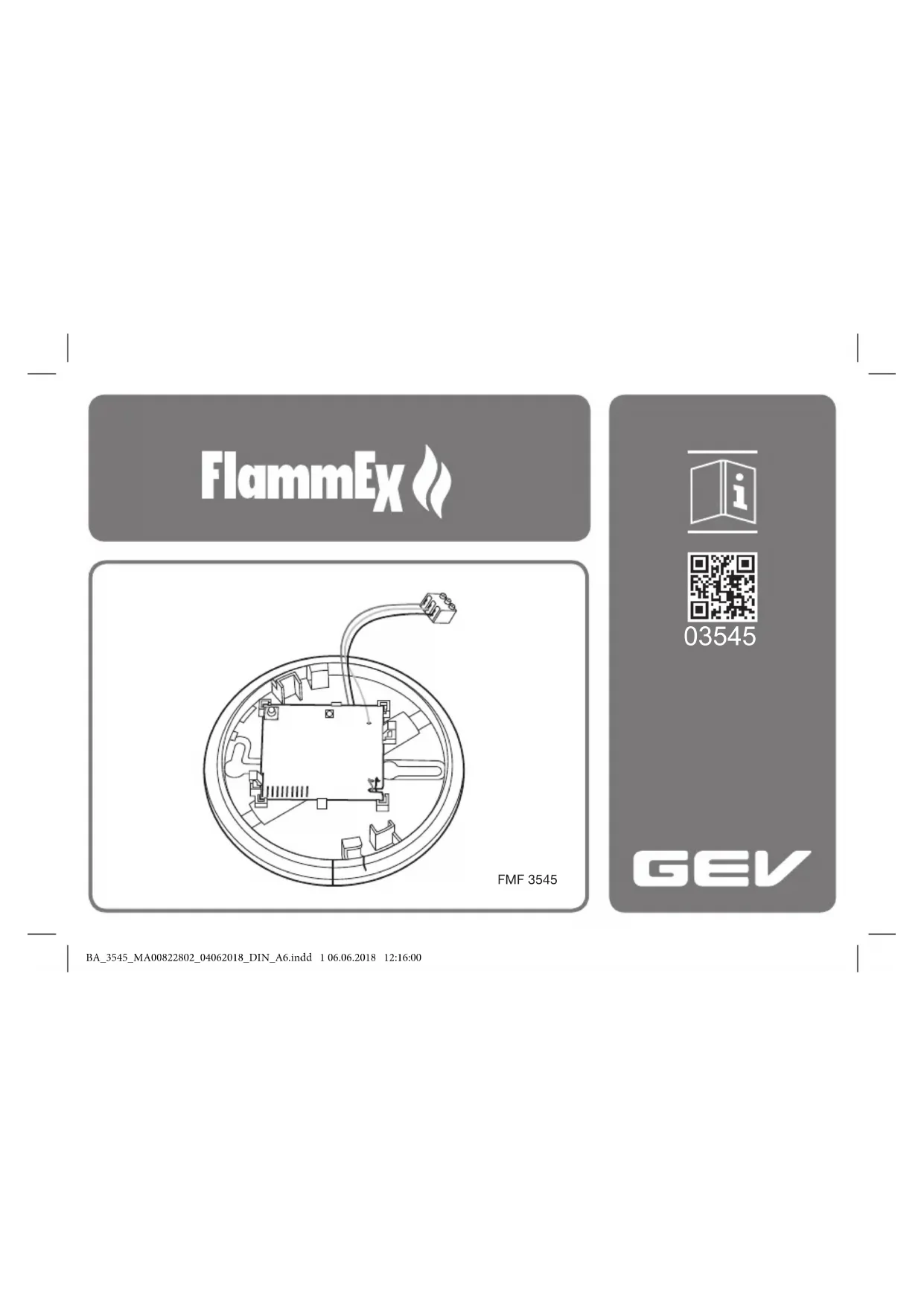 - Après l‘installation de tous les modules radio/dispositif d‘hôte, procédez à un test de fonctionnement. Appuyez sur la touche de test du détecteur de fumée jusqu‘à ce qu‘il par example émette trois signaux sonores ou provoquer une fausse alarme. Reportez-vous également au mode d‘emploi du dispositif d‘hôte. Les modules radio/ou les appareils équipé de celui-ci du même groupe émettent également un signal d‘alarme, puis retournent automatiquement en mode normal après quelques instants. Si un détecteur transmet un signal de sortie, il émet trois sons brefs pour le confirmer. Cf. chapitre Fonctionnement / Test. L’appareil est autorisé à la vente dans les pays de la Communauté Européenne. Par la présente, la Firme GEV GmbH déclare que le présent appareil (module émetteur-récepteur radio FMF 3545) est conforme aux exigences de base et autres prescriptions applicables de la Directive 1999/5/CE. La déclaration de conformité complète peut être obtenue sous les coordonnées suivantes : www.gev.de Recyclage : Cet appareil ne doit en aucun cas être jeté avec les déchets ménagers. Les propriétaires d‘équipements électriques ou électroniques usagés ont en eet l‘obligation légale de les déposer dans un centre de collecte sélective. Informez-vous sur les possibilités de recyclage auprès de votre municipalité. Caractéristiques techniques : Produit – FMF 3545 Fréquence – 868 MHz Tension d’alimentation – 9 V provenant du dispositif d‘hôte Température de fonctionnement – 0 à 40 °C Taux d‘humidité relative – 0 à 90 %, sans condensation Dimensions – Ø 106 mm, hauteur 12 mm Couleur – blanc Sous réserve de modifications techniques et esthétiques. BA_3545_MA00822802_04062018_DIN_A6.indd 15 06.06.2018 12:16:0316