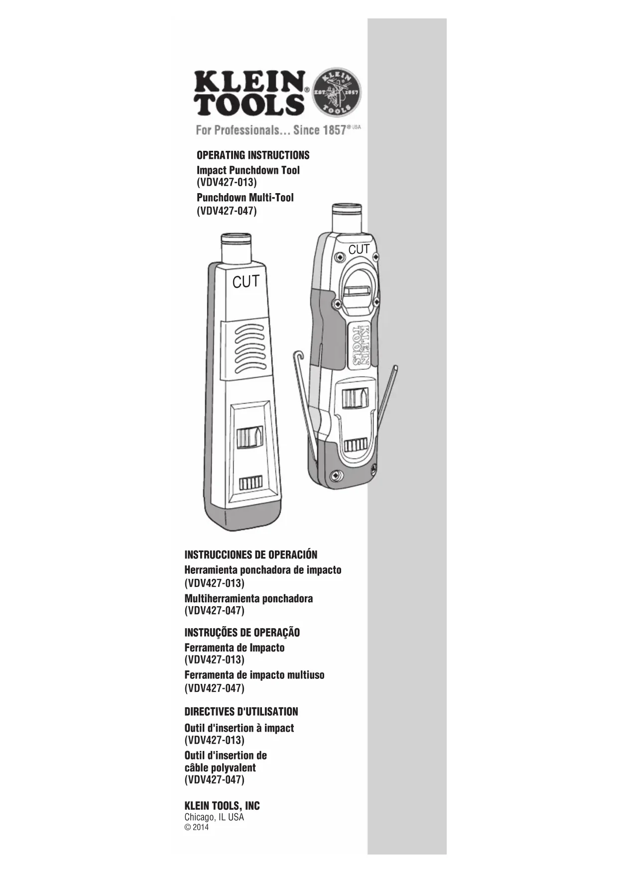 le connecteur autodénudant. Une utilisation appropriée de l'outil d'insertion devrait garantir que cette étape est exécutée correctement, mais il est toujours préférable de vérifier et defaire un essai.Réglage force d'impact66 - Panneau/Bloc/Borne110 - Panneaux interconnectés/Blocs d'interconnexion/Prises trapézoïdalesFaibleConducteurs de calibre 24 à 26TousFortConnecteurs de calibre 23 et plus grosNE PAS UTILISEROutils d'insertion et accessoiresOutil / Lame / (Acc.) Lame / Acc. No cat.Outil avec lame no cat.Châssis de l'outil d'insertion à impactS/O VDV427-013 et VDV427-047Lame 110 - Terminaison et coupe sur blocs 110VDV427-015VDV427-805Lame 66 - Terminaison et coupe sur blocs 66VDV427-016S/OLame combinée 66/110 pour coupe 66/110VDV427-017 VDV427-800 et VDV427-806Lame combinée 66/110 pour coupe 66/110 avec trousse WorkEndsTM VDV427-017 et VDV770-050 † VDV427-807DURABLADETMVDV427-104S/OTrousse WorkEndsTM: L'ensemble comprend l'adaptateur et 4embouts de tournevis (cruci-forme n°1 et n°2; plat3/16po et 1/4po).VDV770-050 † S/OINSTRUCCIONES DE OPERACIÓNHerramienta ponchadora de impacto (VDV427-013)Multiherramienta ponchadora (VDV427-047)INSTRUÇÕES DE OPERAÇÃOFerramenta de Impacto(VDV427-013)Ferramenta de impacto multiuso(VDV427-047)DIRECTIVES D'UTILISATIONOutil d'insertion à impact (VDV427-013)Outil d'insertion de câble polyvalent (VDV427-047) Dwg Name: 139425T Dwg No: 139425T ECO No: 017346 Pkg Dwg Ref: 1806 Rev: B Color Reference: N/A KLEIN TOOLS, INCChicago, IL USA© 2014 139425T.indd 1-5 7/17/14 2:00 PMOPERATING INSTRUCTIONSImpact Punchdown Tool (VDV427-013)Punchdown Multi-Tool (VDV427-047) CUT 110 TYPE PUNCHDOWN INSTRUCTIONS 1. Insert the 110 terminating blade into the punchdown tool.2. Choose the correct end of the blade depending whether or not the wire is to be cut off. (Figures 10 & 11 show use of the cutting end).3. Select the proper force setting – LO for all 110 type connections.4. Lay the wires in the wire slots (see below).5. Slide the blade into the wire slot and verify the orientation of the punchdown blade before moving to step 6 (Figure 10). (This is to avoid cutting wire unintentionally during the punchdown operation; refer to step 2.)6. Push down on the cushion-grip end of the punchdown tool with the palm of your hand until it clicks (Figure 11).7. Slide the blade out of the wire slot and make sure the wire is properly seated in the bottom of the wire slot between the insulation displacement connector’s (IDC) blades.8. Verify that the punchdown tool has seated the wire completely and correctly in the IDC. Proper use of the punchdown tool should ensure this is done correctly, but it is always a good idea to verify and test.Impact (force) Setting66 Panel/Block/Terminal110 Cross-connect Panels/Blocks/Keystones Jacks LOW 24-26 gauge conductors All 23 and larger gauge connectorsDO NOT USE