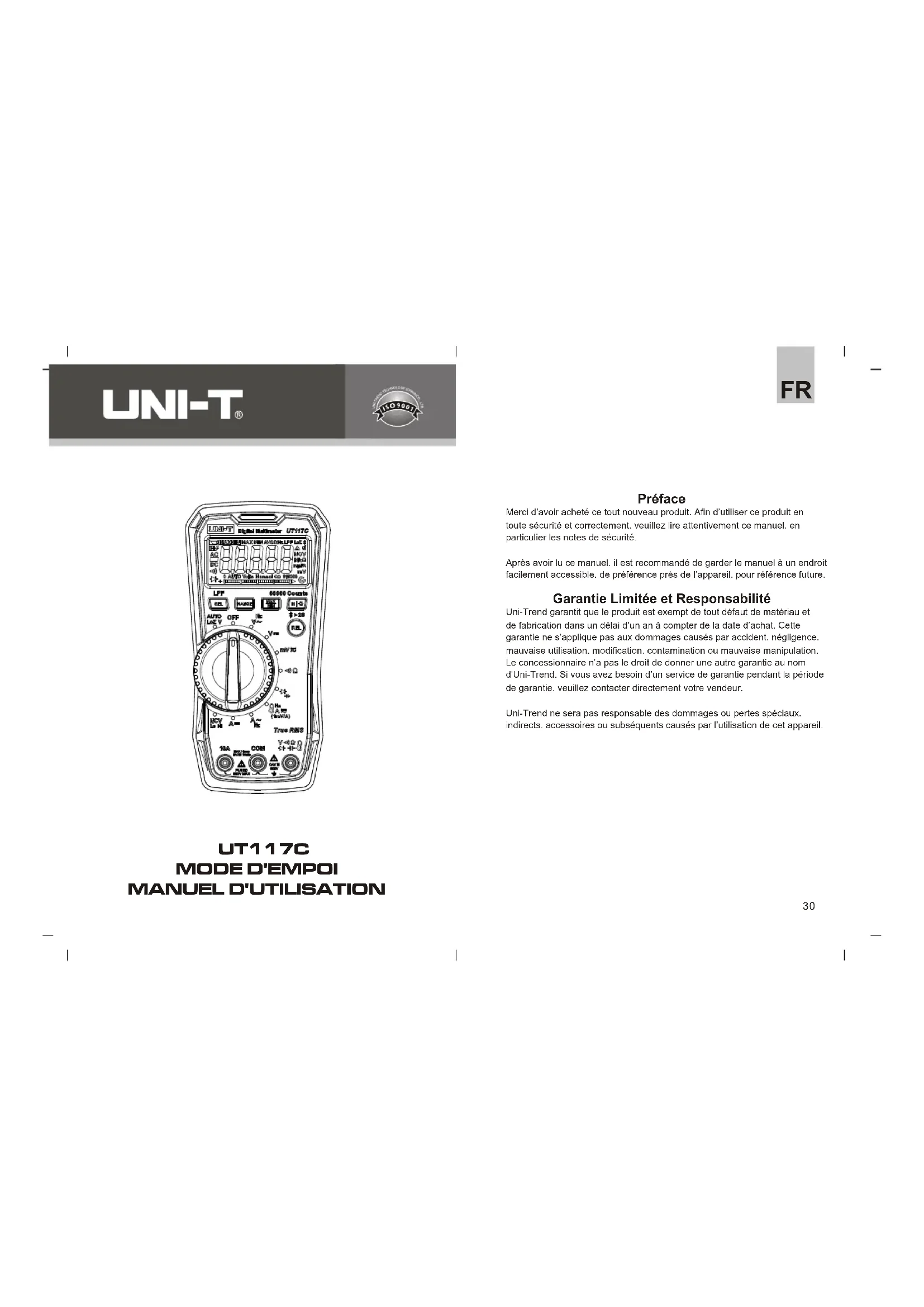 Préface Merci d’avoir acheté ce tout nouveau produit. Afin d’utiliser ce produit en toute sécurité et correctement. veuillez lire attentivement ce manuel. en particulier les notes de sécurité.Après avoir lu ce manuel. il est recommandé de garder le manuel à un endroit facilement accessible. de préférence près de l’appareil. pour référence future. Garantie Limitée et Responsabilité Uni-Trend garantit que le produit est exempt de tout défaut de matériau et de fabrication dans un délai d’un an à compter de la date d’achat. Cette garantie ne s’applique pas aux dommages causés par accident. négligence. mauvaise utilisation. modification. contamination ou mauvaise manipulation. Le concessionnaire n’a pas le droit de donner une autre garantie au nom d’Uni-Trend. Si vous avez besoin d’un service de garantie pendant la période de garantie. veuillez contacter directement votre vendeur.Uni-Trend ne sera pas responsable des dommages ou pertes spéciaux. indirects. accessoires ou subséquents causés par l’utilisation de cet appareil. UT117C MODE D'EMPOI