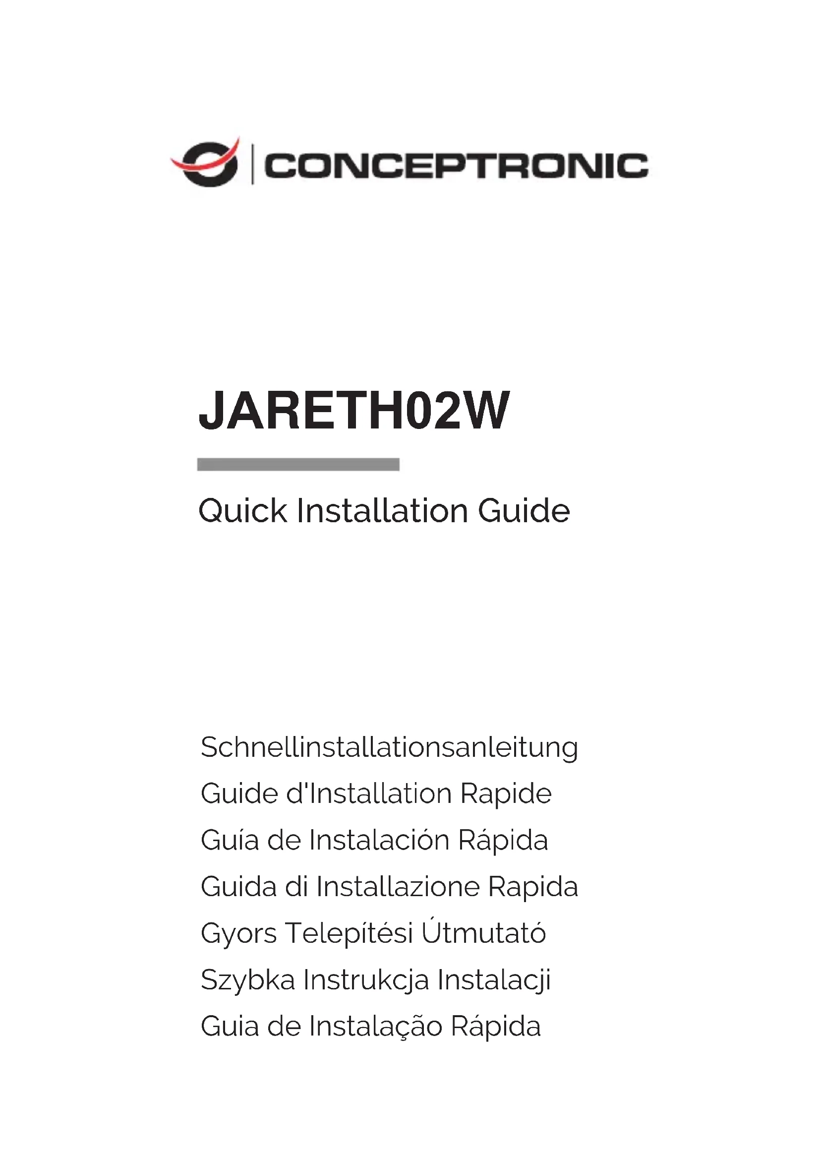 dispositivo” y elija el modelo de cámara. Hay varias formas de agregar un dispositivo: a) Buscar en la red LAN para agregarb) Escanear el código QR para agregar Verá el nombre de la conexión Wi-Fi. Escriba la contraseña Wi-Fi correcta y pulse “Siguiente”. La aplicación mostrará el código QR. Coloque el teléfono delante de la cámara (entre 7,6 y 20,3 cm) y, a continuación, pulse “Siguiente” si escucha “El código QR es correcto”. Una vez conectada, en la cámara pondrá “Wi-Fi conectado” y la luz azul parpadeará lentamente. Cuando la luz azul sea permanente, la aplicación cambiará a una página donde podrá cambiar el nombre de la cámara. Puede ver el vídeo después de agregar correctamente la cámara.Français Nous vous félicitons d'avoir acheté le JARETH02W de Conceptronic. En cas de problèmes, nous vous recommandons de vous adresser à notre service technique (rendez-vous sur www.conceptronic.net et cliquez sur « support »). Si vous avez d'autres questions concernant votre produit et que vous ne trouvez pas de réponse sur notre site web, contactez-nous par e-mail : support@conceptronic.net. Pour obtenir plus d'informations sur les produits Conceptronic, visitez notre site internet Conceptronic : www.conceptronic.net. Consignes de sécurité et Avertissements Lisez attentivement le mode d’emploi et respectez en particulier les consignes de sécurité. Nous déclinons toute responsabilité en cas de dommages corporels ou matériels résultant du non-respect des consignes de sécurité et des informations relatives à la manipulation correcte contenues dans ce manuel. De tels cas entraînent l’annulation de la garantie. ◼ Tenez l'appareil à l'écart de l'eau, de l'humidité, du feu et des environnements chauds. ◼ Rangez votre appareil, toutes ses pièces et tous ses accessoires hors de portée des enfants. ◼ Ne laissez pas traîner le matériel d'emballage sans précaution. Celui-ci peut se révéler dangereux si des enfants le prennent pour un jouet. ◼ N’utilisez pas cet appareil s’il présente des signes de dommages sur le boîtier, la prise ou le cordon. ◼ É vitez de faire tomber, de jeter ou d'écraser l'appareil. ◼ Ne pas ouvrir, modifier ou endommager l'appareil. ◼ Débranchez le produit du secteur avant de le nettoyer. ◼ Nettoyez le produit avec un chiffon sec et sans fibres. Instructions de sécurité pour l'alimentation électrique et déconnexion de l'alimentation : ◼ Vérifiez que votre prise électrique fournit le type d’alimentation indiqué sur le bloc d’alimentation (en termes de tension [V] et de fréquence [Hz]). ◼ Utilisez l'alimentation électrique uniquement dans une prise installée aussi près que possible de l'appareil et facilement accessible et facile à débrancher. ◼ Ne branchez pas l'alimentation électrique dans une prise cachée derrière un meuble.◼ Ne recouvrez pas l'alimentation électrique branchée dans la prise. ◼ N’utilisez le produit que dans des pieces intérieures sèches et protégez- le contre l’humidité. ◼ En cas de doute ou de dysfonctionnement de l'adaptateur secteur, cessez de l'utiliser et contactez notre service clientèle ou un centre de service agréé. ◼ Cessez immédiatement l'utilisation si l'adaptateur secteur présente des dommages visibles, émet des odeurs inhabituelles ou devient excessivement chaud.
