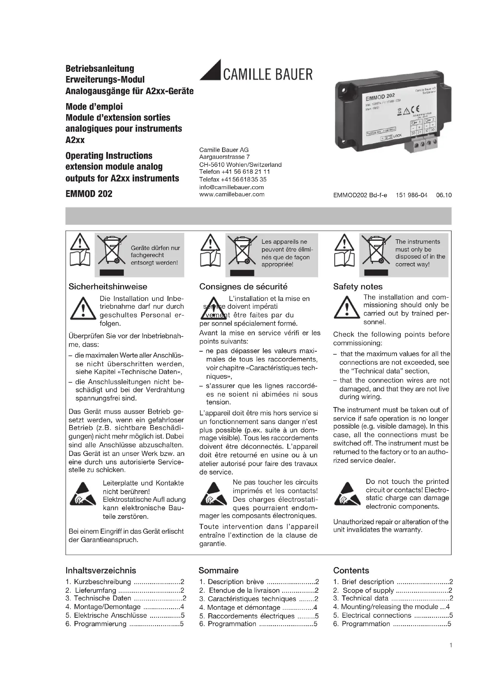 1 module d’extension EMMOD 202 4 rivets spéciaux en matière pla- stique 1 mode d’emploi en allemand/français/ anglais 1 étiquette additionnelle pour chaque entrée de mesure et sortie de me- sure/alimentation auxiliaire