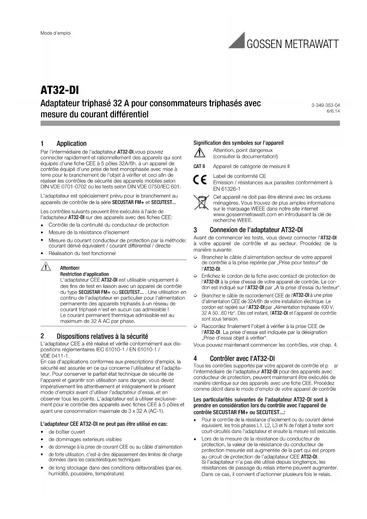 Dispositions relatives à la sécurité L'adaptateur CEE a été réalisé et vérifié conformément aux dis- positions réglementaires IEC 61010-1 / EN 61010-1 / VDE 0411-1. En cas d'applications conformes aux prescriptions d'emploi, la sécurité est assurée en ce qui concerne l'utilisateur et l'adapta- teur. Pour conserver le parfait état technique de sécurité de l'appareil et garantir son utilisation sans danger, vous devez impérativement lire attentivement et intégralement le présent mode d'emploi avant d'utiliser l'adaptateur d'essai, et en observer tous les points. L'adaptateur est à utiliser exclusive- ment pour le contrôle des appareils avec fiches CEE à 5 pôles et ayant une consommation maximale de 3 x 32 A (AC-1). L'adaptateur CEE AT32-DI ne peut pas être utilisé en cas: