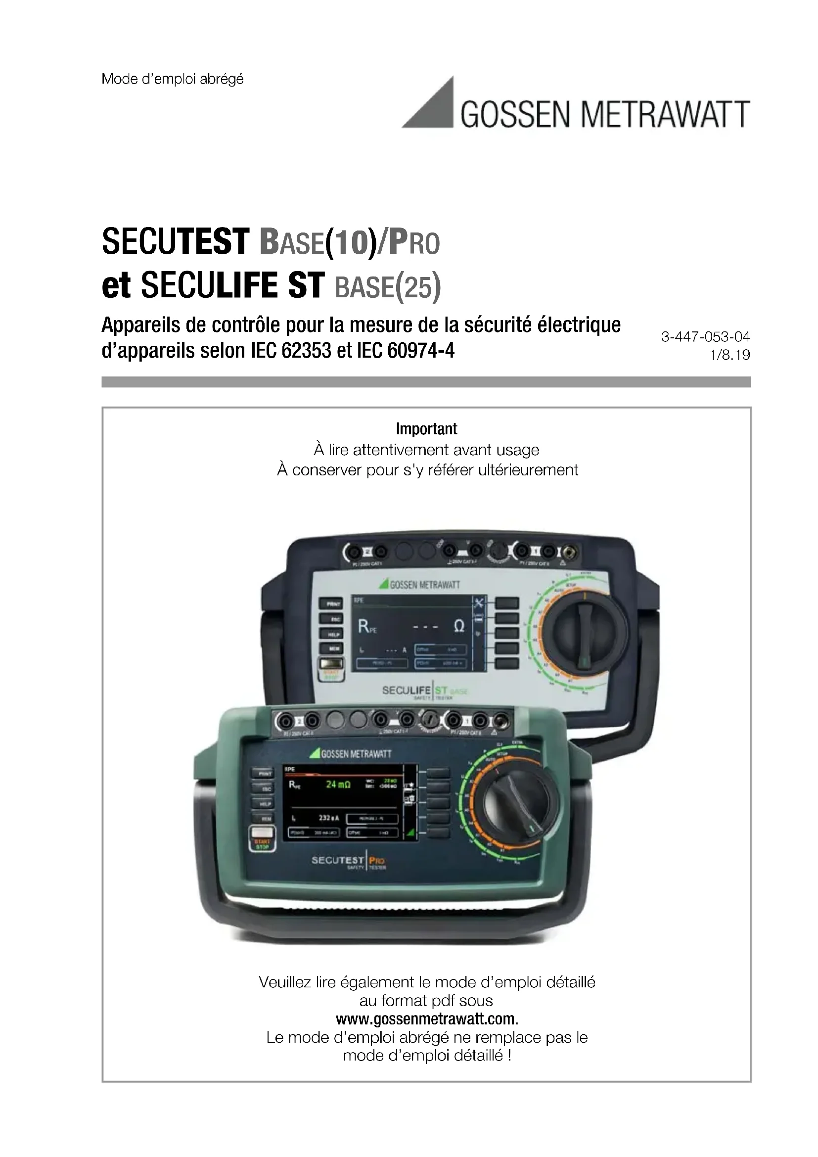 et SECULIFE ST BASE(25) Appareils de contrôle pour la mesure de la sécurité électrique d’appareils selon IEC 62353 et IEC 60974-4 3-447-053-041/8.19 Veuillez lire également le mode d’emploi détaillé au format pdf sous www.gossenmetrawatt.com. Le mode d’emploi abrégé ne remplace pas le mode d’emploi détaillé ! Important À lire attentivement avant usage À conserver pour s'y référer ultérieurement2 GMC-I Messtechnik GmbH Vue d’ensemble des commandes et des connexions Différence entre les caractéristiques d’équipement SECUTEST... Merkmal BASE BASE10 PRO PRO BT comfort —