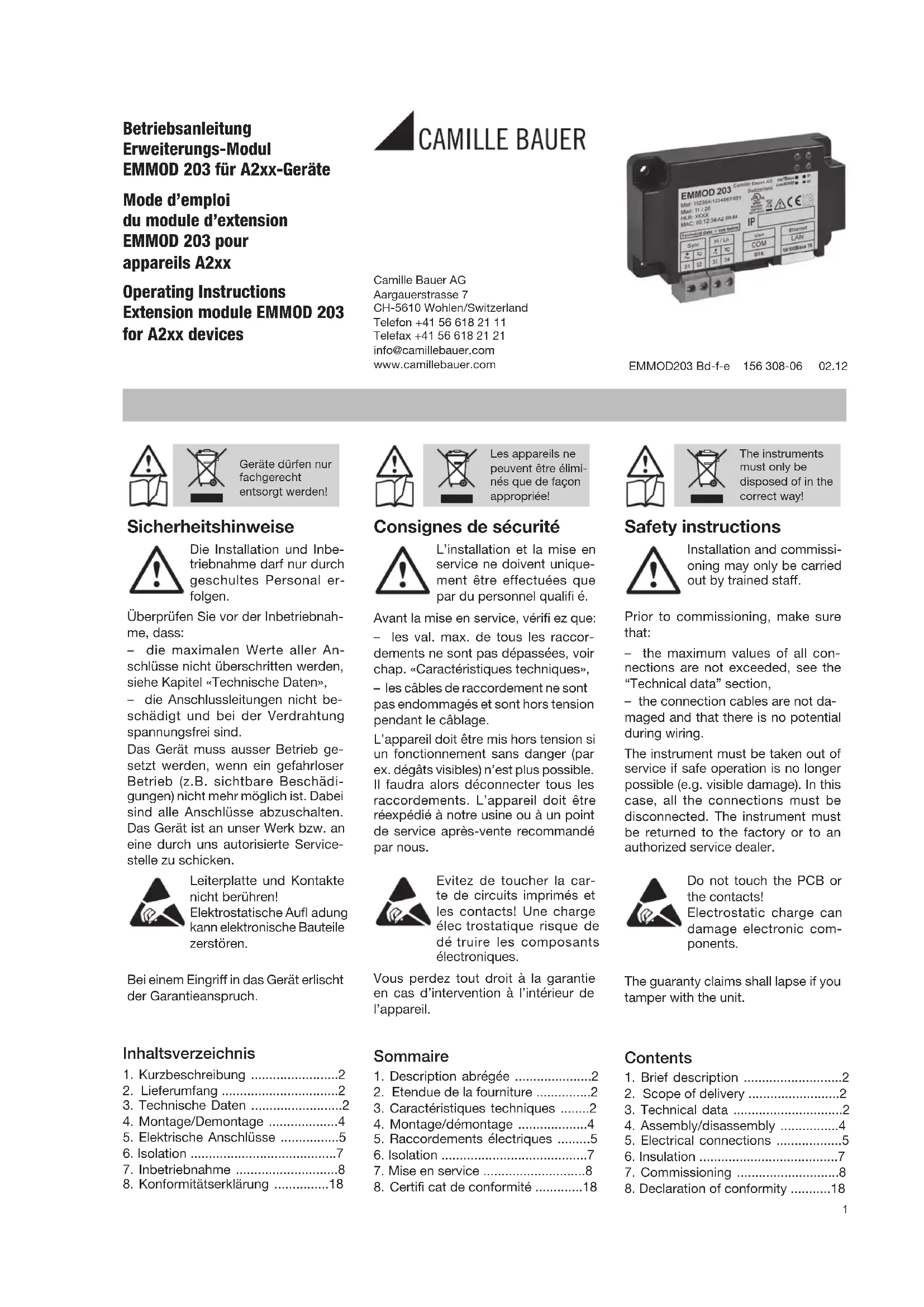Geräte dürfen nur fachgerecht entsorgt werden! Consignes de sécurité L’installation et la mise en service ne doivent unique- ment être effectuées que par du personnel qualifi é. Avant la mise en service, vérifi ez que: – les val. max. de tous les raccor- dements ne sont pas dépassées, voir chap. «Caractéristiques techniques», – les câbles de raccordement ne sont pas endommagés et sont hors tension pendant le câblage. L’appareil doit être mis hors tension si un fonctionnement sans danger (par ex. dégâts visibles) n’est plus possible. Il faudra alors déconnecter tous les raccordements. L’appareil doit être réexpédié à notre usine ou à un point de service après-vente recommandé par nous. Evitez de toucher la car- te de circuits imprimés et les contacts! Une charge élec trostatique risque de dé truire les composants électroniques. Vous perdez tout droit à la garantie en cas d’intervention à l’intérieur de l’appareil. Sommaire