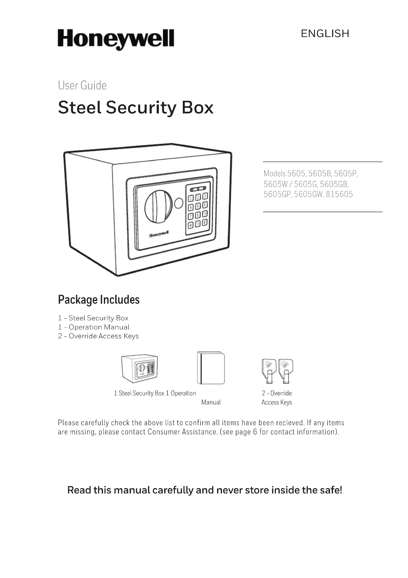 - Quantité de clés commandées 19REMARQUE : 20LH Licensed Products, Inc, (« LHLP, Inc. ») garantit que pendant une période de cinq (5) ans à partir de la date d’achat, ce produit sera exempt de défauts structurels ou mécaniques causés par les matériaux ou la main-d’œuvre. LHLP, Inc., à son choix et comme seul recours de l'acheteur sous cette garantie, réparera ou remplacera ce produit ou l'un de ses composants défectueux pendant la période de garantie. Le remplacement ou la réparation sera effectué par un produit, composant neuf ou remanufacturé. Si le produit n’est plus admissible, le remplacement peut être effectué avec un produit similaire ou de qualité égale ou supérieure. CECI EST VOTRE GARANTIE EXCLUSIVE. Nos produits comportent des garanties ne pouvant être exclues sous la Loi des consommateurs de l’Australie. Vous avez droit à un remplacement ou un remboursement en cas de défaut majeur et à une compensation dans le cas de tout autre perte ou dommage raisonnablement prévisible. Vous avez également droit à ce que votre produit soit réparé ou remplacé dans le cas où il ne serait pas de qualité acceptable et que le défaut ne serait pas majeur. Cette garantie n’est valable que pour l’acheteur original au détail à partir de la date de l’achat au détail initial, et n’est pas transférable. Vous devez garder le reçu de vente original. Une preuve d’achat est requise pour obtenir la garantie de service. Les détaillants LHLP, Inc., centres de service ou magasins au détail vendant ce produit n’ont pas le droit d’altérer, modifier ou changer les modalités et conditions de cette garantie. Cette garantie ne s’applique pas au fini de ce produit. Cette garantie ne couvre pas l’usure normale des pièces causées par l’un de ce qui suit : utilisation négligente, mauvaise utilisation du produit, utilisation ne respectant pas les directives d’utilisation, désassemblage, réparation ou altération par toute personne autre que LHLP, Inc. ou un centre de service autorisé, l’installation inappropriée, ou l’exposition à la chaleur et l’humidité extrême. De plus, la garantie ne couvre pas les cas fortuits, comme les incendies, les inondations, les tremblements de terre, les ouragans et les tornades. LHLP, Inc. n’est pas responsable de tous dommages accessoires ou indirects causés par la viola- tion de toute garantie expresse ou tacite ou autrement liée à la vente de ce produit. LH Licensed Products, Inc. n’est également pas responsable des coûts associés avec le retrait ou l’installation de ce produit ; le dommage ou la perte au contenu de ce produit ; ni pour le retrait non autorisé du contenu ; ou de dommages survenus lors de l’expédition. LA GARANTIE PRÉCÉDENTE REMPLACE TOUTES AUTRES GARANTIES, EXPRESSES OU TA CITES, INCLUANT TOUTES GARANTIES DE QUALITÉ MARCHANDE OU APTITUDE À L’EMPLOI POUR UN USAGE PARTICULIER, ET LHLP, INC. NONRESPONSABILITÉ ET TOUTES AUTRES CLAUSES RESTRICTIVES ET GARANTIES. Sauf pour ce qui est prescrit par les lois applicables, toute garantie tacite de qualité marchande ou aptitude à l’emploi est limitée en durée à la période de garantie précédemment prescrite. Cer- tains états, provinces ou juridictions ne permettent pas l’exclusion ou la limitation des garanties tacites ou indirectes ou la limitation sur la durée de la garantie, de ce fait, les limitations énon- cées précédemment peuvent ne pas s’appliquer à vous. Cette garantie vous donne des droits juridiques spécifiques, et vous pourriez aussi avoir d’autres droits pouvant varier selon l’état, la province ou la juridiction. Garantie limitée 21Fabriqué par : LH Licensed Products, Inc. 860 East Sandhill Avenue Carson, CA 90746 www.honeywellsafes.com La marque de commerce de Honeywell est utilisée avec l’autorisation de Honeywell International Inc. ; Honeywell International Inc. ne fait aucune déclaration ou garantie concernant ce produit.¡Lea este manual detenidamente y nunca lo guarde dentro de la caja fuerte! Guía del usuario Caja fuerte de acero El paquete incluye Revise cuidadosamente la lista anterior para confirmar que haya recibido todos los componentes. Si falta algún componente, comuníquese con Servicio al Consumidor (vea la información de contacto en la página 6).1 – Caja fuerte de acero1 – Manual de funcionamiento2 – Llaves de acceso manual1 Caja fuerte de acero1 Manual de funcionamiento2 – Llaves de acceso manual ESPAÑOL Models 5605, 5605B, 5605P, 5605W / 5605G, 5605GB, 5605GP, 5605GW, 815605 La marque de commerce de Honeywell est utilisée avec l’autorisation de Honeywell International Inc. ; Honeywell International Inc. ne fait aucune déclaration ou garantie concernant ce produit.BIENVENIDA / CONTENIDO DEL PAQUETE ........................PÁGINA 25 LLAVE DE ACCESO MANUAL / INSTALACIÓN DE