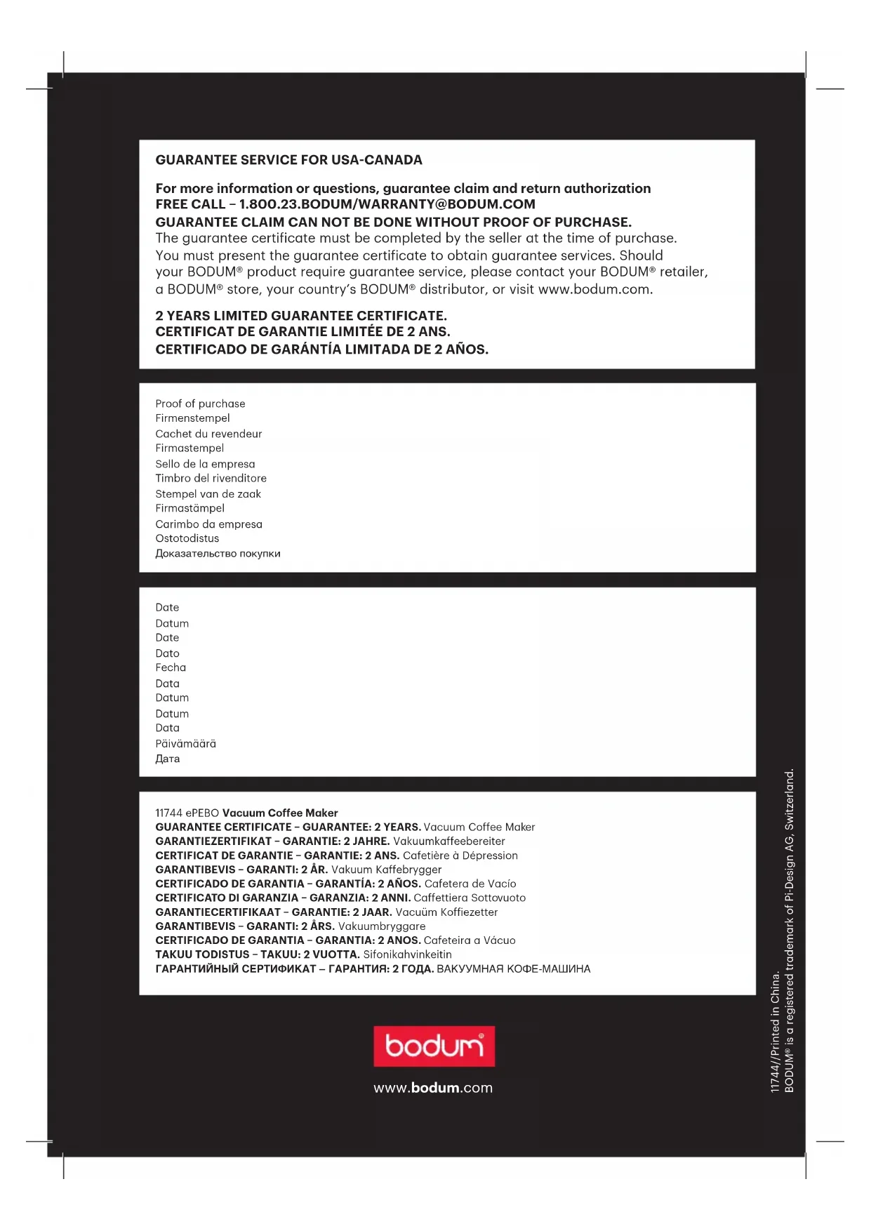 Mode d’emploiGARANTIE FABRICANT POUR LES ÉTATS-UNIS & CANADA, L'UNION EUROPÉENNE ET LA SUISSE. Garantie: BODUM® AG, Suisse, garantit la Cafetière à Dépression ePEBO pour une période de deux ans à compter de la date d'achat originale couvrant les matériaux défectueux et les défaillances suite à des défauts de fabrication ou de conception. Les réparations sont eectuées gratuitement si toutes les conditions de garantie sont remplies. Il n'y aura lieu à aucun remboursement. Garant: BODUM® (Schweiz) AG, Kantonsstrasse 100, Postfach 463, 6234 Triengen. Conditions de garantie: Le certiicat de garantie doit être rempli par le vendeur au moment de l'achat. Il devra être présenté pour bénéicier des services de garantie. Si votre produit nécessite un service de garantie BODUM®, veuillez contacter votre revendeur BODUM®, un magasin BODUM®, un distributeur BODUM® de votre pays, ou visiter www.bodum.com. BODUM® ne fournira pas de garantie pour les dommages résultant d'une utilisation inappropriée, d'une mauvaise manipulation, de l'usure normale, d'un entretien ou de soins inadéquats ou incorrects, d'une mauvaise manœuvre ou de l'utilisation de l'appareil par des personnes non autorisées. Cette garantie du fabricant n'aecte pas vos droits légaux en vertu des lois nationales applicables en vigueur, ni votre droit contre le revendeur découlant du contrat de vente/d'achat.