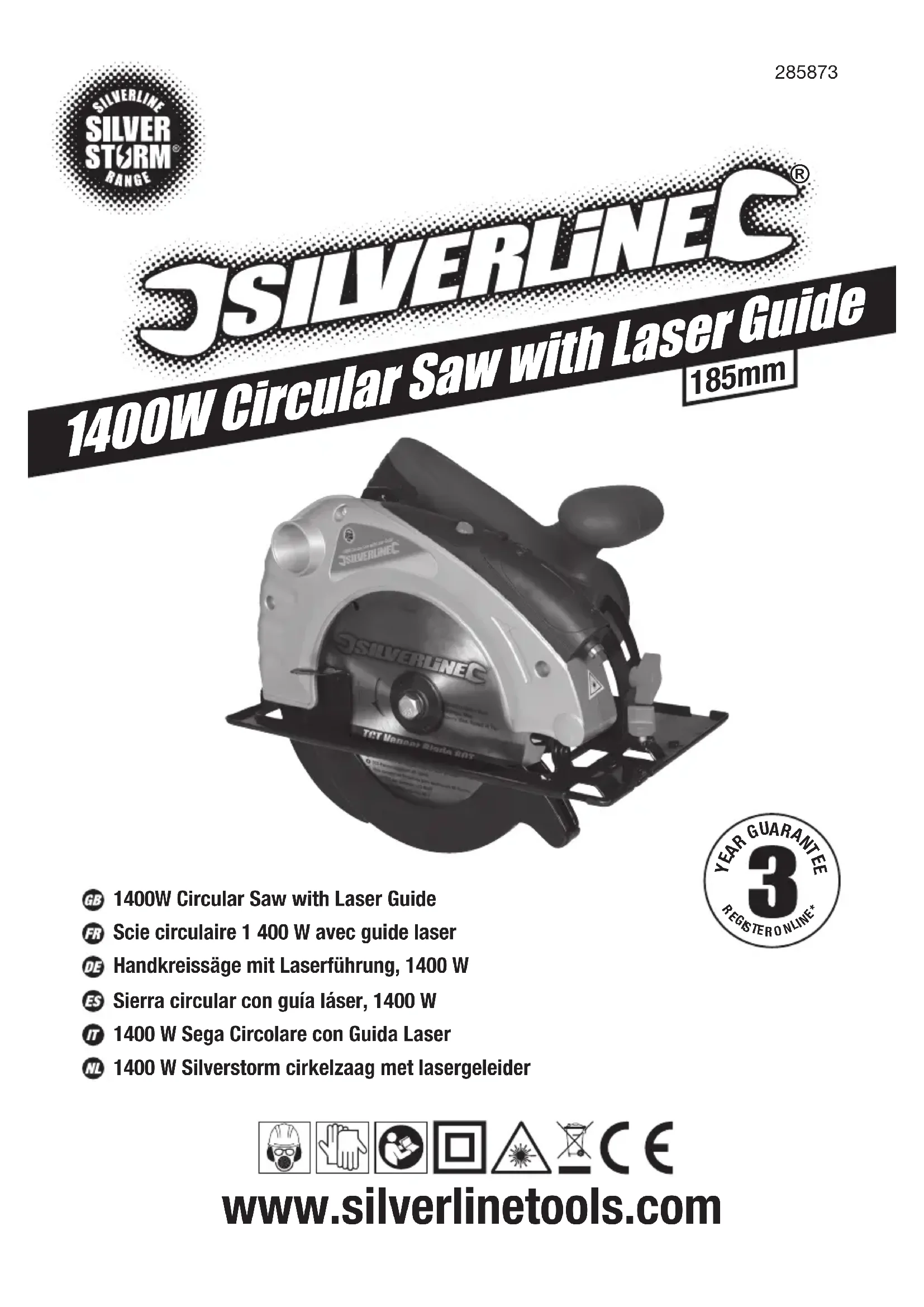 Scie circulaire 1 400 W avec guide laser285873 Conditions de garantie des outils Silverline Garantie Silverline Ce produit Silverline bénéficie d’une garantie de 3 ans Enregistrez ce produit sur le site silverlinetools.com dans les 30 jours suivant l’achat afin de bénéficier de la garantie de 3 ans. La période de garantie commence à partir de la date d’achat figurant sur votre facture d’achat. Enregistrement de votre achat Visitez silverlinetools.com, sélectionnez le bouton d’enregistrement et saisissez :• Vos informations personnelles• Les informations concernant le produit et l’achatVous recevrez le certificat de garantie en format PDF. Veuillez l’imprimer et le conserver avec votre achat.La période de garantie prend effet à compter de la date de l’achat en magasin, comme indiqué sur votre facture d’achat. VEUILLEZ CONSERVER VOTRE FACTURE D’ACHAT. Si ce produit est défectueux pendant les 30 jours qui suivent l’achat, retournez-le au magasin où vous l’avez acheté, avec votre facture, en expliquant en détail le problème. Le produit sera remplacé ou vous serez remboursé(e).Si ce produit est défectueux après cette période de 30 jours, retournez-le à :Silverline Tools Service Centre PO Box 2988 Yeovil BA21 1WU, Royaume UniToute demande de service sous garantie doit être soumise pendant la période de garantie.Avant toute intervention sous garantie, vous devez présenter la facture d’achat originale sur laquelle doivent figurer la date d’achat, votre nom, votre adresse et le lieu d’achat.Vous devez expliquer en détail la défaillance nécessitant réparation.Les demandes de service sous garantie faites pendant la période de garantie seront vérifiées par Silverline Tools pour établir si la défaillance du produit est liée à un vice de matériau ou de fabrication.Les frais de port ne seront pas remboursés. Les articles retournés doivent être convenablement propres et sûrs pour être réparés et devraient être emballés soigneusement pour éviter tout dommage ou toute blessure pendant le transport. Nous pouvons refuser les livraisons qui ne sont pas convenables ou sûres.Toute intervention sera effectuée par Silverline Tools ou ses agents de réparation agréés.La réparation ou le remplacement du produit ne dépassera pas la période de garantie.Les anomalies que nous reconnaissons être couvertes par la garantie seront rectifiées par la réparation de l’outil, sans frais (hormis les frais de port) ou par son remplacement par un outil en parfait état de fonctionnement.Les pièces ou les outils remplacés deviendront la propriété de Silverline Tools. La réparation ou le remplacement de votre produit sous garantie vous apporte des avantages ; ces avantages s’ajoutent à vos droits statutaires en tant que consommateur sans les affecter aucunement. La présente garantie couvre: La réparation du produit, s’il peut être vérifié, à la satisfaction de Silverline Tools, que les défaillances du produit ont été provoquées par un vice de matériau ou de fabrication au cours de la période de garantie.Si une pièce n’est plus disponible ou n’est plus fabriquée, Silverline Tools la remplacera par une pièce de rechange opérationnelle.Utilisation de ce produit dans l’UE. La présente garantie ne couvre pas: Silverline Tools ne garantit pas les réparations nécessaires du produit engendrées par :L’usure normale provoquée par l’utilisation conforme aux instructions d’utilisation, par exemple les lames, les charbons, les courroies, les ampoules, les batteries, etc.Le remplacement de tout accessoire fourni tel que les forêts, les lames, les feuilles abrasives, les outils de coupes et les autres articles associés.Les dommages et les défaillances accidentels causés par une utilisation ou un entretien négligent, une mauvaise utilisation, un manque d’entretien ou une utilisation ou une manipulation imprudente du produit.L’utilisation du produit à des fins autres que son utilisation domestique normale.Le moindre changement ou la moindre modification du produit.L’utilisation de pièces et d’accessoires qui ne sont pas des composants véritables de Silverline Tools.Une installation défectueuse (sauf si l’installation a été réalisée par Silverline Tools).Les réparations ou les modifications réalisées par des tiers autres que Silverline Tools ou ses agents de réparation agréés.Les demandes de service autres que le droit de rectifier les défaillances de l’outil indiquées dans ces conditions de garantie ne sont pas couvertes par cette garantie. Garantie batterie Les batteries de Silverline sont garanties pour 30 jours. En cas de défaut sur une batterie enregistrée lors de la période de garantie batterie, Silverline la remplacera gratuitement. Cette garantie ne s’applique pas à l’utilisation commerciale et ne s’étend pas non plus à l’usure normale ou aux dommages causés par des accidents, des mauvais traitements ou une utilisation impropre. Déclaration de conformité CE Le soussigné : Mr Darrell Morris Autorisé par : Silverline Tools Déclare que le produit : Code d’identification : 285873 Description: Scie circulaire 1 400 W avec guide laser Est conforme aux directives suivantes :