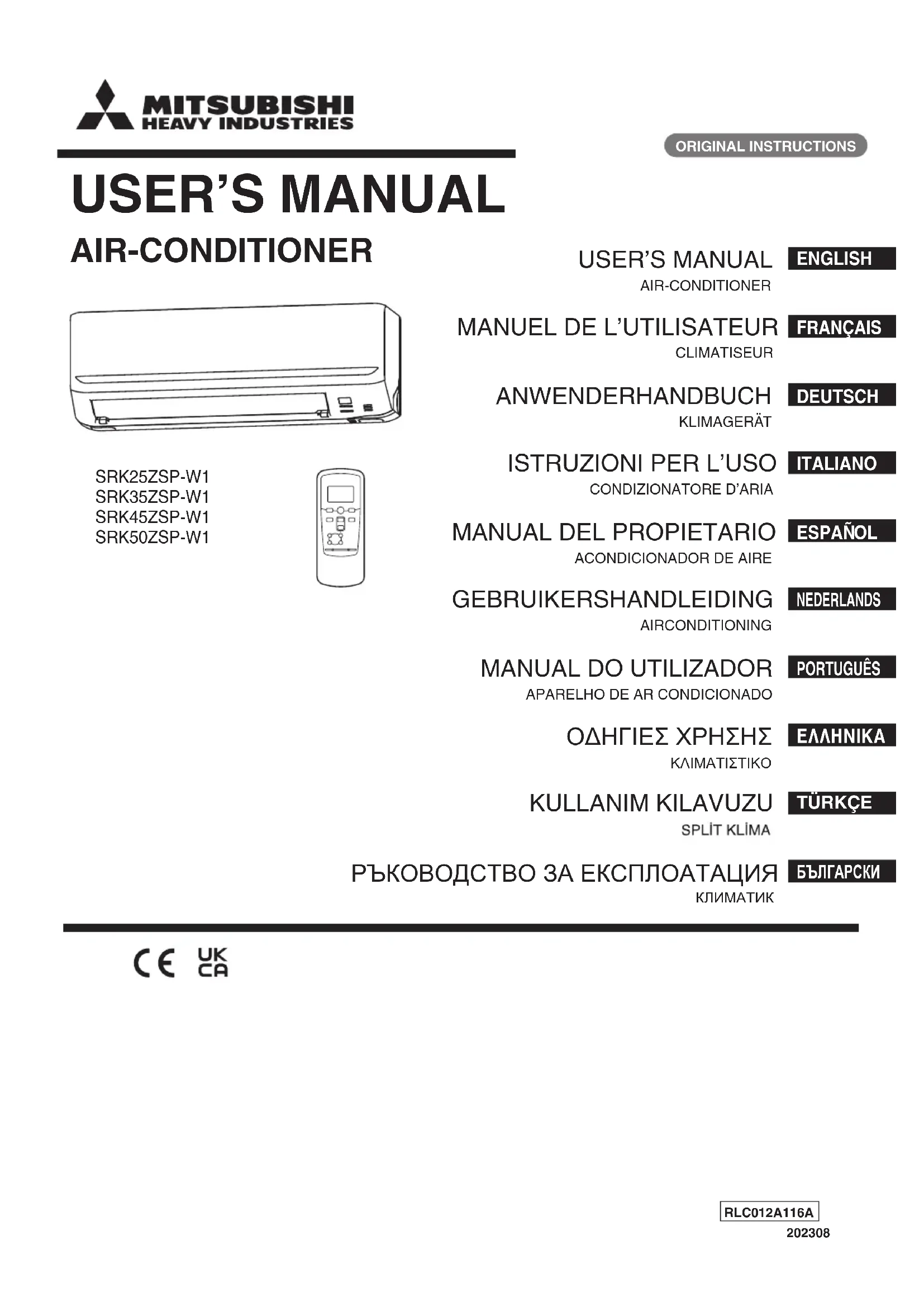 - MITSUBISHI HEAVY INDUSTRIES THERMAL SYSTEMS, LTD. 2-3, Marunouchi 3-chome, Chiyoda-ku, Tokyo, 100-8332, Japan declare under our sole responsibility that the apparatus referred to in this declaration conforms with the following directives. Relevant EU Directives : Machinery 2006/42/EC Applied Standards / Regulations : EN 60335-1 EN 60335-2-40 Conformity model list Authorised Representative in the EU : MHIAE SERVICES B.V. Herikerbergweg 238, Luna ArenA, 1101 CM Amsterdam, Netherlands P.O.Box 23393 1100 DW Amsterdam, Netherlands [Indoor Unit] [Outdoor Unit] Category Model SRK Series SRK25ZSP-W1 SRK35ZSP-W1 SRK45ZSP-W1 SRK50ZSP-W1 Category Model SRC Series SRC25ZSP-W1 SRC35ZSP-W1 SRC45ZSP-W1 SRC50ZSP-W1 Category Model SRK Series SRK25ZSP-W1 SRK35ZSP-W1 SRK45ZSP-W1 SRK50ZSP-W1 Category Model SRC Series SRC25ZSP-W1 SRC35ZSP-W1 SRC45ZSP-W1 SRC50ZSP-W1 EN 60335-1 EN 60335-2-40 RLC012A116A_Cover.indd 2RLC012A116A_Cover.indd 2 2023/10/25 9:17:262023/10/25 9:17:26FR-1 Nous vous remercions d’avoir choisi un climatiseur MITSUBISHI HEAVY INDUSTRIES THERMAL SYSTEMS, LTD. Pour obtenir des performances optimales et durables, veuillez lire attentivement et respecter les instructions du présent manuel d’utilisateur avant d'utiliser votre climatiseur. Reportez-vous au manuel si vous avez des questions ou en cas de dysfonctionnement. Votre unité de climatisation peut comporter ce symbole, qui signifie que les déchets d’équipements électriques et électroniques (DEEE selon la directive 2012/19/UE) ne doivent pas être jetés aux ordures ménagères générales.Les climatiseurs doivent être réusinés dans un établissement autorisé, en vue de leurs réutilisation, recyclage et récupération, et non pas être éliminés dans une décharge municipale. Pour de plus amples renseignements à ce sujet, veuillez communiquer avec l’installateur ou l’autorité municipale. Ce symbole, imprimé sur les piles insérées dans votre appareil de climatisa- tion, est une information destinée à l’utilisateur final, selon la Directive 2006/66/ CE Article 20 Annexe II de l’UE. Les piles usées ne doivent pas être jetées avec les déchets domestiques. Si un symbole chimique est imprimé à côté du symbole indiqué ci-dessus, cela signifie que les piles contiennent une certaine concentration de métal lourd. Ceci est indiqué de la façon suivante: Hg: mercure (0,0005 %), Cd: cadmium (0,002 %), Pb: plomb (0,004 %) Veuillez déposer les piles à l’endroit préconisé dans votre déchetterie locale ou dans un centre de recyclage. Le niveau d’émission sonore dû à la pression des appareils extérieur et intérieur est inférieur à 70 dB(A). FRANÇAIS Consignes de sécurité p. 2