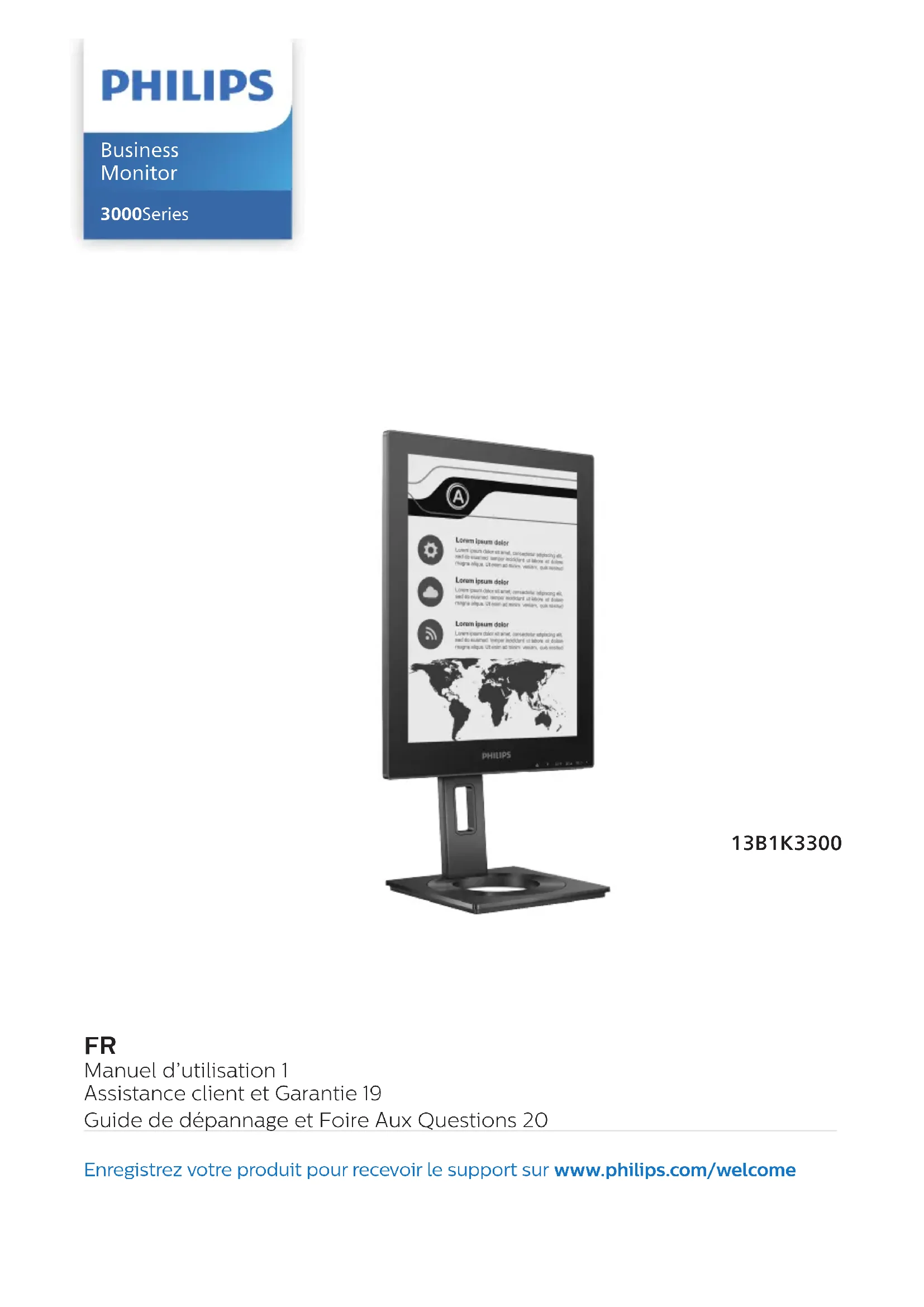 Manuel d’utilisation 1 Assistance client et Garantie 19 Guide de dépannage et Foire Aux Questions 20 Business Monitor 3000 Series 13B1K3300Table des matières
