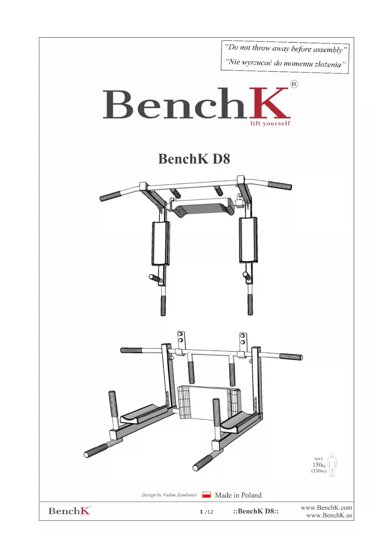 Consignes de sécurité - Une seule personne à la fois peut s'exercer sur le BenchK D8. - Avant chaque exercice, vérifiez l'état du BenchK D8 - fixations et autres composants. - Le produit ne doit être fixé qu'à des surfaces verticales (murs) de structure et de résistance adéquates, en tenant compte du poids du produit et du poids de l'utilisateur. - Les enfants âgés de 0 à 3 ans ne peuvent pas utiliser le BenchK D8. - Les personnes âgés de 3 à 14 ans peuvent utiliser l'appareil sous la surveillance d'un adulte. - Le poids maximal de l'utilisateur du BenchK D8 est de 150 kg. - Assurez-vous qu'il y ait suffisamment d'espace autour de la barre de gymnastique pour effectuer les exercices en toute sécurité. - Utilisez un matelas ou un tapis d'exercice pour minimiser le risque de blessure. - Pour l'entretien, essuyez le BenchK D8 avec un chiffon sec ou légèrement humide. - En cas de démontage, stockez le BenchK D8 dans un local sec et peu humide. - Évitez les efforts excessifs pendant l'exercice. Le niveau de difficulté et l'intensité des exercices doivent être choisis en fonction de l'état de santé et de la condition de la personne qui les pratique. Garantie du fabricant : - Le fabricant garantit à l'acheteur la conservation de tous les indicateurs de qualité dans un délai de 10 ans pour les composants métalliques et dans un délai de 24 mois pour les autres composants, à compter de la date d'achat, à condition que les règles d'installation et d'utilisation soient respectées. - En cas de dommages mécaniques survenus pendant le transport, le montage ou l'utilisation de la barre par l'acheteur, le vendeur décline toute responsabilité. - Si vous constatez des défauts ou des composants de mauvaise qualité qui ne sont pas de la responsabilité de l'acheteur, veuillez contacter le service clientèle de Benchmark (biuro@benchk.com). Remarques : En raison de l'amélioration continue du BenchK D8, des modifications mineures de la conception sont possibles, mais elles ne réduisent pas la qualité. Les goujons et les vis ne sont pas incluses. Leur type doit être choisi en fonction du type de mur sur lequel le BenchK D8 sera fixé. Le produit répond aux exigences de sécurité contenues dans les normes PN-EN 913:2019-03, PN-EN 12197:2000./12 ::BenchK D8::
