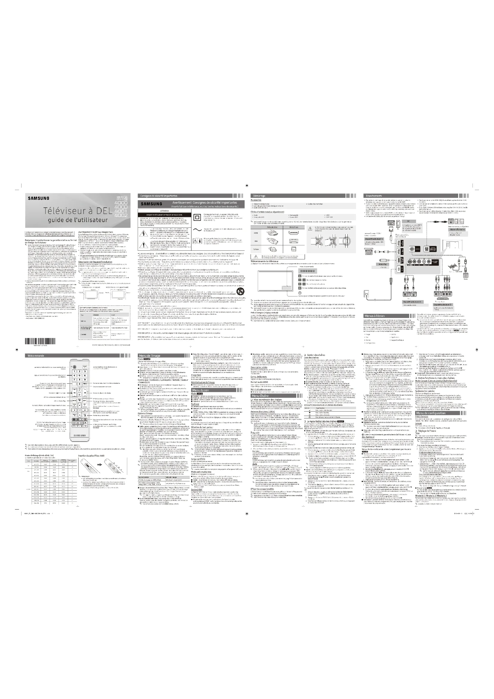 - Les piles usages doivent être jetées en respectant l’environnement. MISE EN GARDE : pour réduire les risques d’incendie et de choc électrique, n’exposez pas cet appareil à la pluie ou à l’humidité. Ne l’exposez pas non plus aux égouttements ou aux éclaboussures. Ne placez pas d’objets remplis de liquide, par exemple un vase, sur le dessus de l’appareil. MISE EN GARDE : n’exposez pas les piles à une chaleur excessive comme celle induite par la lumière du soleil, un feu ou autrement. MISE EN GARDE :la prise secteur sert de dispositif de désaccouplage; elle doit demeurer facilement accessible. MISE EN GARDE : afin de réduire les risques d’électrocution, retirez pas le couvercle (ou le panneau arrière), car il n’y a aucune pièce réparable par l’utilisateur à l’intérieur. Confiez les réparations à un technicien qualifié. Le symbole représentant un éclair terminé par une flèche à l’intérieur d’un triangle équilatéral vise à avertir l’utilisateur du danger de la présence d’une «tension dangereuse »présentée pardes pièces non isolées à l’intérieur de l’appareil, éventuellement suffisante pour constituer un risque d’électrocution. Le symbole de point d’exclamation à l’intérieur un triangle équilatéral, vise à informer l’utilisateur de la présence de consignes de fonctionnement et de maintenance importantes dans la documentation qui accompagne l’appareil. Cet équipement est un appareil électrique de classe II ou à double isolation. Il a été conçu de sorte àne pas nécessiter une connexion de sécurité mise à la terre. Lorsque vous appuyez sur ce bouton, le menuRaccourcisibles d'accessibilité s'affiche.UN32J4000/UN32J400D/UN32J4001/UN32J4002 UN32J4000/UN32J400D/UN32J4001/UN32J4002