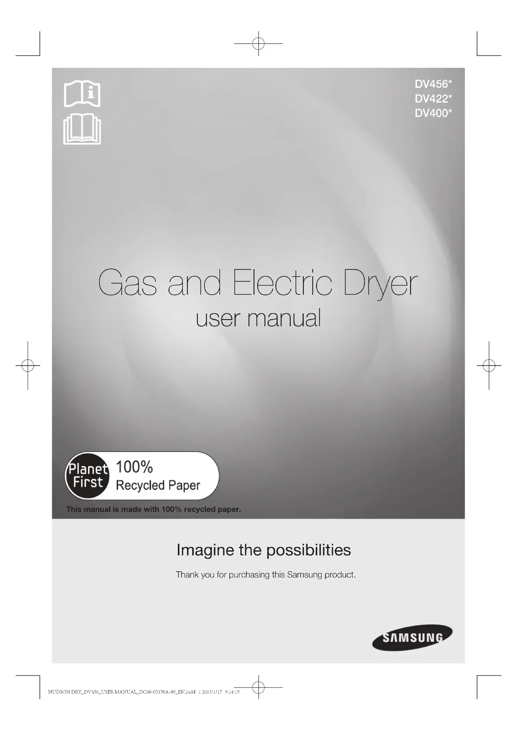 Visits by a Service Engineer to explain functions, maintenance or installation is not covered by warranty. Please contact your Samsung call agent for help with any of these issues. HUDSON DRY_DV456_USER MANUAL_DC68-03170A-09_EN.indd 39 2015/1/17 9:14:23QUESTIONS OR COMMENTS? Country CAll OR VIsIT Us ONlINe AT U.S.A 1-800-SAMSUNG (726-7864) www.samsung.com/us/support CANADA 1-800-SAMSUNG (726-7864) www.samsung.com/ca/support (English) www.samsung.com/ca_fr/support (French) MEXICO 01-800-SAMSUNG (726-7864) www.samsung.com/mx/support Code No. DC68-03170A-09_EN Scan this with your smartphone Visits by a Service Engineer to explain functions, maintenance or installation is not covered by warranty. Please contact your Samsung call agent for help with any of these issues. HUDSON DRY_DV456_USER MANUAL_DC68-03170A-09_EN.indd 40 2015/1/17 9:14:24Sèche-linge à gaz et électrique manuel d'utilisation Un monde de possibilités Nous vous remercions d'avoir choisi ce produit Samsung. DV456* DV422* DV400* This manual is made with 100% recycled paper.HUDSON DRY_DV456_USER MANUAL_DC68-03170A-09_CFR.indd 1 2015/1/17 9:35:112_ caractéristiques caractéristiques