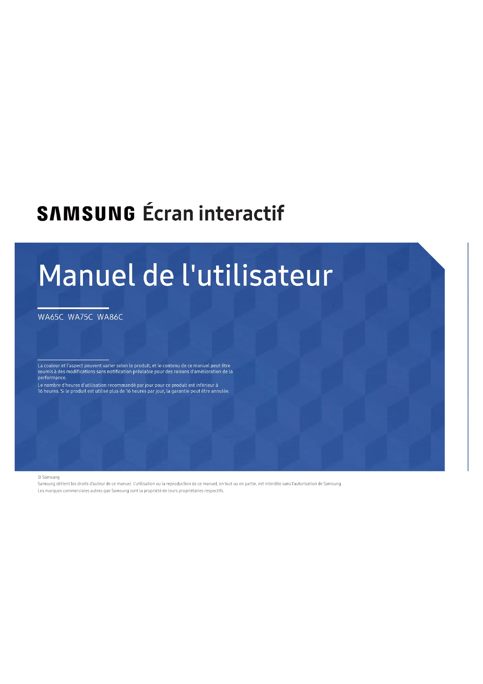 © Samsung Samsung détient les droits d'auteur de ce manuel. L'utilisation ou la reproduction de ce manuel, en tout ou en partie, est interdite sans l'autorisation de Samsung. Les marques commerciales autres que Samsung sont la propriété de leurs propriétaires respectifs. Interactive Display Écran interactif Manuel de l'utilisateur WA65C WA75C WA86C La couleur et l'aspect peuvent varier selon le produit, et le contenu de ce manuel peut être soumis à des modications sans notication préalable pour des raisons d'amélioration de la performance. Le nombre d'heures d'utilisation recommandé par jour pour ce produit est inférieur à 16 heures. Si le produit est utilisé plus de 16 heures par jour, la garantie peut être annulée.2 Table des matières Avant l'utilisation de ce produit Consignes de sécurité 4 Symboles de sécurité 4 Stockage 5 Électricité et sécurité 5 Installation 5 Fonctionnement 6 Précautions d'utilisation 8 Préparatifs Vérication des composants 9 Pièces 10 Ports 11 Avant d'installer le produit (Guide d'installation) 13 Installation du dongle Wi-Fi (Modèle : SI07B) 14 Installation du support mural 14 Utilisation du kit de montage mural 14 Spécications du kit de montage mural (VESA) 15 Connexion à un réseau 16 Paramètres réseau (câblé) 16 Paramètres de réseau (sans l) 18 Écriture Note - Entrée 20 Écrire 20 Éléments de l'interface utilisateur 21 Écrire 22 Fonctions d'extension du stylet 22 Effacement 22 Menu de Note 23 Paramètres 24 Fonctions de Note 25 Palette 30 Éléments de l'interface utilisateur 31 PARAMÈTRES Paramètres système 32 Sans l et réseau 33 Wi-Fi 33 Ethernet 34 Partage de connexion 34 Bluetooth 35 VPN 35 Service Samba 36 Personnaliser 36 Fond d'écran 37 Économiseur d'écran 38 Options Balayer vers le haut au bas 38 Mode Multi-fenêtre 39 Entrée et sortie 40 Paramètres de sortie du son 40 Paramètres de dénomination des entrées 41 Format HDMI OUT 41 Application 42 Système 43 Date et heure 43 Langue et clavier 44 Région 44 Stockage 45 Mise à jour du système 46 Mode de protection des yeux et Rétroéclairage automatique 46 Décalage des pixels 473 Table des matières Verrouillage de l'écran 47 Compte de messagerie 48 Démarrage et arrêt 48 Sécurité 50 Administrateur 51 Réveiller à distance 52 HDMI CEC 52 Clonage USB 52 Élément au démarrage par défaut 53 Mode Kiosque 53 Suppression automatique de chiers 54 Verrouillage de sécurité 54 À propos 55 Menu OSD 55 Écran d'accueil 56 Afchage 56 Audio 57 Guide de dépannage Problèmes et solutions 58 Spécications Général 64 Modes de synchronisation prédénis 66 Annexe Service payant (frais facturés aux clients) 67 Le produit ne présente pas de défaut 67 Un produit endommagé par la faute du client 67 Autres 67 Protection contre la rémanence d'image 68 Qu'entend-on par rémanence d'image ? 68 Pratiques de prévention recommandées 68 HDMI License notice 68 Faible lumière bleue 69 ENERGY STAR 694