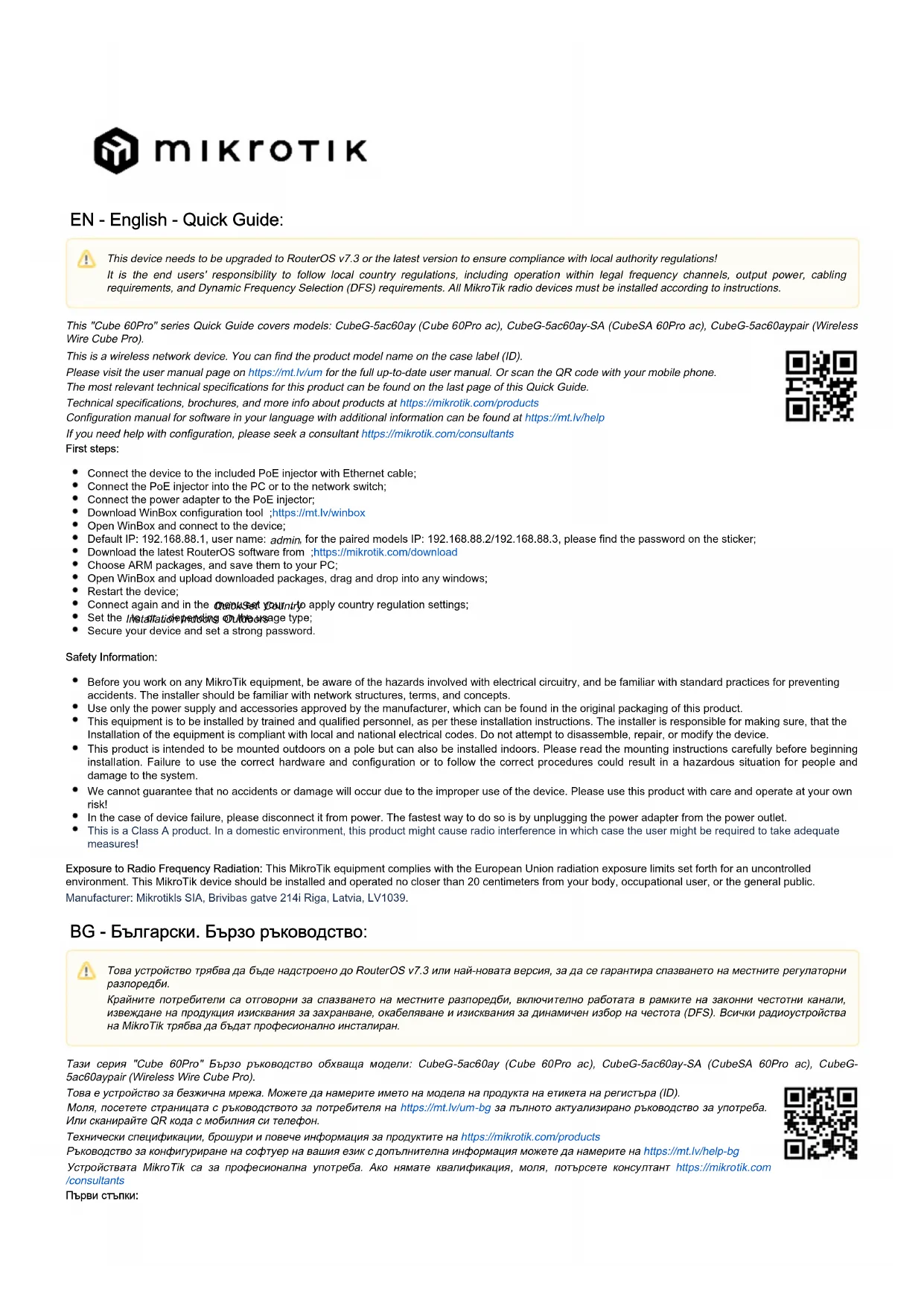 les exigences d'alimentation, de câblage et de sélection dynamique de fréquence (DFS). Tous les appareils radio MikroTik doivent êtreinstallé professionnellement.Spécifications techniques, brochures et plus d'informations sur les produits surhttps://mikrotik.com/products Vous trouverez le manuel de configuration du logiciel dans votre langue avec des informations supplémentaires sur https://mt.lv/help-fr Les appareils MikroTik sont destinés à un usage professionnel. Si vous n'avez pas de qualifications, veuillez consulter un consultant https://mikrotik.com/consultants Premiers pas: Connectez l'appareil à l'injecteur PoE fourni avec un câble Ethernet; Connectez l'injecteur PoE au PC ou au commutateur réseau; Connectez l'adaptateur d'alimentation à l'injecteur PoE; Téléchargez l'outil de configuration WinBox ;https://mt.lv/winbox Ouvrez WinBox et connectez-vous à l'appareil; IP par défaut: 192.168.88.1, nom d'utilisateur: , pour les modèles jumelés IP: 192.168.88.2/192.168.88.3, veuillez trouver le mot de passe sur admin l'autocollant; Téléchargez le dernier logiciel RouterOS sur ;https://mikrotik.com/download Choisissez les packages ARM et enregistrez-les sur votre PC; Ouvrez WinBox et téléchargez les packages téléchargés, glissez-déposez dans toutes les fenêtres; Redémarrez l'appareil; Connectez-vous à nouveau et définissez votre pays dans le menu pour appliquer les paramètres de réglementation du pays; QuickSet Réglez l'installation sur ou , selon le type d'utilisation ; Indoors Outdoors Sécurisez votre appareil et définissez un mot de passe fort; Information sur la sécurité: Avant de travailler sur un équipement MikroTik, soyez conscient des dangers liés aux circuits électriques et familiarisez-vous avec les pratiques standard de prévention des accidents. Le programme d'installation doit être familiarisé avec les structures, les termes et les concepts du réseau. Utilisez uniquement l'alimentation et les accessoires approuvés par le fabricant et qui se trouvent dans l'emballage d'origine de ce produit. Cet équipement doit être installé par du personnel formé et qualifié, conformément à ces instructions d'installation. L'installateur est responsable de s'assurer que l'installation de l'équipement est conforme aux codes électriques locaux et nationaux. N'essayez pas de démonter, réparer ou modifier l'appareil. Ce produit est destiné à être monté à l'extérieur sur un poteau, mais peut également être installé à l'intérieur . Veuillez lire attentivement les instructions de montage avant de commencer l'installation. Le fait de ne pas utiliser le matériel et la configuration corrects ou de ne pas suivre les procédures correctes peut entraîner une situation dangereuse pour les personnes et endommager le système . Nous ne pouvons garantir qu'aucun accident ou dommage ne se produira en raison d'une mauvaise utilisation de l'appareil. Veuillez utiliser ce produit avec soin et l'utiliser à vos propres risques! En cas de panne de l'appareil, veuillez le déconnecter de l'alimentation. La façon la plus rapide de le faire est de débrancher l'adaptateur secteur de la prise de courant. Ceci est un produit de classe A. Dans un environnement domestique, ce produit peut provoquer des interférences radio, auquel cas l'utilisateur peut être amené à prendre les mesures adéquates! cet équipement MikroTik est conforme aux limites d'exposition aux rayonnements Union européenne établies pourExposition aux rayonnements radiofréquences: un environnement non contrôlé. Cet appareil MikroTik doit être installé et utilisé à au moins 20 centimètres de votre corps, de l'utilisateur professionnel ou du grand public. Fabricant: Mikrotikls SIA, Brivibas gatve 214i Riga, Lettonie, LV1039. HR - Hrvatski. Brzi vodič: Ovaj "Cube 60Pro" serija Brzi vodič obuhvaća modele:CubeG-5ac60ay (Cube 60Pro ac),CubeG-5ac60ay-SA (CubeSA 60Pro ac),CubeG-5ac60aypair (Wireless Wire Cube Pro).