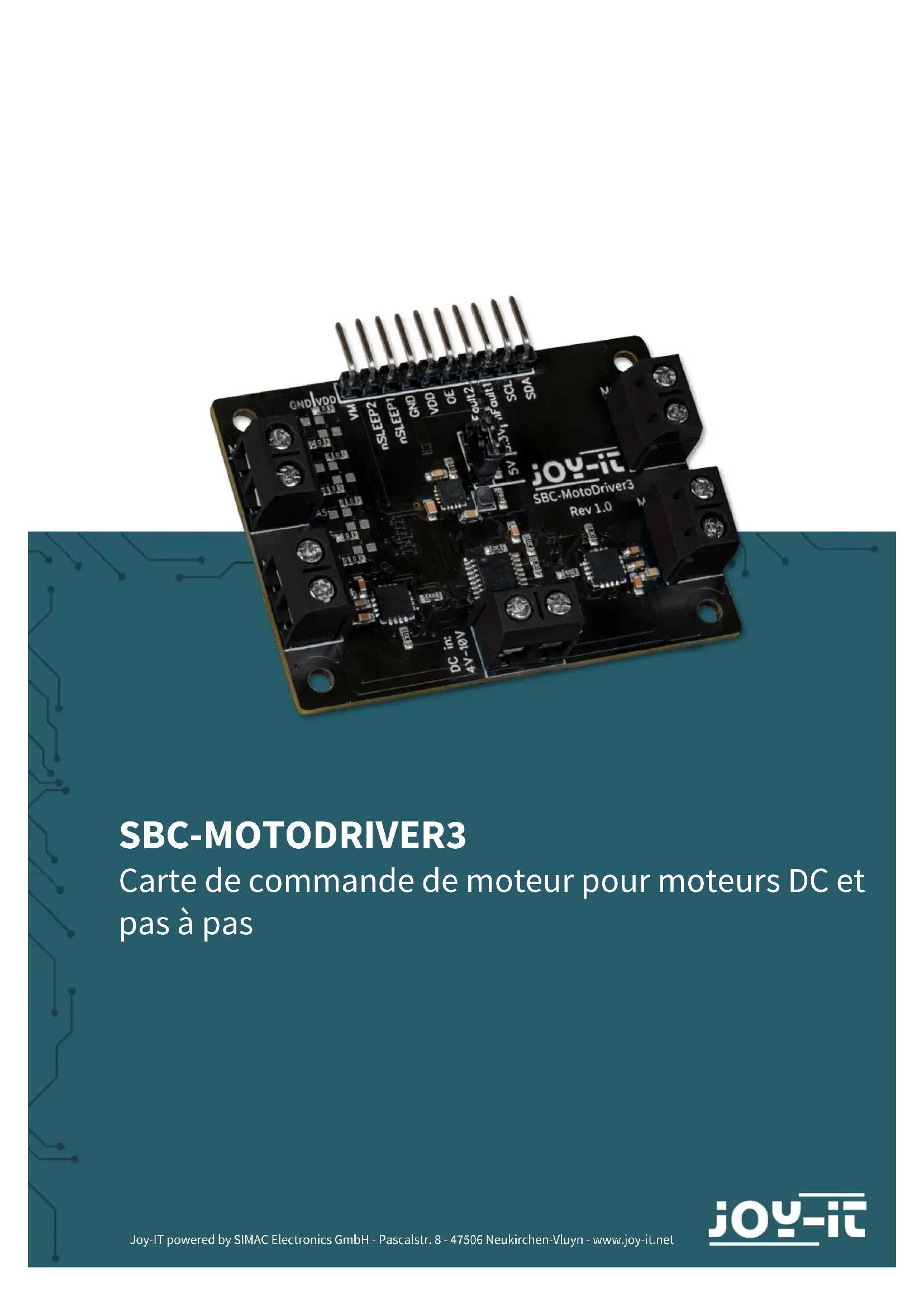 Joy-IT powered by SIMAC Electronics GmbH - Pascalstr. 8 - 47506 Neukirchen-Vluyn - www.joy-it.net SBC-MOTODRIVER3 Carte de commande de moteur pour moteurs DC et pas à pasAttention, ce manuel a été traduit automatique- ment, en cas de doute, consulter le manuel en anglais ou contactez le service client. Toutes les demandes de support doivent être formulées en allemand ou en anglais.