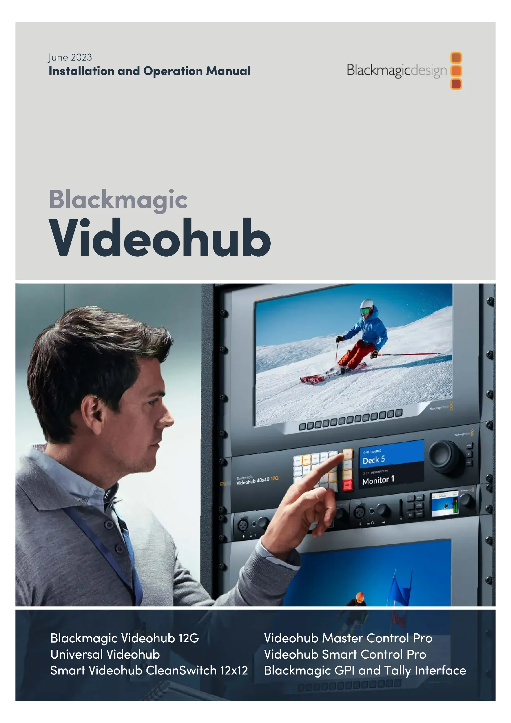 保証Juin 2023 Manuel d'installation et d’utilisation Blackmagic Videohub 12G Universal Videohub Smart Videohub CleanSwitch 12x12 Videohub Master Control Pro Videohub Smart Control Pro Blackmagic GPI and Tally Interface Blackmagic VideohubChère cliente, cher client, Nous vous remercions d'avoir fait l'acquisition du Blackmagic Videohub ! Nous espérons que vous partagez le même rêve que nous : faire de l'industrie audiovisuelle un lieu créatif où chacun a accès à des équipements vidéo de grande qualité. Il n’y a pas si longtemps, la production et post-production d’émissions de télé de qualité nécessitaient de dépenser une somme d’argent astronomique en matériel audiovisuel. Les grilles de commutation SDI professionnelles étaient bien souvent trop chères pour que le commun des mortels puisse se les procurer. Les produits intégrant le HD-SDI coûtaient encore plus cher, et seuls les gros studios de post-production et de télévision pouvaient se les payer. Le Videohub change complètement la donne! Certains des modèles Videohub disposent non seulement du HD-SDI, mais aussi de l’Ultra HD, vous offrant la possibilité de travailler en 4K 60p dans votre studio à l’aide du 12G-SDI. Ce manuel d'utilisation contient toutes les informations dont vous avez besoin pour installer votre Videohub. Il vous est toutefois recommandé de faire appel à du personnel qualifié en cas de doute sur ce qu'est une adresse IP ou si vous souhaitez davantage d'informations sur les réseaux d'ordinateurs. Le Videohub est facile à installer. Toutefois, certaines préférences techniques devront sans doute être configurées après l'installation. Veuillez consulter notre site Internet www.blackmagicdesign.com/fr et notre page d'assistance pour télécharger les dernières mises à jour de ce manuel et du logiciel Videohub. Enfin, veuillez enregistrer votre équipement lors du téléchargement des mises à jour afin que nous puissions vous tenir informés de la sortie d'un nouveau logiciel. Nous souhaitons continuellement améliorer nos produits, n'hésitez donc pas à nous faire part de vos commentaires ! Nous espérons que vous profiterez de votre Videohub pendant de longues années et que vous pourrez en faire profiter tout le studio! Grant Petty PDG de Blackmagic DesignSommaire Présentation du Blackmagic Videohub 189 Mise en route 192 Connecter l’alimentation 192 Connecter la vidéo 192 Contrôler le Videohub 192 Modifier un routage à l’aide du panneau de contrôle intégré 193 Boutons de raccourci 194 Utiliser les boutons de raccourci 195 Verrouiller et déverrouiller le routage 197 Connecter le Videohub à un réseau 198 Configurer les paramètres réseau 199 Grilles de commutation UniversalVideohub 199 Universal Videohub288 199 Configuration de l’Universal Videohub288 201 Universal Videohub 72 207 Configuration de l’Universal Videohub 72 208 Carte d’interface SDI 212 Cartes d’interface pour Universal Videohub 213 Câble de télécommande pour Universal Videohub 214 Smart Videohub CleanSwitch 12x12 215 Panneaux de contrôle matériels Videohub 215 Videohub Master Control Pro 215 Videohub Smart Control Pro 216 Configurer le panneau de contrôle 216 Connexion au réseau Ethernet 217 État des boutons sur le panneau de contrôle 218 Niveaux de routage 219 Comment sélectionner les sources et les destinations 220 Utiliser le Videohub Smart Control Pro comme contrôleurCut-Bus 225 Utiliser le Videohub Smart Control Pro comme contrôleurXY 226 Personnalisation des boutons 227 Blackmagic MultiView 16 227 Utiliser le panneau de contrôle 228 GPI and Tally Interface 230 Logiciel Blackmagic Videohub 231 Blackmagic Videohub Setup 231 Personnaliser les libellés des entrées et sorties 232 Régler les sorties en mode Cut-bus 233 Créer des macros 233 Mapper des boutons 234 Onglet Setup 235 Mise à jour du Videohub 236 Blackmagic Videohub Control 237 Sélectionner un Videohub 237 Ajouter des boutons 238 Visualiser le routage 238 Modifier le routage 238 Aperçu du Blackmagic Videohub Control 239 Contrôler le Blackmagic MultiView 16 248 Blackmagic Videohub Hardware PanelSetup 250 Paramètres du réseau (Network) 250 Configuration du Videohub Master Control Pro 252 Configuration du Videohub Smart Control Pro 253 Configuration des GPI 256 Configuration du tally 257 Developer Information 261 Blackmagic Videohub Ethernet Protocol v2.3 261 Videohub RS-422 Protocol 267 Saving and Loading Labels withTelnet in Mac OS 270 Saving and Loading Labels withTelnet in Windows 271 Remplacer un ventilateur sur l’UniversalVideohub 273 Aide 274 Avis règlementaires 275 Informations de sécurité 276 Garantie 277 188 VideohubPrésentation du Blackmagic Videohub Votre Blackmagic Videohub fait partie d’une gamme de produits Videohub conçue pour les studios et les salles de toute taille. Tous les modèles Videohub peuvent se connecter à un réseau Ethernet pour un contrôle matériel externe ou via le logiciel Videohub Control. Les modèles Blackmagic Videohub 10x10 12G, 20x20 12G et 40x40 12G sont des grilles de commutation 12G-SDI intégrant un panneau de contrôle et une prise en charge de l’Ultra HD 2160p60. Ces appareils peuvent s’installer sur un bureau ou dans un rack à l’aide des supports latéraux fournis. Blackmagic Videohub 10x10 12G Blackmagic Videohub 20x20 12G Blackmagic Videohub 40x40 12G 189Présentation du Blackmagic VideohubLes modèles Universal Videohub288 et 72 sont des grilles de commutations 3G-SDI modulaires et montables sur rack pour les plus grands studios et les plus grandes salles où davantage de matériel HD est connecté. Universal Videohub288 Universal Videohub 72 190Présentation du Blackmagic VideohubLe Smart Videohub CleanSwitch 12x12 est un Videohub 6G-SDI montable sur rack qui intègre un synchronisateur sur chaque entrée. Vous pouvez ainsi modifier des routages de façon propre sur des moniteurs ou directement à l’antenne. Smart Videohub CleanS