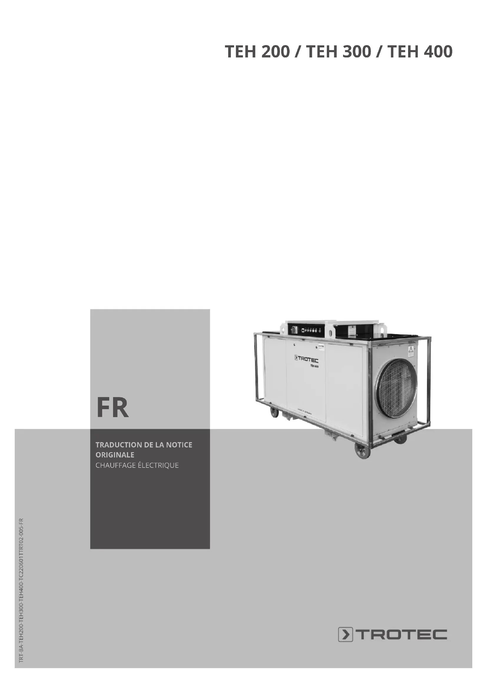 - Déclaration de conformité Remarques concernant la notice Symboles Avertissement relatif à la tension électrique Ce symbole indique que la tension électrique cause des risques pour la vie et la santé des personnes. Avertissement de surface chaude Ce symbole indique que les surfaces brûlantes causent des risques pour la vie et la santé des personnes. Avertissement Cette mention d’avertissement indique un risque moyen qui peut entraîner des blessures graves ou mortelles s’il n’est pas évité. Attention Cette mention d’avertissement indique un risque faible qui peut entraîner des blessures bénignes ou moyennes s’il n’est pas évité. Remarque Cette mention d’avertissement indique des informations importantes (par ex. dommages matériels), mais aucun danger. Info Les indications présentant ce symbole vous aident à exécuter vos tâches rapidement et en toute sécurité. Observer le mode d’emploi Ce symbole vous indique qu’il est nécessaire d’observer la notice d'instructions. Vous pouvez télécharger la dernière version de la notice d’instructions en suivant le lien ci-dessous: TEH 200 https://hub.trotec.com/?id=42896 TEH 300 https://hub.trotec.com/?id=42897 TEH 400 https://hub.trotec.com/?id=42898 Sécurité Veuillez lire attentivement le présent manuel avant la mise en service ou l'utilisation de l'appareil et conservez-le à proximité immédiate du site d'installation ou de l'appareil même. Avertissement Lisez toutes les consignes de sécurité et toutes les instructions. Le non-respect des consignes de sécurité et des instructions risque de provoquer une électrocution, un incendie et/ou de graves blessures. Conservez toutes les consignes de sécurité et toutes les instructions pour pouvoir vous y reporter ultérieurement. p. 32