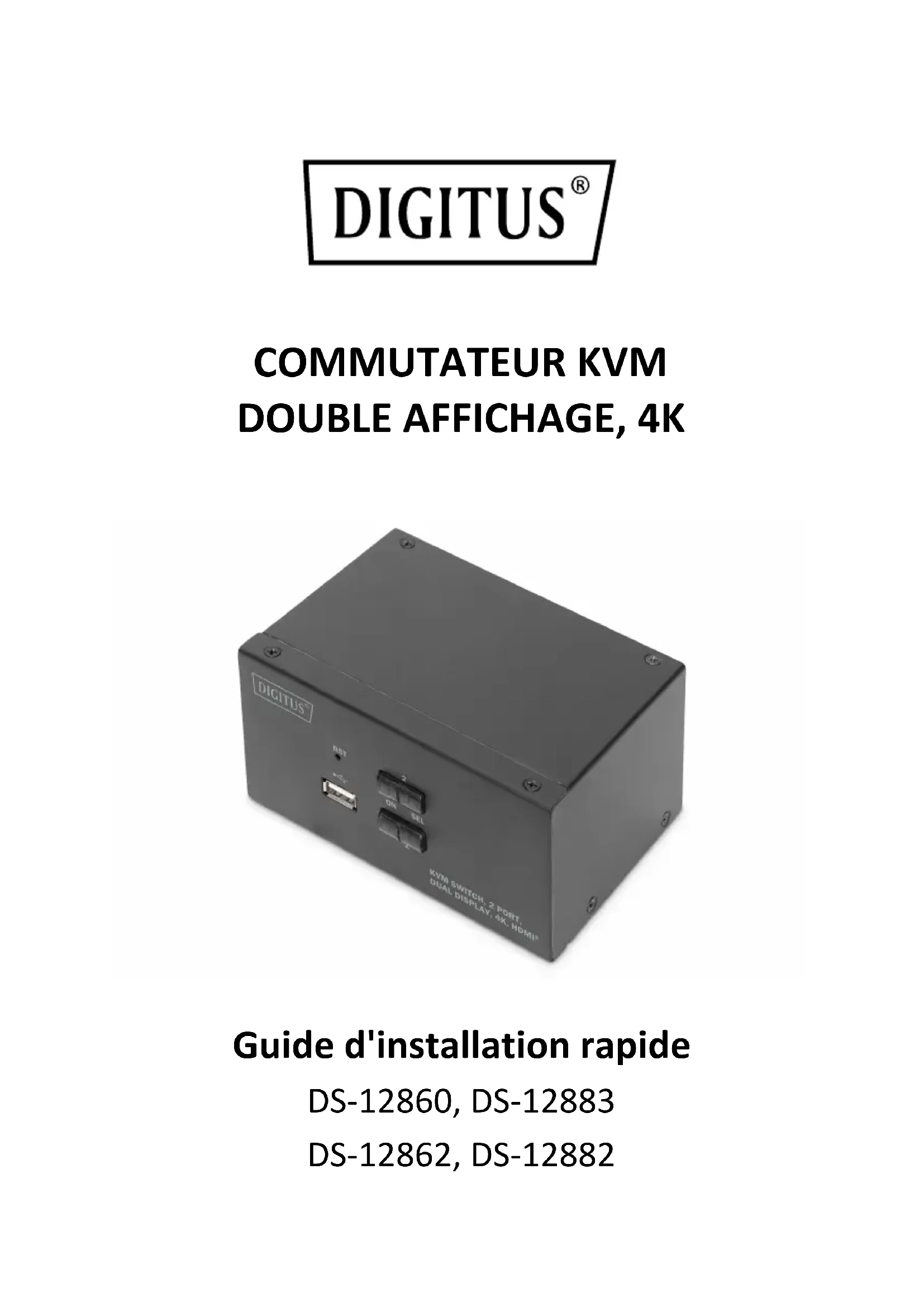 Guide d'installation rapide DS-12860, DS-12883 DS-12862, DS-128822 À l'attention des utilisateurs Le fabricant se réserve le droit de modifier et de changer les informations, documents et spécifications contenus dans le guide d'installation rapide sans préavis. Si le logiciel s'avère défectueux après l'achat, l'acheteur sera responsable de toutes les interventions et réparations nécessaires ainsi que de tout dommage accidentel ou consécutif causé par le logiciel. Le fabricant n'est pas responsable des éventuelles interférences radio et / ou télévisuelles provoquées à la suite de modifications non autorisées de cet équipement. L'utilisateur est responsable de la correction de ces interférences. Si le réglage de la tension de fonctionnement n'est pas correctement sélectionné avant l'utilisation, le fabricant ne sera pas responsable des dommages éventuels causés. Assurez-vous de confirmer que la tension est correctement réglée avant de l'utiliser. Ce produit ne dispose pas d'une alimentation électrique. Si l'alimentation électrique est nécessaire dans un environnement spécial, le client peut la configurer en fonction de l'interface d'alimentation du produit (prise d'alimentation 5,5 mm x 2,1 mm) et des caractéristiques de la prise d'alimentation. Contenu de la livraison Les éléments suivants sont inclus dans le colis du commutateur KVM multi- ordinateurs : DS-12860 1 x commutateur KVM, 2 ports, double affichage, 4K, HDMI® 2 x câble HMDI® 2 x câble KVM (HDMI, USB, audio) 1 x guide d'installation rapide DS-12883 1 x commutateur KVM, 4 ports, double affichage, 4K, HDMI® 4 x câble HMDI® 4 x câble KVM (HDMI, USB, audio) 1 x guide d'installation rapide3 DS-12862 1 x commutateur KVM, 2 ports, double affichage, 4K, DisplayPort® 2 x câble DisplayPort® 2 x câble KVM (DisplayPort, USB, audio) 1 x guide d'installation rapide DS-12882 1 x commutateur KVM, 4 ports, double affichage, 4K, DisplayPort® 4 x câble DisplayPort® 4 x câble KVM (DisplayPort, USB, audio) 1 x guide d'installation rapide Veuillez vérifier que tous les éléments sont présents et qu'ils n'ont pas été endommagés pendant le transport. Si vous rencontrer des problèmes, veuillez contacter votre revendeur. Pour éviter d'endommager le produit ou les équipements connectés au produit, veuillez lire attentivement ce guide d'installation rapide et suivre les instructions d'installation et d'utilisation.