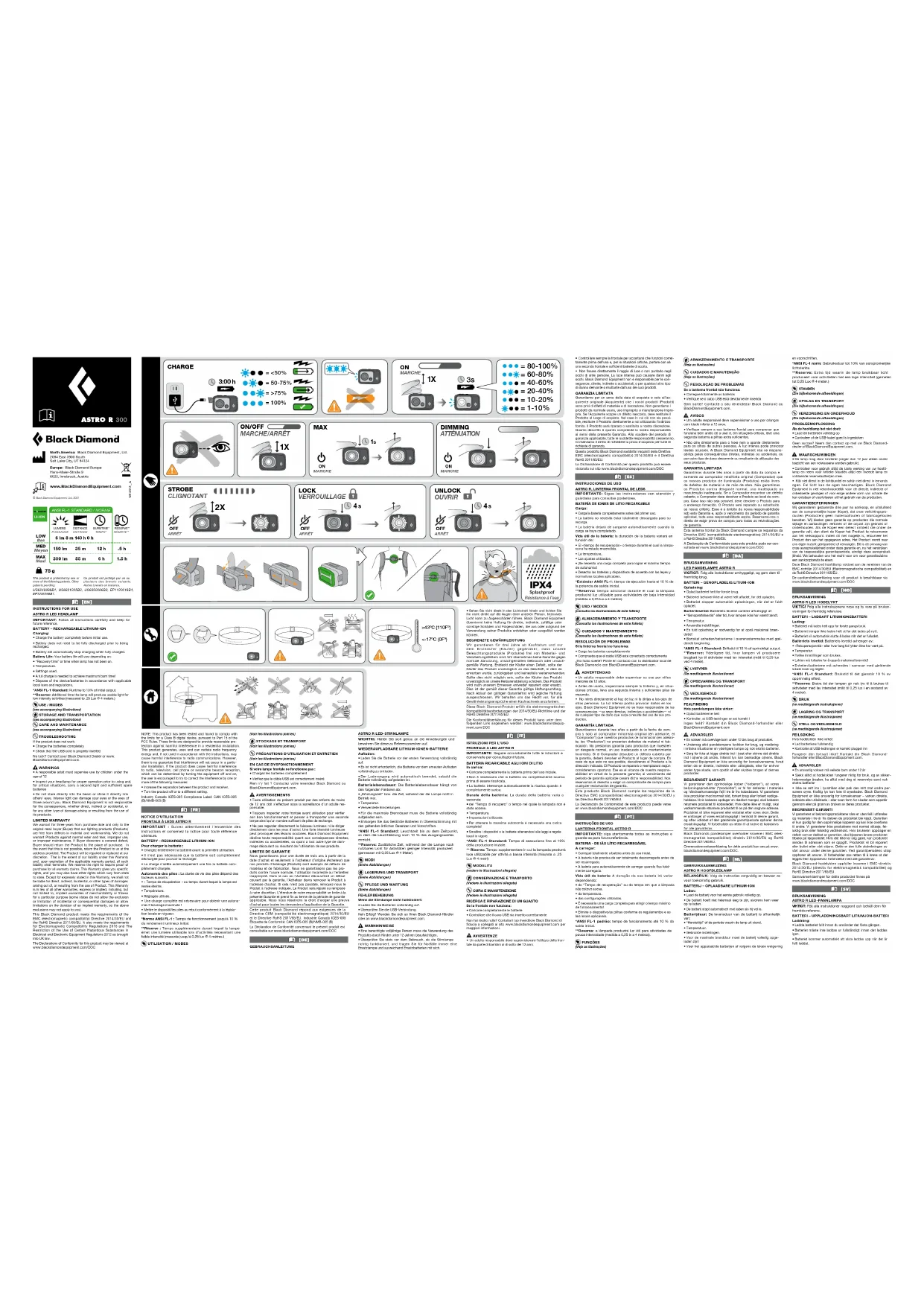 - Une charge complète est nécessaire pour obtenir une autono- mie d’éclairage maximale !• Mettre le dispositif/les piles au rebut conformément à la législa-tion locale en vigueur.*Norme ANSI FL-1 : Temps de fonctionnement jusqu’à 10 % du rendement lumineux initial.**Réserve : Temps supplémentaire durant lequel la lampe émet une lumière utilisable lors d’activités nécessitant une faible intensité (mesurée jusqu’à 0,25 lux @ 4 mètres.)UTILISATION / MODES(Voir les illustrations jointes)STOCKAGE ET TRANSPORT(Voir les illustrations jointes)PRÉCAUTIONS D’UTILISATION ET ENTRETIEN (Voir les illustrations jointes)EN CAS DE DYSFONCTIONNEMENTSi votre lampe frontale ne fonctionne pas :• Chargez les batteries complètement• Vérifiez que le câble USB est correctement inséréRien n’y fait ? Contactez votre revendeur Black Diamond ou BlackDiamondEquipment.com.AVERTISSEMENTS• Toute utilisation du présent produit par des enfants de moins de 12 ans doit s’effectuer sous la surveillance d’un adulte res-ponsable.• Toujours inspecter votre frontale avant utilisation pour vérifier son bon fonctionnement et penser à transporter une seconde lampe ainsi qu’un nombre suffisant de piles de rechange.• Ne pas regarder directement le faisceau lumineux ni le diriger directement dans les yeux d’autrui. Une forte intensité lumineuse peut provoquer des lésions oculaires. Black Diamond Equipment décline toute responsabilité quant aux conséquences directes, indirectes ou accidentelles, ou quant à tout autre type de dom-mage découlant ou résultant de l’utilisation de ses produits.LIMITES DE GARANTIENous garantissons pour une durée de trois ans à partir de la date d’achat et seulement à l’acheteur d’origine (Acheteur) que nos produits d’éclairage (Produits) sont exempts de défauts de matériau et de fabrication. Nous ne garantissons pas les pro-duits contre l’usure normale, l’utilisation incorrecte ou l’entretien inapproprié. Dans le cas où l’Acheteur découvrirait un défaut couvert par la garantie, l’Acheteur devra renvoyer le Produit à l’adresse d’achat. Si cela n’est pas possible, renvoyez-nous le Produit à l’adresse indiquée. Le Produit sera réparé ou remplacé à notre discrétion. L’étendue de notre responsabilité se limite à la présente Garantie et prend fin au terme de la période de garantie applicable. Nous nous réservons le droit d’exiger une preuve d’achat pour toutes les demandes d’application de la Garantie.Cette produit Black Diamond répond aux exigences de la Directive CEM (compatibilité électromagnétique) 2014/30/EU et le Directive RoHS 2011/65/EU. Industrie Canada ICES-005 Étiquette de Conformíté: CAN ICES-005 (B)/NMB-005 (B)La Déclaration de Conformité concernant le présent produit est consultable sur www.blackdiamondequipment.com/DOC [DE]GEBRAUCHSANLEITUNGASTRO R LED-STIRNLAMPEWICHTIG: Halten Sie sich genau an die Anweisungen und bewahren Sie diese zu Referenzzwecken auf. WIEDERAUFLADBARE LITHIUM-IONEN-BATTERIEAufladen:• Laden Sie die Batterie vor der ersten Verwendung vollständig auf.