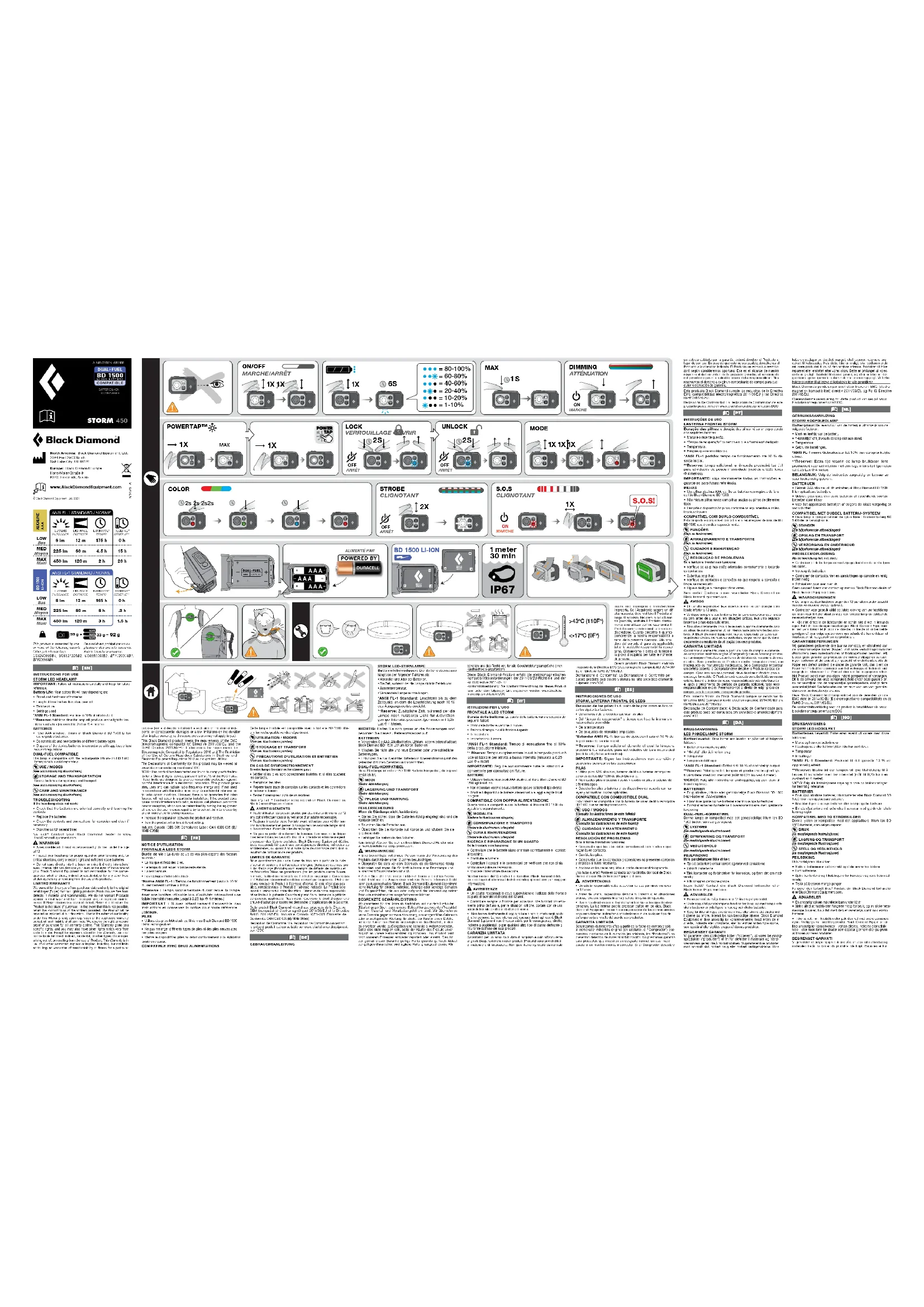 Nous garantissons pour une durée de trois ans à partir de la date d’achat et seulement à l’acheteur d’origine (Acheteur) que nos pro- duits d’éclairage (Produits) sont exempts de défauts de matériau et de fabrication. Nous ne garantissons pas les produits contre l’usure normale, l’utilisation incorrecte ou l’entretien inapproprié. Dans le cas où l’Acheteur découvrirait un défaut couvert par la garantie, l’Acheteur devra renvoyer le Produit à l’adresse d’achat. Si cela n’est pas pos- sible, renvoyez-nous le Produit à l’adresse indiquée. Le Produit sera réparé ou remplacé à notre discrétion. L’étendue de notre responsabil- ité se limite à la présente Garantie et prend fin au terme de la période de garantie applicable. Nous nous réservons le droit d’exiger une preuve d’achat pour toutes les demandes d’application de la Garantie. Cette produit Black Diamond répond aux exigences de la Directive CEM (compatibilité électromagnétique) 2014/30/EU et le Directive RoHS 2011/65/EU. Industrie Canada ICES-005 Étiquette de Conformíté: CAN ICES-005 (B)/NMB-005(B) Déclaration De Conformité : La Déclaration de Conformité concernant le présent produit est consultable sur www.blackdiamondequipment. com/DOC [DE] GEBRAUCHSANLEITUNG STORM LED-STIRNLAMPE Batterielebensdauer: Die Batterielebensdauer hängt von den folgenden Faktoren ab: