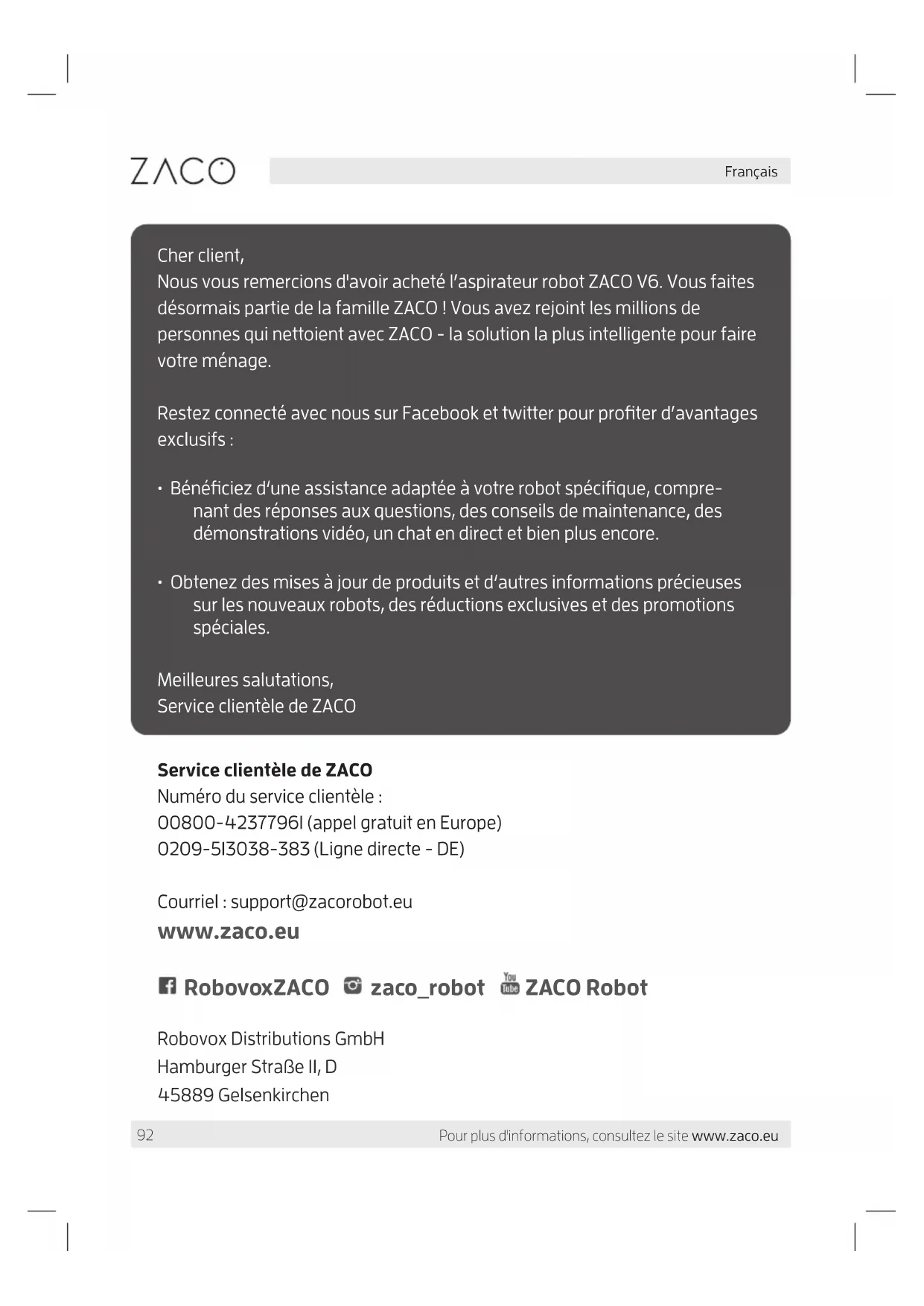 Service clientèle de ZACO Numéro du service clientèle : 00800-42377961 (appel gratuit en Europe) 0209-513038-383 (Ligne directe - DE) Courriel : support@zacorobot.eu www.zaco.eu Dear Customer, thank you for purchasing ZACO A10 robot vacuum cleaner! You‘ve joined the millions of people who clean with robots - the smarter way to get it down. Please take a few moments to read this manual and get acquainted with your robot, to get the best performance from your robot. lf you have any problem, please don‘t worry, you are supposed to contact our customer service first or visit our website at www.zacorobot.eu for more information. Best regards, ZACO Customer Service RobovoxZACO zaco_robot ZACO Robot Robovox Distributions GmbH Hamburger Straße 11, D 45889 Gelsenkirchen Cher client, Nous vous remercions d'avoir acheté l’aspirateur robot ZACO V6. Vous faites désormais partie de la famille ZACO ! Vous avez rejoint les millions de personnes qui nettoient avec ZACO - la solution la plus intelligente pour faire votre ménage. Restez connecté avec nous sur Facebook et twitter pour profiter d’avantages exclusifs :