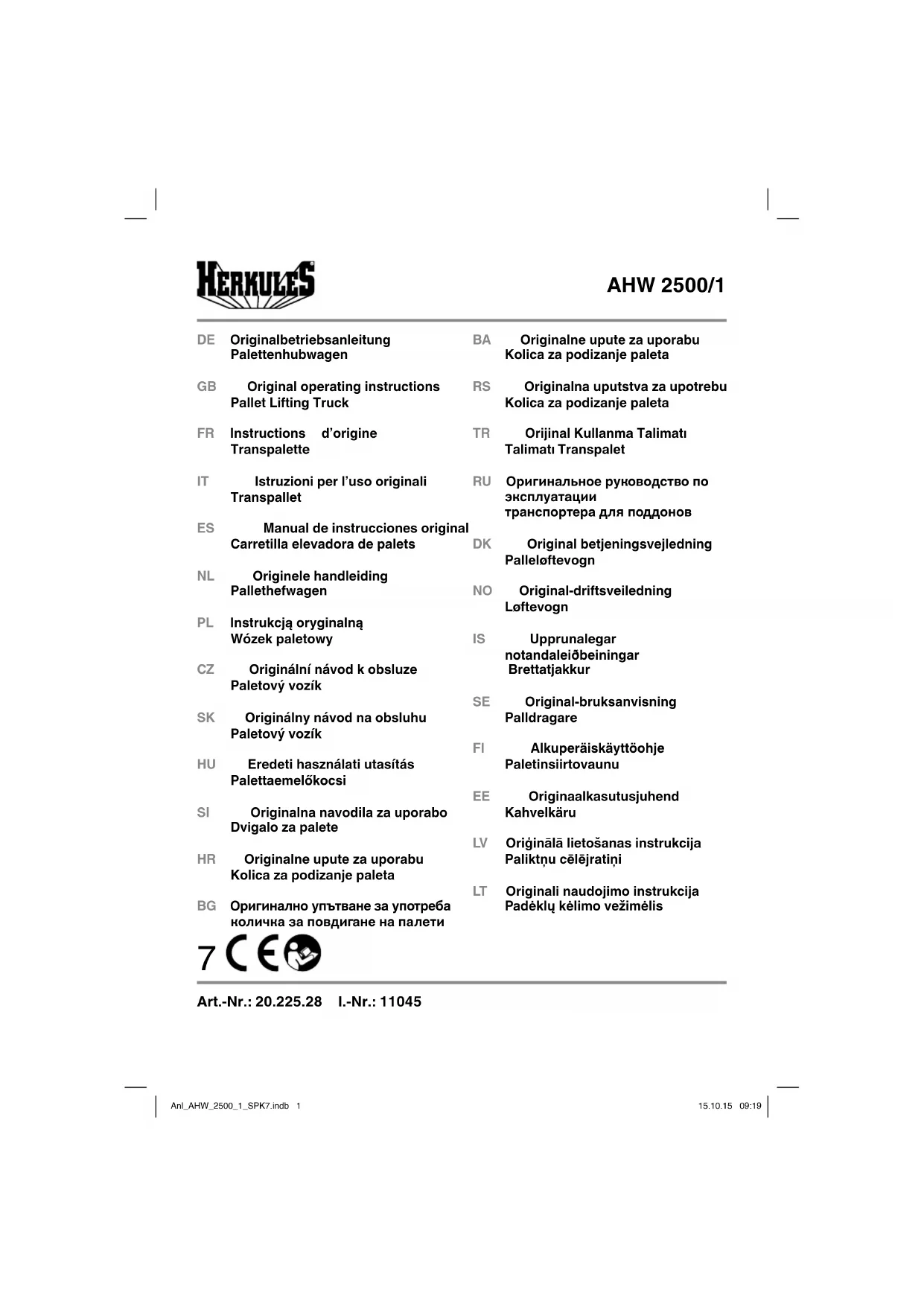 Pour maintenir le transpalette en état de fonction- ner, il faut le contrôler et en faire la maintenance régulièrement. Tous les travaux de réparation et de maintenance qui ne sont pas listés ici sont à faire faire par un service après-vente ou un spéci- aliste agréé. Cela est valable en particulier pour le remplacement des roues directrices et des galets sous fourches. En cas de dysfonctionnement, le transpalette est à mettre hors service immédiatement et doit être réparé par une personne agréé. Il faut utiliser ex- clusivement des pièces d‘origine. Le transpalette doit être contrôlé par un spécia- liste, au moins une fois par an, si besoin est, plus Anl_AHW_2500_1_SPK7.indb 18Anl_AHW_2500_1_SPK7.indb 18 15.10.15 09:1915.10.15 09:19FR