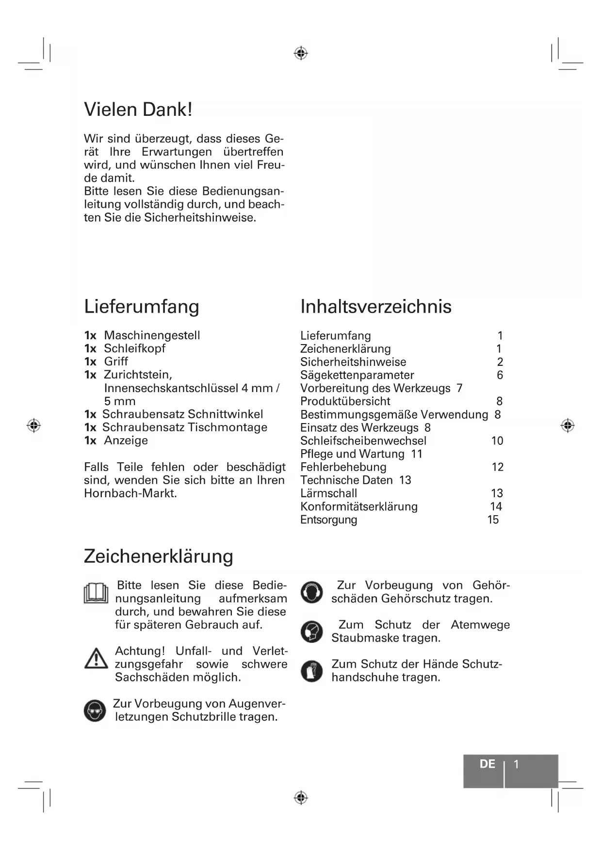 Merci! Nous sommes convaincus que cette machine dépassera vos attentes et vous souhaitons beaucoup de plaisir à l'utiliser. S'assurer de lire entièrement le présent manuel et d'observer les consignes de sécurité. Symboles Lire attentivement le présent manuel de l'utilisateur et le conserver pour s'y reporter ul- térieurement. Avertissement d'accidents et de blessures corporelles et de dommages matériels impor- tants. Porter des lunettes de sécurité pour protéger vos yeux. Porter une protection auditive pour protéger vos oreilles. Porter un masque anti-pous- sière pour protéger vos voies respiratoires. Porter des gants de protection pour protéger vos mains. Fournitures 1x Support de machine 1x Tête de machine 1x Poignée 1x Pierre à ébarber, clé Allen 4mm / 5mm 1x Kit de vissage de l'angle de coupe 1x Kit de vissage pour le montage sur table 1x Indicateur Si des pièces sont manquantes ou endommagées, contacter votre ma- gasin Hornbach. Table des matières Fournitures 17 Symboles 17 Consignes de sécurité 18 Paramètres de la chaîne 22 Préparation de la machine 23 Vue d'ensemble du produit 24 Utilisation conforme 24 Utilisation de la machine 24 Remplacement de la meule 26 Entretien & Maintenance 27 Dépannage 28 Caractéristiques techniques 29 Bruit 29 Déclaration de conformité 30 Élimination 31FR