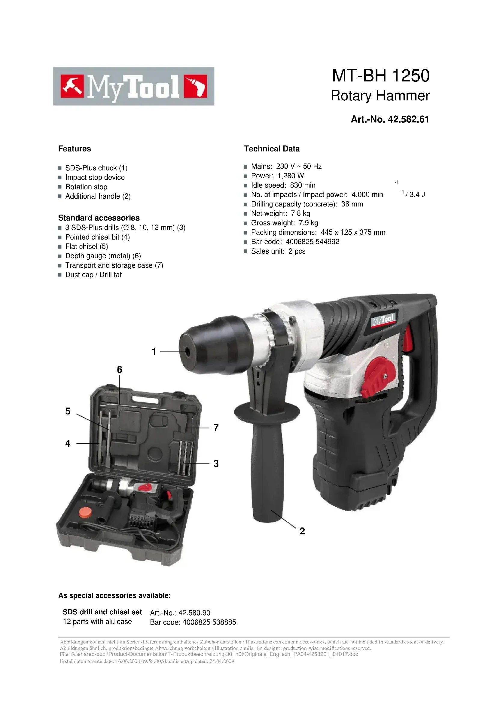 | Caractéristiques techniques | Marteau MyTool MT-BH 1250, puissance 1250W, poids 3.5 kg, fréquence de frappe 3000 bpm. |