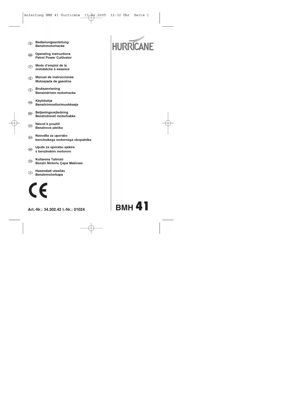 Anleitung BMH 41 Hurricane 13.04.2005 12:32 Uhr Seite 101. Consignes de sécurité Informations générales : Lisez le mode d’emploi minutieusement. Familiarisez-vous avec toutes les pièces de réglage et prenez connaissance des consignes permettant d’employer l’appareil dans les règles de l’art. Ne permettez jamais à des enfants ou à d’aut- res des personnes n’ayant pas connaissance des instructions d’emploi d’utiliser la machine. Des prescriptions locales peuvent déterminer l’âge minimum requis des utilisateurs. N’utilisez jamais l’appareil pendant que des personnes, en particulier des enfants ou encore des animaux domestiques se trouvent à sa pro- ximité. Pensez au fait que la personne opératrice ou l’utilisatrice est responsable en cas d’accidents avec d’autres personnes ou en cas de domma- ges à la propriété d’autrui. Mesures préalables : Pendant le travail, portez toujours des chaussu- res stables et des pantalons longs. N’exploitez jamais la machine pieds nus ou en légères san- dales. Contrôlez entièrement le terrain sur lequel vous allez employer l’appareil et retirez tous les objets pouvant être éjectés par la machine. Avertissement! - L’essence est extrêmement inflammable ! Conservez l’essence uniquement dans des réservoirs prévus à cet effet. Faites le plein uniquement à l’air libre et ne fumez pas pendant le remplissage. Il faut remplir l’essence avant de démarrer le moteur. Pendant que le moteur fonctionne ou lorsque le moteur est chaud, il est interdit d’ou- vrir le bouchon de fermeture du réservoir d’es- sence et de remplir de l’essence. Si de l’essence déborde, il ne faut surtout pas essayer de mettre le moteur en marche. Au lieu de cela, il faut éloigner l’appareil de l’endroit sali par l’essence. Il faut ensuite éviter tout essai d’allumage de l’appareil tant que les vapeurs d’essence ne se sont pas évaporées. Pour des raisons de sécurité, il faut remplacer (régulièrement) le réservoir à essence et son bouchon. Remplacez les pots d’échappement endom- magés. Avant l’utilisation, il faut toujours contrôler à vue si les outils sont usés ou endommagés. Pour éviter tout balourd, les pièces endommagées ou usées et les boulons de fixation doivent être uni- quement remplacés par jeu. Manipulation : Le moteur ne doit pas fonctionner dans des locaux fermés dans lesquels le monoxyde de carbone, substance dangereuse, pourrait se concentrer. _Travaillez uniquement à la lumière du jour ou sous bon éclairage. Veillez à toujours garder une position équilibrée sur les pentes. Ne guidez l’appareil qu’au pas. Pour les machines sur roues : Travaillez trans- versalement par rapport à la pente, jamais en la montant ni en la descendant. Faites particulièrement attention lorsque vous changez de direction sur une pente. Faites preuve d’une très grande prudence lors- que vous faites demi-tour avec la machine ou que vous la tirez vers vous. Ne modifiez jamais le réglage de base du moteur ni ne le faites tourner trop vite. Faites démarrer le moteur avec précaution, con- formément aux indications du producteur et veil- lez à garder une distance suffisante entre vos pieds et l’outil ou les outils. Ne mettez jamais les mains ou les pieds sur ou sous des pièces en rotation. Ne levez ni ne portez jamais une machine lors- que son moteur est en marche. Il faut éteindre le moteur. - toujours, lorsque vous laissez la machine seule ; - avant de remplir d’essence ; - lorsque le moteur tourne à vide, il faut fermer la soupape d’étranglement. Si la machine dispose d’un robinet de d’arrêt de l’essence, il faut le fermer après les travaux Pour des raisons de sécurité, la vitesse de rota- tion du moteur ne doit pas dépasser les données indiquées sur la plaque de puissance. Faites démarrer le moteur avec précaution et conformément au mode d’emploi. Lorsque le moteur est en marche, ne vous approchez en aucun cas des pièces en mouvement. Maintenance et entreposage : Assurez-vous toujours que tous les écrous, vis et boulons sont bien serrés et que l’appareil se trouve dans un état de fonctionnement en toute sécurité ; Ne conservez jamais l’appareil avec de l’essen- ce dans le réservoir à l’intérieur d’un bâtiment dans lequel probablement les vapeurs d’essen- ce pourraient entrer en contact avec du feu ou des étincelles ou pourraient s’enflammer ; Laissez le moteur refroidir avant de mettre l’ap- pareil dans des locaux fermés ; Pour éviter tout risque d’incendie, maintenez le moteur et le pot d’échappement exempts de matériau végétal ou sans graisse (huile) qui déborde ; Remplacez les pièces usées ou endommagées pour des raisons de sécurité ; Si le réservoir doit être vidangé, il faut le réaliser à l’air libre.