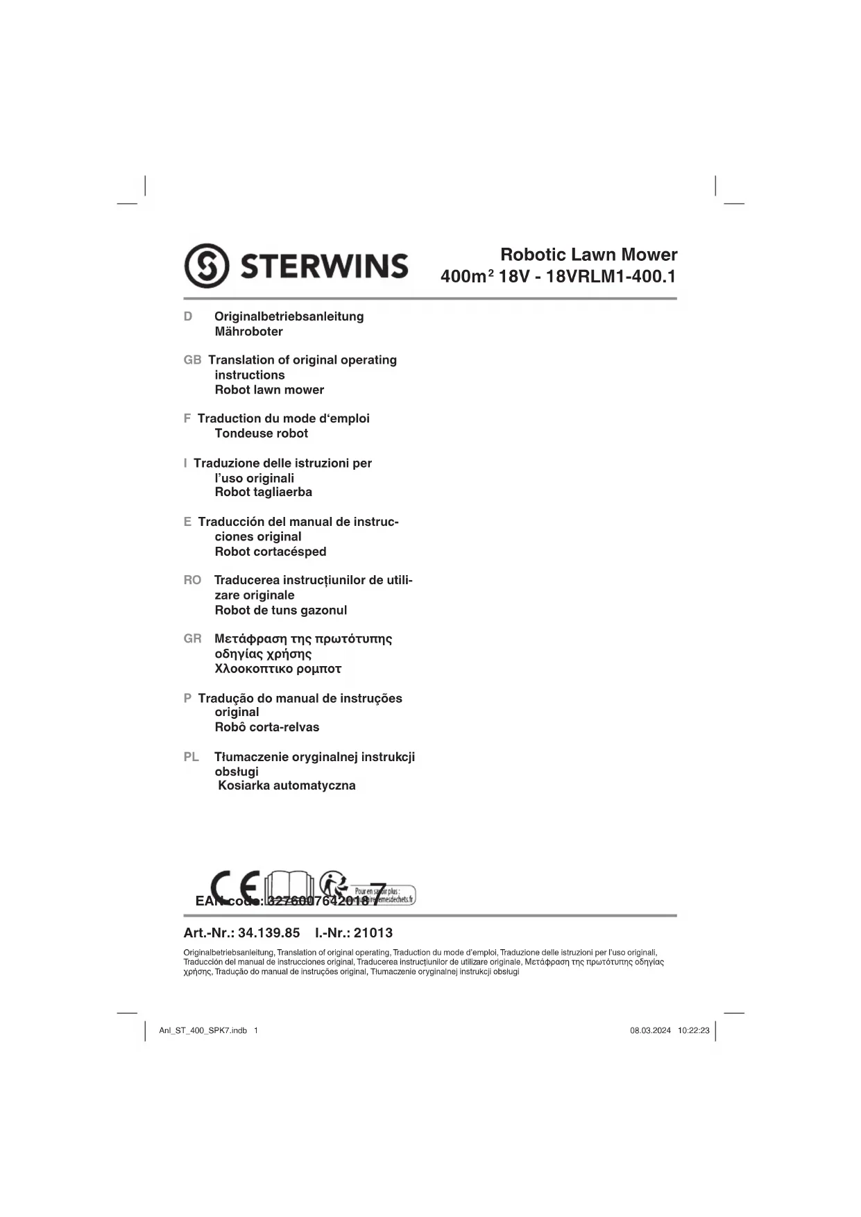 Retrouvez gratuitement la notice de l'appareil Robotic Lawn Mower 400m2 18V STERWINS au format PDF.