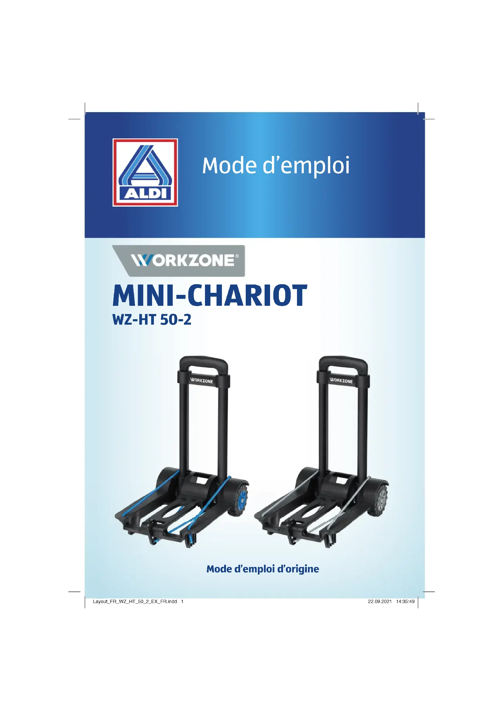 - Commande ou maintenance du mini-chariot par des personnes qui ne comprennent pas les risques associés et/ou ne sont pas Layout_FR_WZ_HT_50_2_EX_FR.indd 7Layout_FR_WZ_HT_50_2_EX_FR.indd 7 22.09.2021 14:35:5222.09.2021 14:35:528 Sécurité familiarisées avec la manipulation du mini-chariot. Risques résiduels Malgré l’emploi conforme à l’affectation, des risques résiduels non évidents ne peuvent pas être entièrement exclus. En raison du type de mini-chariot, les risques suivants peuvent apparaître : Risque de blessure ! Lors du montage du produit, vous pouvez vous coincer les doigts. Soyez très prudents lorsque vous dépliez et repliez le produit. Consignes de sécurité Veuillez lire toutes les consignes de sécurité et instructions. Toute omission lors du respect des consignes de sécurité et instruc- tions peut entraîner de graves blessures. − Les enfants n’ont pas le droit de jouer avec le mini-chariot ou le câble de tension. Le nettoyage et l’entretien ne doivent pas être effectués par des enfants sans surveillance. − Tenez les enfants à l’écart du mini-chariot. − L’appareil et le matériel d’emballage ne sont pas des jouets ! Il est interdit de laisser des enfants jouer avec des sacs et des films en plastique ou avec des pièces de petite taille ! Ils risquent de les avaler et de s’étouffer ! − Le mini-chariot est un outil qu’il faut toujours utiliser avec prudence. − Dépliez toujours entièrement la plaque de transport et assu- rez-vous que la plaque de transport et la poignée sont enclen- chées correctement avant d’utiliser le produit. Layout_FR_WZ_HT_50_2_EX_FR.indd 8Layout_FR_WZ_HT_50_2_EX_FR.indd 8 22.09.2021 14:35:5222.09.2021 14:35:529 Sécurité − Ne laissez pas le mini-chariot sans surveillance pendant son utilisation. − Chargez le mini-chariot toujours de façon à ce que la poignée en haut puisse être attrapée librement avec les mains. − Pour des raisons de sécurité, il ne faut pas dépasser la charge maximale de 50 kg. − Pour garder le contrôle sur le diable, la plaque de transport doit toujours être sollicitée uniformément. − Maintenez le centre de gravité de la charge toujours le plus bas possible. Pour ce faire placez les objets lourds tout en bas. − Assurez-vous que la charge ne glisse ou ne tombe pas pendant le transport. − Assurez-vous que la charge n’est pas plus large que le mini- chariot, en particulier lors du transport dans des couloirs étroits. − Ne transportez pas de personnes avec le diable. − Ne vous placez pas sur le mini-chariot. − N’utilisez pas le mini-chariot lorsqu’il est endommagé. − N’utilisez pas le mini-chariot pour des charges instables, desser- rées ou empilées de façon unilatérale. Chargez le produit toujours de sorte que le centre de gravité de la charge est aussi proche que possible du milieu du produit. − Avant chaque utilisation, contrôlez attentivement le bon fonction- nement du produit. − Lorsque vous poussez le mini-chariot, veillez toujours à avoir une bonne visibilité. N’empilez pas la charge au-delà de la hauteur de sécurité ou de sorte à entraver votre visibilité. − Lors du déplacement du produit, faites attention à ce qui se passe devant vous et ne marchez pas trop vite. − Lorsque vous poussez le mini-chariot, faites toujours attention à l’état de la charge. Arrêtez immédiatement lorsque la charge de- vient instable. Layout_FR_WZ_HT_50_2_EX_FR.indd 9Layout_FR_WZ_HT_50_2_EX_FR.indd 9 22.09.2021 14:35:5222.09.2021 14:35:5210 Sécurité − Ne tendez pas le câble de tension sur les coins et arêtes acérés. − Le câble de tension ne doit pas être utilisé pour lever des charges. − N’utilisez pas le câble de tension lorsqu’il est endommagé. − Lorsque le câble de tension est sollicité de manière exagérée, ce- lui-ci peut rompre et rebondir dangereusement ! − Faites réparer votre appareil uniquement par un personnel spé- cialisé qualifié et uniquement en utilisant des pièces de rechange d’origine. Cela permet de conserver la sûreté de l’appareil. − Sécurisez également les grandes pièces contre la charge du vent ! Conservez bien ces consignes de sécurité ! Layout_FR_WZ_HT_50_2_EX_FR.indd 10Layout_FR_WZ_HT_50_2_EX_FR.indd 10 22.09.2021 14:35:5322.09.2021 14:35:5311 Première mise en service Première mise en service Contrôler le mini-chariot et le contenu de la livraison Risque de détérioration ! Si vous ouvrez imprudemment l’emballage avec un couteau affûté ou d’autres objets pointus, le mini-chariot peut être endommagé rapidement.