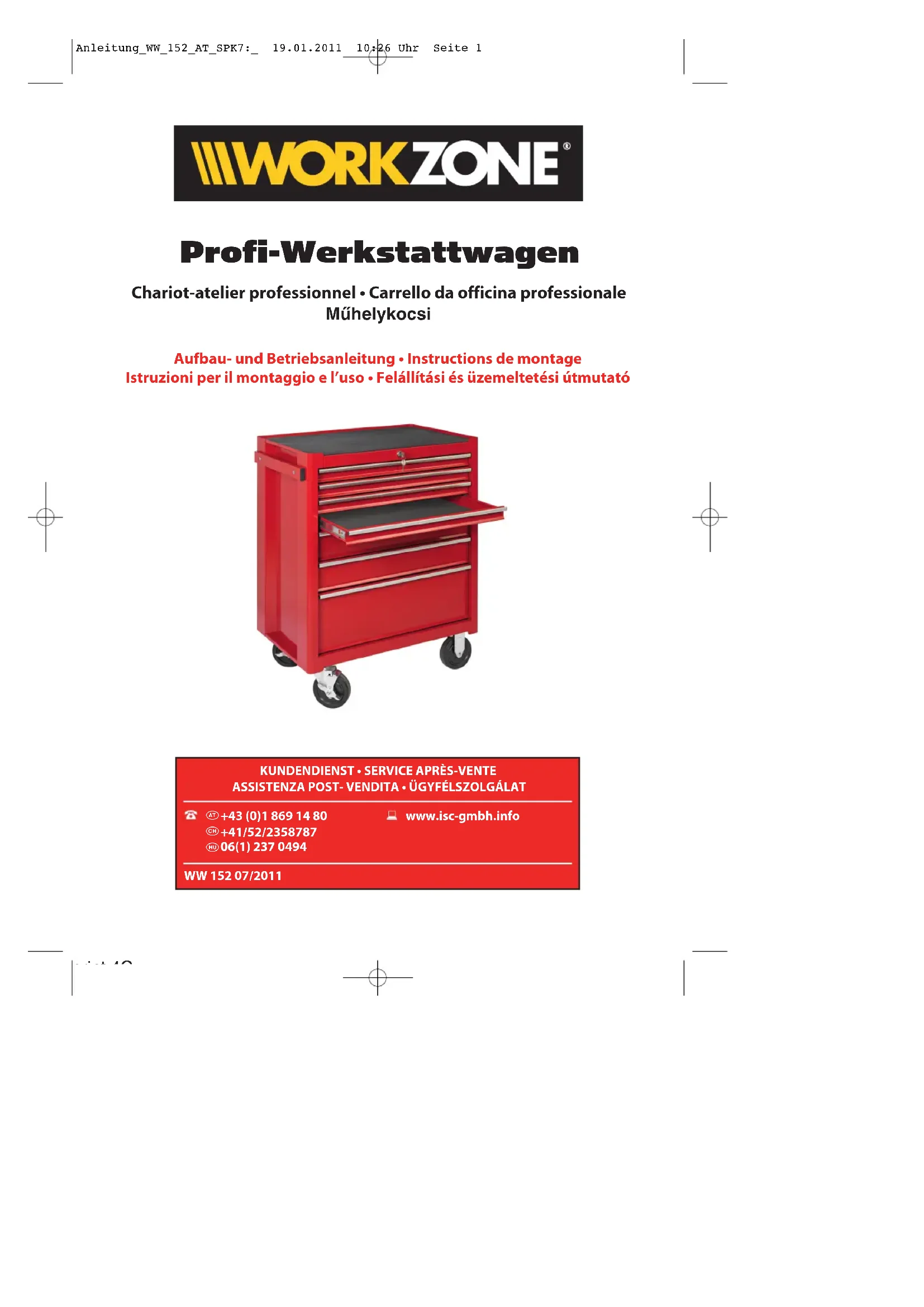KUNDENDIENST • SERVICE APRÈS-VENTE • ASSISTENZA POST- VENDITA - WW 152 - www.isc-gmbh.info +41/52/2358787 10 Anleitung_WW_152_AT_SPK7:_ 19.01.2011 10:27 Uhr Seite 104. Montage Attention ! Afin d’éviter les fausses manœuvres, veillez à ce que tous les tiroirs soient ENTIEREMENT fermés avant d’en sortir un ! 쎲 Une poignée (6), déjà montée, est incluse dans la livraison, elle peut néanmoins être montée de l’autre côté. (figure 2) 쎲 Pour le montage des roues (3), voyez la figure 3, pour cela, mettez le chariot à l’envers, c’est-à-dire la tête en bas. 쎲 Pour une bonne manoeuvrabilité, montez les deux roues tournantes pouvant être freinées du côté où se trouve la poignée. 쎲 Fixez chaque roue au chariot à l’aide de 4 x vis, une rondelle Grower et une rondelle simple. 쎲 Si vous avez des problèmes avec les tiroirs, suivez les indications suivantes Que faire si, un tiroir ne peut plus être fermé 쎲 fermer et ouvrir la serrure jusqu’à ce qu’un « clic » soit audible, ou 쎲 ouvrir un second tiroir puis refermer les deux ensemble, ou 쎲 Actionner le déverrouillage de secours (4) ! Cela se fait en déplaçant le déverrouillage de secours sur le dessous du chariot, Ce qui annule le verrouillage du chariot-atelier (cf. fig.4-6) Aucun tiroir ne peut être ouvert, bien que la serrure ne soit pas fermée 쎲 fermer et ouvrir la serrure jusqu’à ce qu’un « clic » soit audible, ou 쎲 actionner le déverrouillage de secours (4) ! (cf. fig. 4-6)