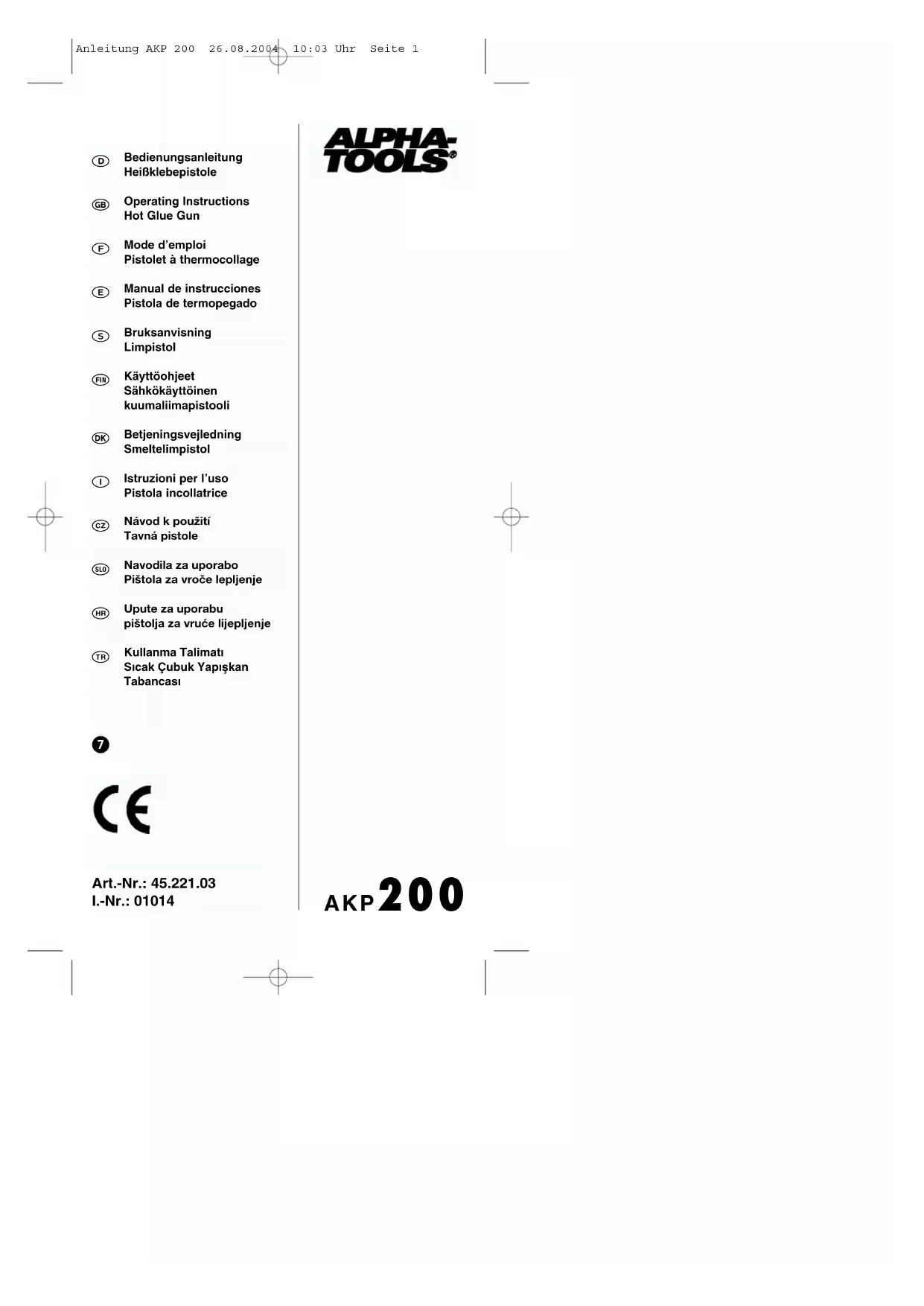 AKP 200 - Pistolet à colle Alpha Tools - Notice d'utilisation et mode d'emploi gratuit