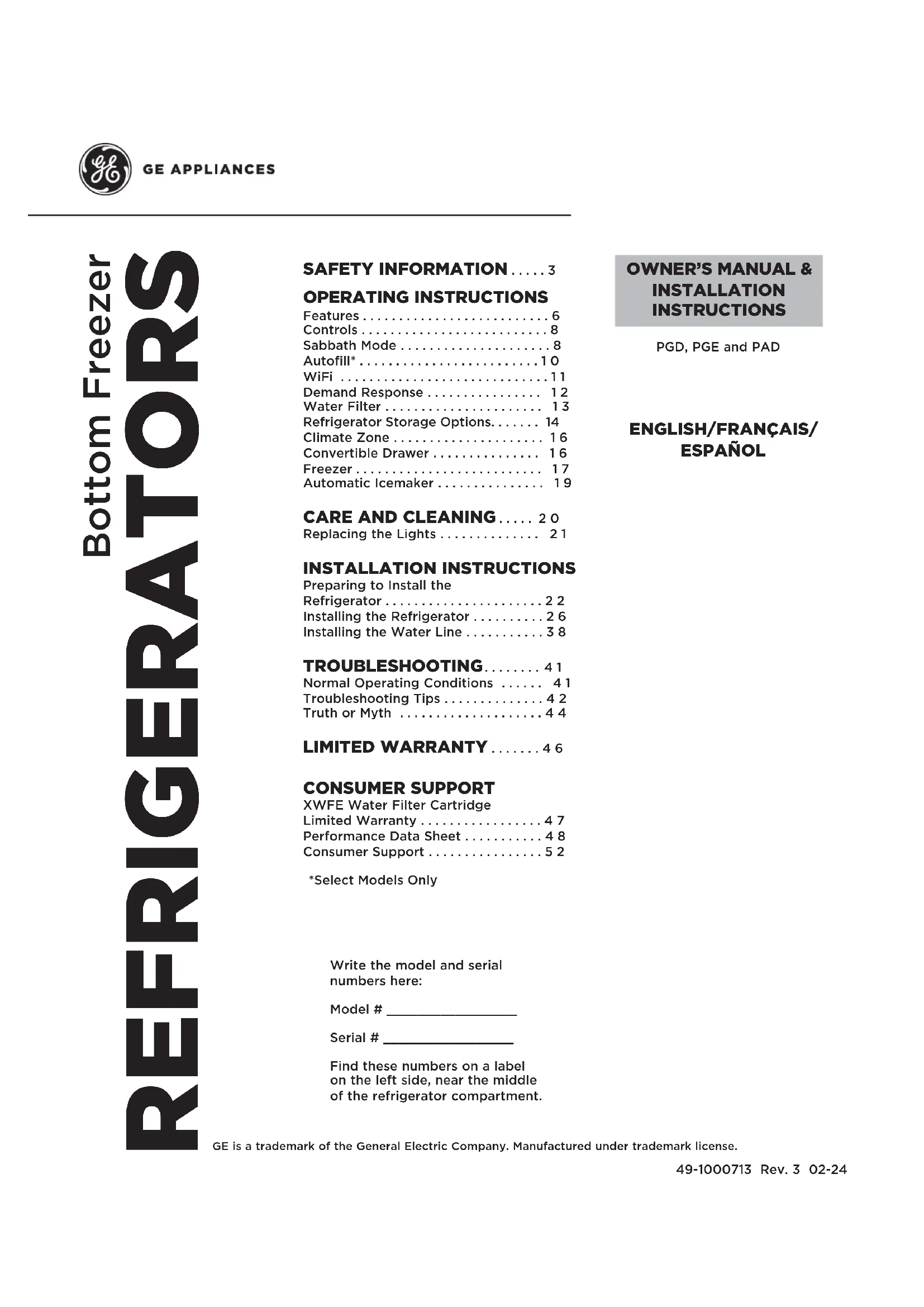délais prescrits permet une meilleure communication et un service rapide, selon les modalités de votre garantie, si besoin est. Vous pouvez également envoyer par courrier la carte d’enregistrement pré-imprimée qui se trouve dans l’emballage de votre appareil. $X[eWDWV8QLVGEAppliances.com/register $X&DQDGDProdsupport.mabe.ca/crm/Products/ProductRegistration.aspx Service de réparation 8QVHUYLFHGHUpSDUDWLRQH[SHUW*($SSOLDQFHVVHWURXYHjTXHOTXHVSDVGHFKH]YRXV5HQGH]YRXVVXUQRWUHVLWHHW programmez, à votre convenance, une visite de réparation à n’importe quel jour de l’année. $X[eWDWV8QLVGEAppliances.com/service RXFRPSRVH]OHGXUDQWOHVKHXUHVQRUPDOHVGHEXUHDX $X&DQDGDElectromenagersge.ca/fr/soutien/demande-de-serviceRXFRPSRVH]OH Prolongation de garantie Procurez-vous une prolongation de garantie GE Appliances et informez-vous des rabais spéciaux en vigueur pendant la durée de votre garantie. Vous pouvez vous la procurer en ligne en tout temps. Les services GE Appliances seront toujours disponibles DSUqVO¶H[SLUDWLRQGHODJDUDQWLH$X[eWDWV8QLV GEAppliances.com/extended-warrantyRXFRPSRVH]OHGXUDQWOHVKHXUHVQRUPDOHVGHEXUHDX $X&DQDGD Electromenagersge.ca/fr/soutien/achatd-une-garnntie-prolongee ou composez le 800.290.9029 Pièces et accessoires Les personnes ayant les compétences requises pour réparer elles-mêmes leurs appareils peuvent recevoir directement à la PDLVRQGHVSLqFHVRXDFFHVVRLUHVOHVFDUWHV9,6$0DVWHU&DUGHW'LVFRYHUVRQWDFFHSWpHV&RPPDQGH]HQOLJQHKHXUHVSDU jour. $X[eWDWV8QLVGEApplianceparts.comRXSDUWpOpSKRQHDXGXUDQWOHVKHXUHVQRUPDOHVGHEXUHDX Les instructions contenues dans le présent manuel comportent des procédures que tout utilisateur peut effectuer. Les autres types de réparation doivent généralement être confiés à un technicien qualifié. Usez de prudence : une réparation ou un entretien mal effectués peuvent rendre l’utilisation de l’appareil dangereuse. /HVFRQVRPPDWHXUVDX&DQDGDGRLYHQWFRQVXOWHUOHVSDJHVMDXQHVSRXUFRQQDvWUHOHFHQWUHGHVHUYLFH0DEHOHSOXVSURFKH visiter notre site Web au Electromenagersge.ca/fr/produits/filtres-et-accessoiresRXFRPSRVHUOH Communiquez avec nous Si vous n’êtes pas satisfait du service après-vente de GE Appliances, communiquez avec nous depuis notre site Web en fournissant tous les détails dont votre numéro de téléphone, ou écrivez à : $X[eWDWV8QLV*HQHUDO0DQDJHU&XVWRPHU5HODWLRQV_*($SSOLDQFHV$SSOLDQFH3DUN_/RXLVYLOOH.< GEAppliances.com/ge/service-and-support/contact $X&DQDGD'LUHFWRU&XVWRPHU5HODWLRQV_0&&RPPHUFLDO,QF_6XLWH1RUWK6HUYLFH5RDG_%XUOLQJWRQ21//& Electromenagersge.ca/contactez-nous49-1000713 Rev. 3 02-24 REFRIGERADORES Congelador Inferior ESPAÑOL Modelos PGD, PGE y PAD MANUAL DEL PROPIETARIO E INSTRUCCIONES DE INSTALACIÓN