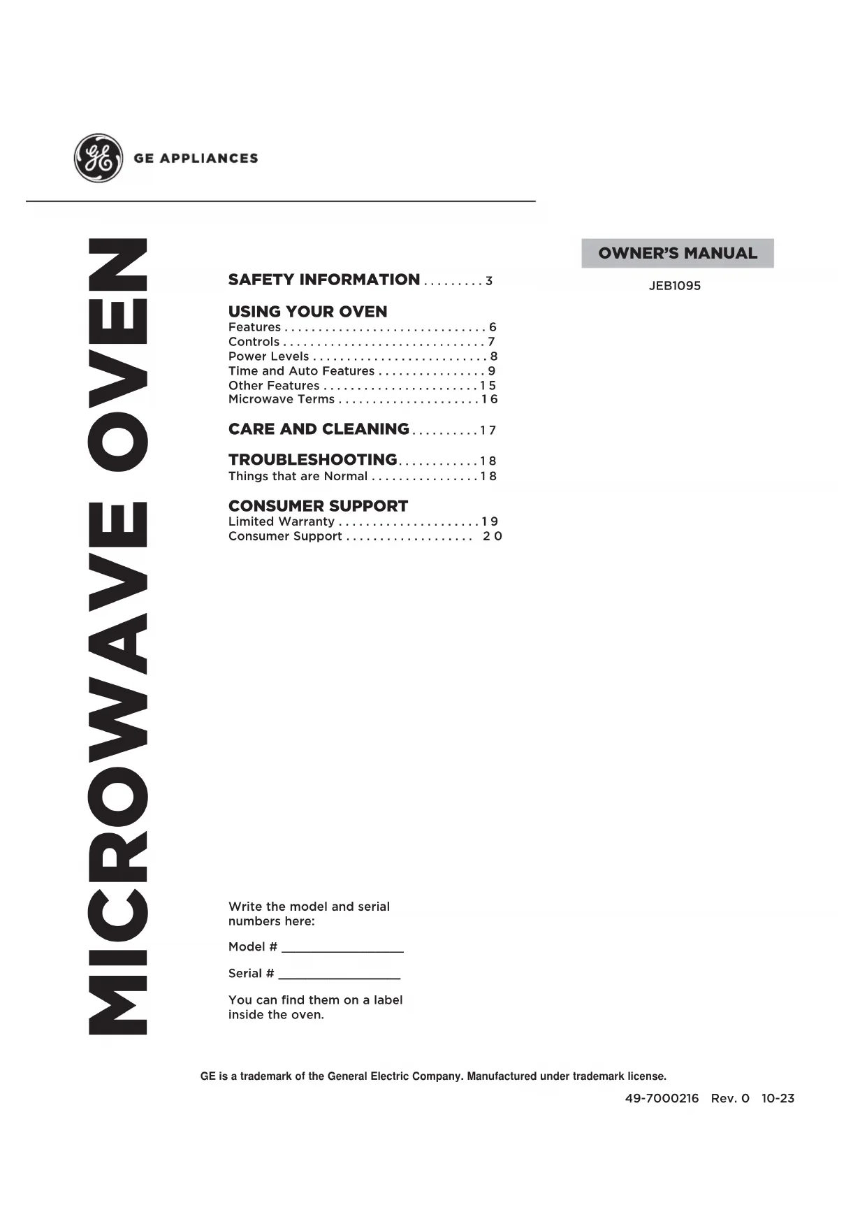 No de série ______________ Vous les trouverez sur l’étiquette à l’intérieur du four. Manuel d’utilisation JEB1095 JES1095 GE est une marque de commerce de General Electric Company. Fabriqué sous licence de marque. FOUR À MICRO-ONDES2 49-7000216 Rev. 0 NOUS VOUS REMERCIONS D’INTÉGRER GE APPLIANCES À VOTRE DEMEURE. Que vous ayez grandi avec des électroménagers GE Appliances ou qu’il s’agisse de votre première acquisition, nous sommes heureux de vous accueillir dans notre famille. Nous sommes fiers du savoir-faire, de l’innovation et du design qui constituent chaque électroménager GE, et nous pensons que vous le serez aussi. Nous vous rappelons que l’enregistrement de votre électroménager vous assure de recevoir des renseignements importants sur le produit et la garantie lorsque vous en avez besoin. Enregistrez votre électroménager GE en ligne dès maintenant. Des sites Web et des numéros de téléphone utiles figurent dans la section Soutien au consommateur de ce manuel d’utilisation. Vous pouvez également envoyer par courrier la carte d’enregistrement pré-imprimée qui se trouve dans l’emballage de votre appareil.49-7000216 Rev. 0 3 WARNING Afin de réduire le risque de brûlure, de choc électrique, d’incendie, de blessure corporelle ou d’exposition excessive aux micro-ondes : L’utilisation d’appareils électriques implique d’observer des précautions élémentaires, dont les suivantes :