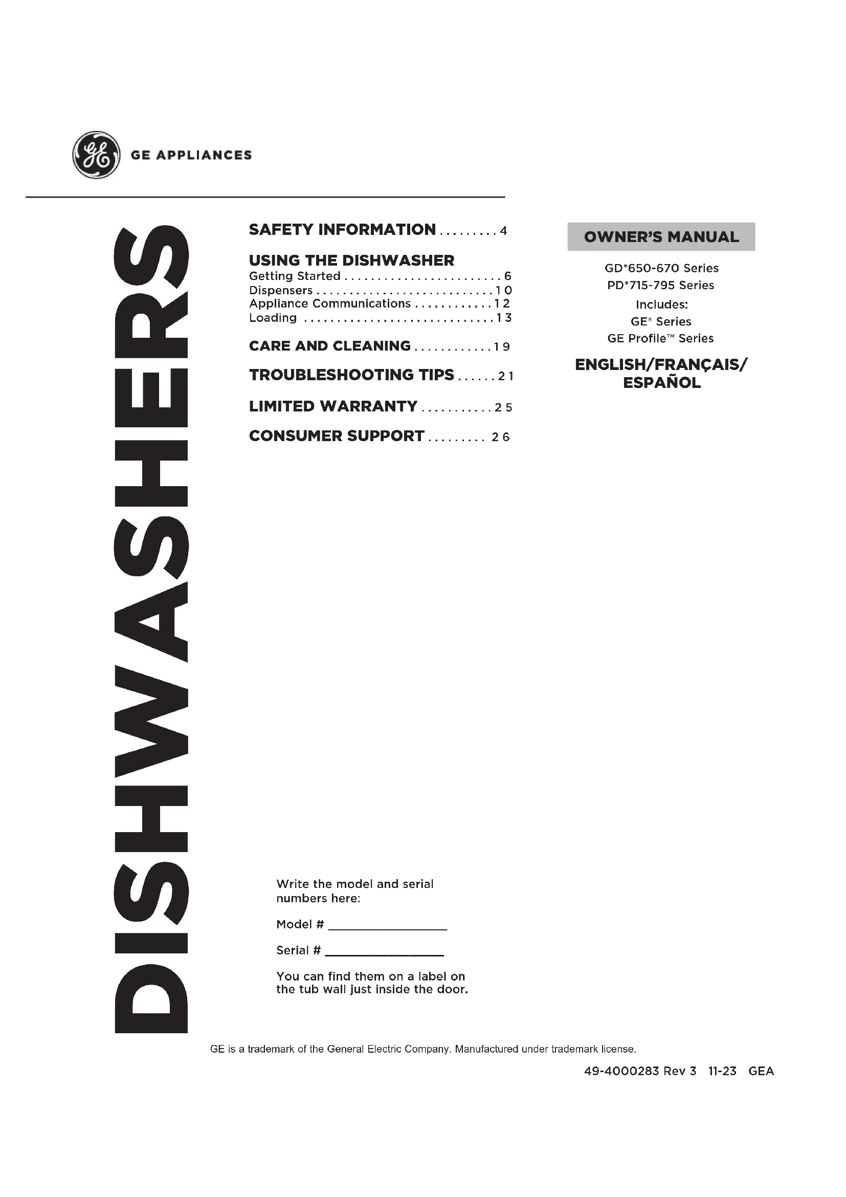 Burlington, ON L7L 6C7 GEAppliances.ca/contact-us or call 877.994.5366Inscrivez ci-dessous les numéros de modèle et de série N° de modèle ____________ N° de série ______________ Ils se trouvent sur la paroi de la cuve, à l’intérieur de la porte. GE est une marque déposée de General Electric Company. Fabriqué sous licence de marque. MANUEL D’UTILISATION LAVE-VAISSELLE