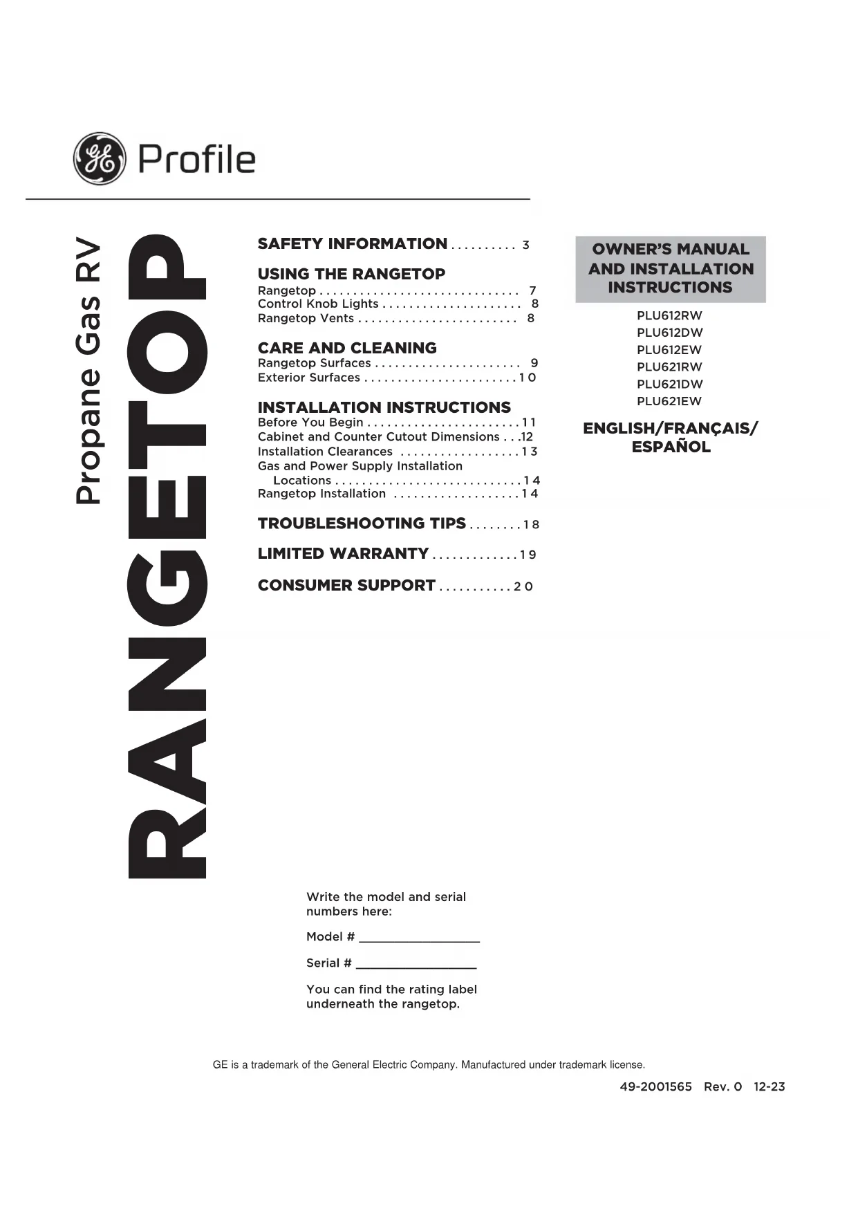 à gaz propane PLU612RW PLU612DW PLU612EW PLU621RW PLU621DW PLU621EW2 49-2001565 Rev. 0 NOUS VOUS REMERCIONS D’INTÉGRER GE APPLIANCES À VOTRE VÉHICULE RÉCRÉATIF. Que vous ayez grandi avec des électroménagers GE Appliances ou qu’il s’agisse de votre première acquisition, nous sommes heureux de vous accueillir dans notre famille. Nous sommes fiers du savoir-faire, de l’innovation et du design qui constituent chaque électroménager GE, et nous pensons que vous le serez aussi. Nous vous rappelons que l’enregistrement de votre électroménager vous assure de recevoir des renseignements importants sur le produit et la garantie lorsque vous en avez besoin. Enregistrez votre électroménager GE en ligne dès maintenant. Des sites Web et des numéros de téléphone utiles figurent dans la section Soutien au consommateur de ce manuel d’utilisation.349-2001565 Rev. 0