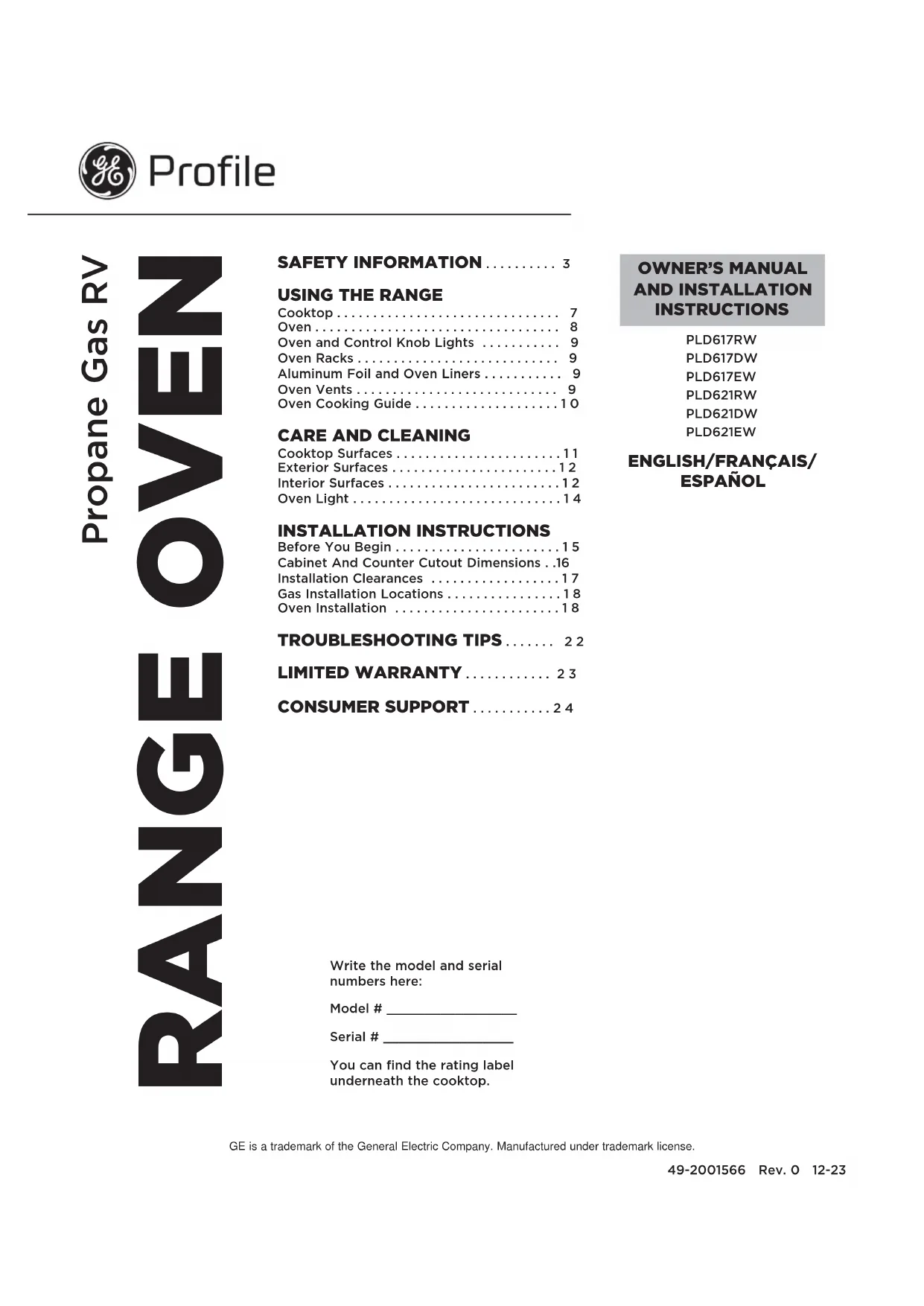 SOUTIEN AU CONSOMMATEUR ..........24 GE est une marque de commerce de General Electric Company. Fabriqué sous licence de marque. PLD617RW PLD617DW PLD617EW PLD621RW PLD621DW PLD621EW FRANÇAIS2 49-2001566 Rev. 0 NOUS VOUS REMERCIONS D’INTÉGRER GE APPLIANCES À VOTRE VÉHICULE RÉCRÉATIF. Que vous ayez grandi avec des électroménagers GE Appliances ou qu’il s’agisse de votre première acquisition, nous sommes heureux de vous accueillir dans notre famille. Nous sommes fiers du savoir-faire, de l’innovation et du design qui constituent chaque électroménager GE, et nous pensons que vous le serez aussi. Nous vous rappelons que l’enregistrement de votre électroménager vous assure de recevoir des renseignements importants sur le produit et la garantie lorsque vous en avez besoin. Enregistrez votre électroménager GE en ligne dès maintenant. Des sites Web et des numéros de téléphone utiles figurent dans la section Soutien au consommateur de ce manuel d’utilisation.49-2001566 Rev. 0 3