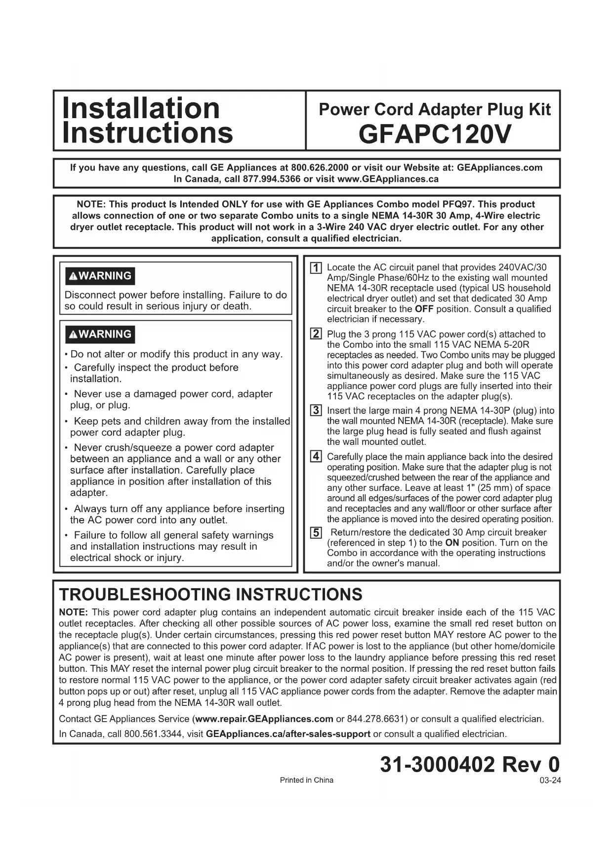 REMARQUE : &HWWH ¿FKH G¶DGDSWDWLRQ GX FRUGRQ G¶DOLPHQWDWLRQ FRQWLHQW XQ GLVMRQFWHXU DXWRPDWLTXH LQGpSHQGDQW j O¶LQWpULHXU GH FKDFXQHGHVSULVHVGH9&$$SUqVDYRLUYpUL¿pWRXWHVOHVDXWUHVVRXUFHVSRVVLEOHVGHSHUWHGDOLPHQWDWLRQHQFRXUDQWDOWHUQDWLI H[DPLQH]OHSHWLWERXWRQURXJHGHUpLQLWLDOLVDWLRQVLWXpVXUODRXOHV¿FKHVGHODSULVH'DQVFHUWDLQHVFLUFRQVWDQFHVOHIDLWGDSSX\HU sur ce bouton rouge de réinitialisation de l'alimentation PEUT rétablir l'alimentation en courant alternatif de l'appareil ou des appareils connectés à cet adaptateur de cordon d'alimentation. Si l'appareil n'est plus alimenté en courant alternatif (mais que le courant alternatif de la maison ou du domicile est toujours actif), attendez au moins une minute après la coupure de courant de l'appareil avant GDSSX\HUVXUFHERXWRQURXJHGHUpLQLWLDOLVDWLRQ&HFL3(87UpLQLWLDOLVHUOHGLVMRQFWHXULQWHUQHGHOD¿FKHGDOLPHQWDWLRQHQSRVLWLRQ normale. Si le fait d'appuyer sur le bouton rouge de réinitialisation ne permet pas de rétablir l'alimentation normale de 115 VCA de l'appareil, ou si le disjoncteur de sécurité de l'adaptateur de cordon d'alimentation s'active à nouveau (le bouton rouge se relève ou VpWHLQWDSUqVODUpLQLWLDOLVDWLRQGpEUDQFKH]WRXVOHVFRUGRQVGDOLPHQWDWLRQGH9&$GHODSSDUHLOGHODGDSWDWHXU5HWLUH]OD¿FKH principale à 4 broches de l’adaptateur de la prise murale NEMA 14-30R. Composez le 800 561-3344, visitez GEAppliances.ca/after-sales-support ou consultez un électricien qualifié. Imprimé en Chine 31-3000402 Rev 0 03-24 AVERTISSEMENT AVERTISSEMENTSi tiene alguna pregunta, llame a GE Appliances al 800.626.2000 o visite nuestro sitio Web en: GEAppliances.com.Desconecte la energía eléctrica antes de instalar. De lo contrario, podrían producirse lesiones graves o la muerte. Instrucciones de instalación
